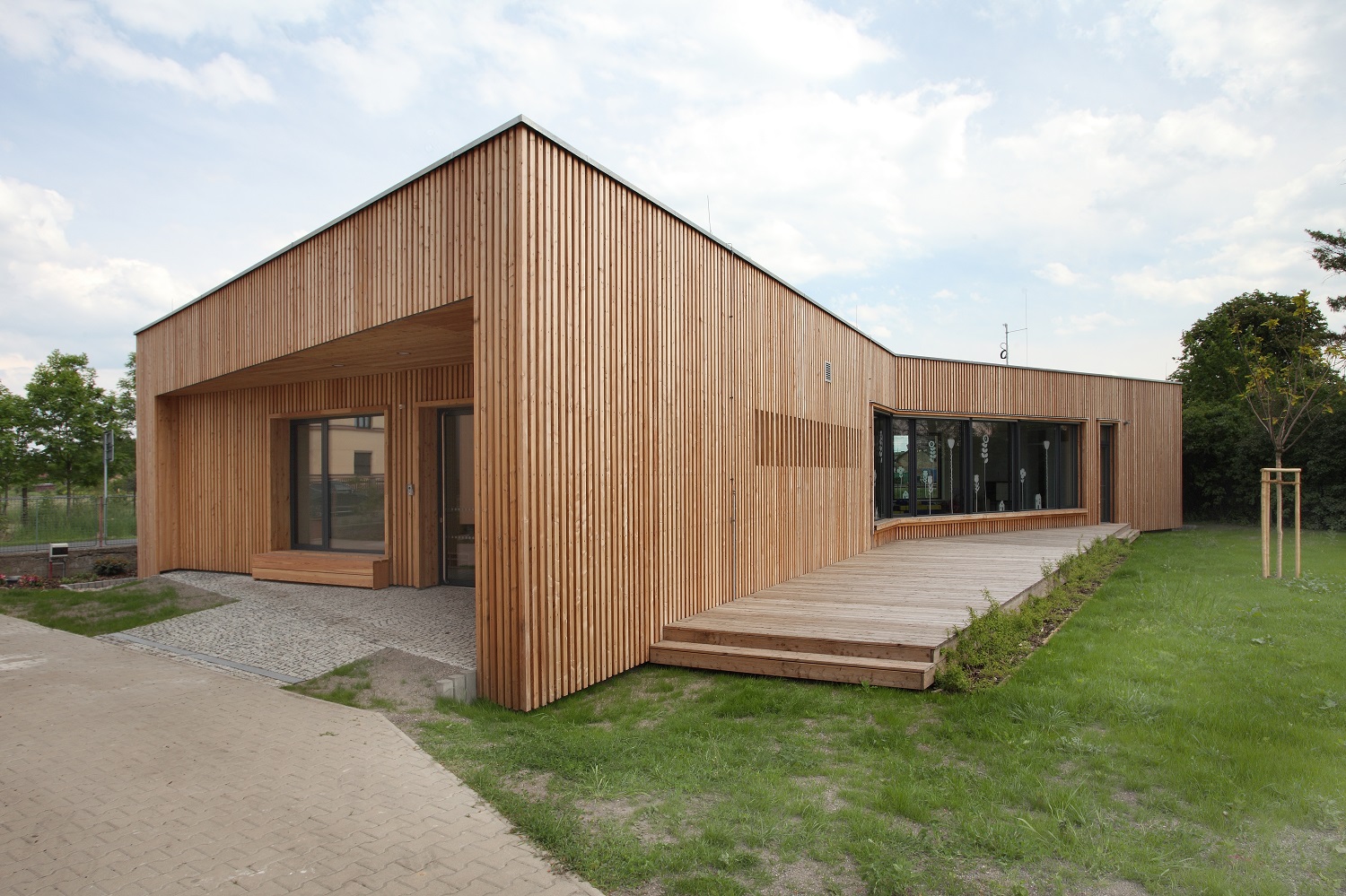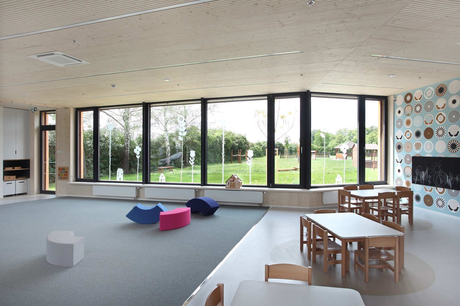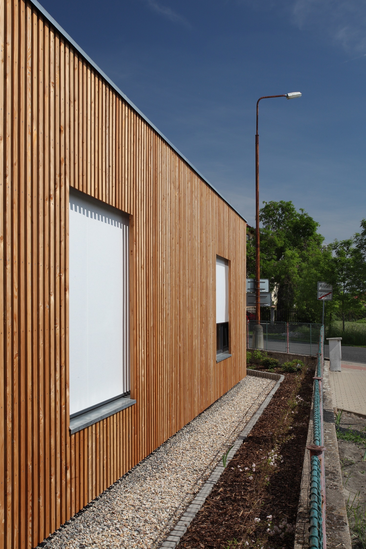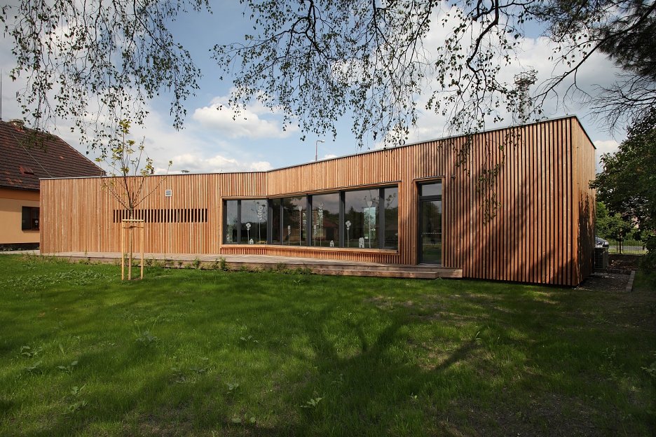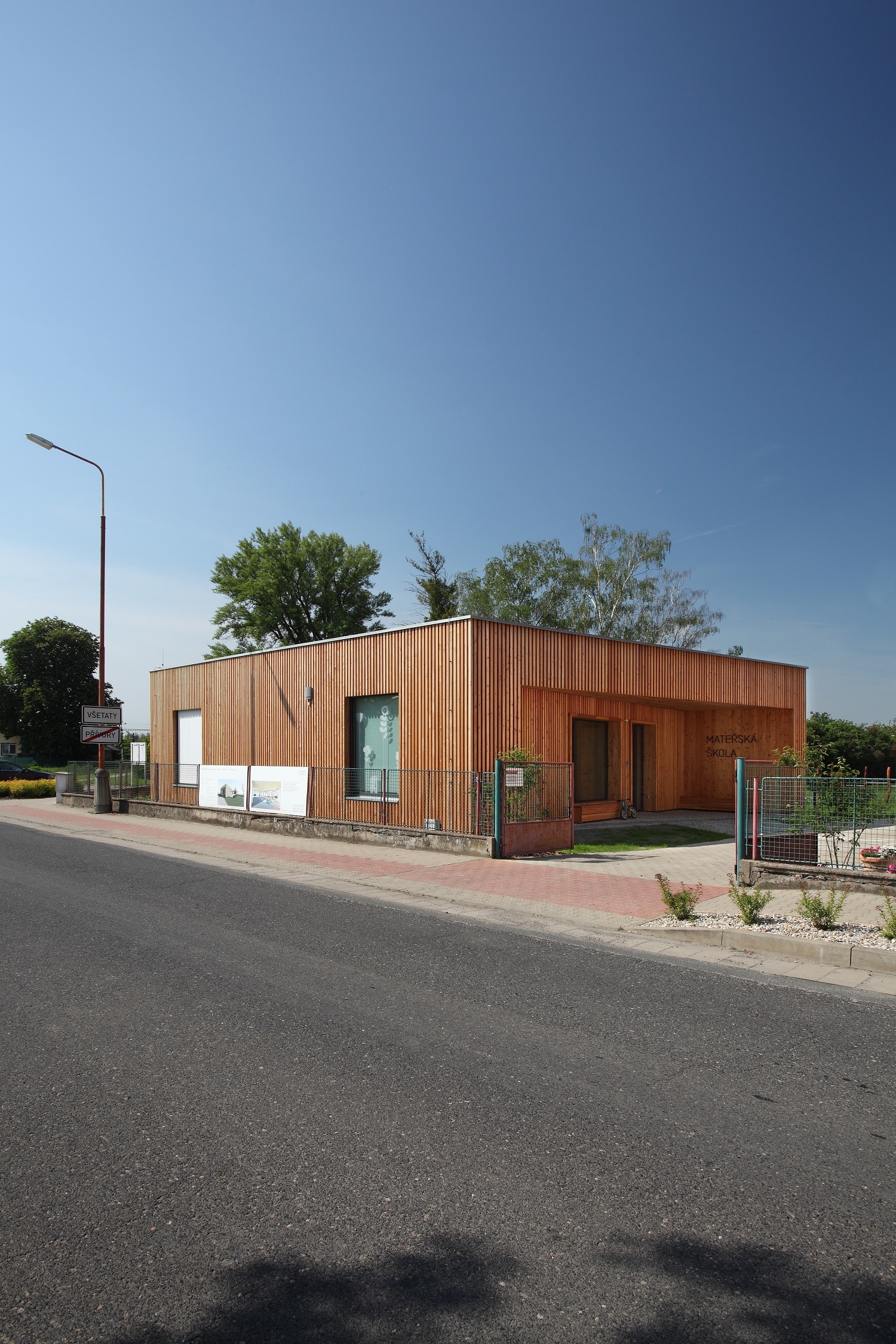 Novostavba jednotriedky pre malú obec v okrese Mělník. Objekt dopĺňa budovu materskej školy, s ktorou zdieľa spoločný pozemok. Návrh reaguje na zalomený tvar parcely. Budova oddeľuje záhradu od cesty, ktorá prebieha pozdĺž jej východnej strany. Vstupná fasáda sa obracia k existujúcemu objektu a vytvára prirodzený rozptylový priestor pre rodičov s deťmi. Denná miestnosť je naopak, vďaka zalomeniu západnej fasády, chránená pred ruchom vstupného priestoru. Presklená stena so zníženým parapetom zabezpečuje optický kontakt so záhradou aj pre najmenších užívateľov.