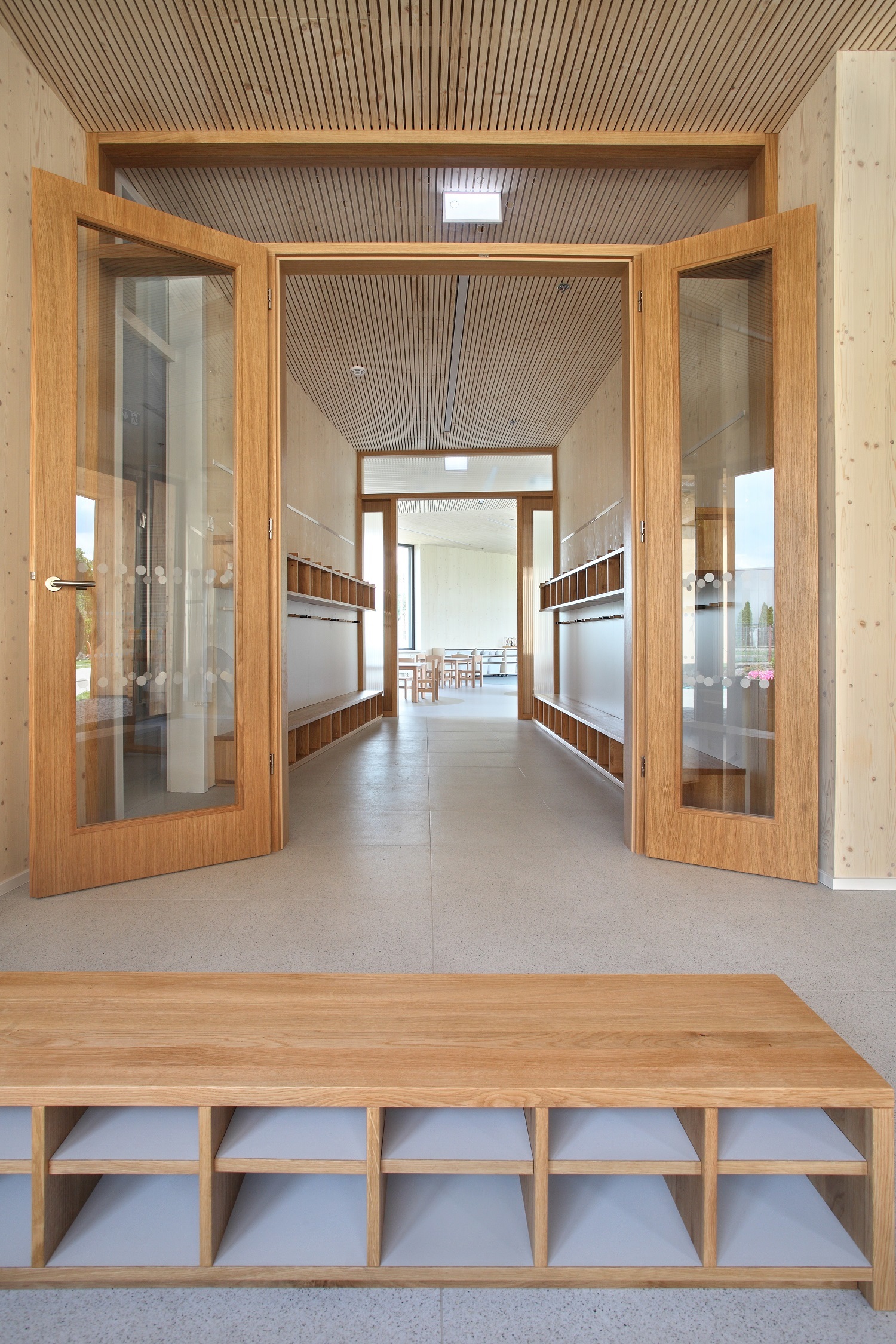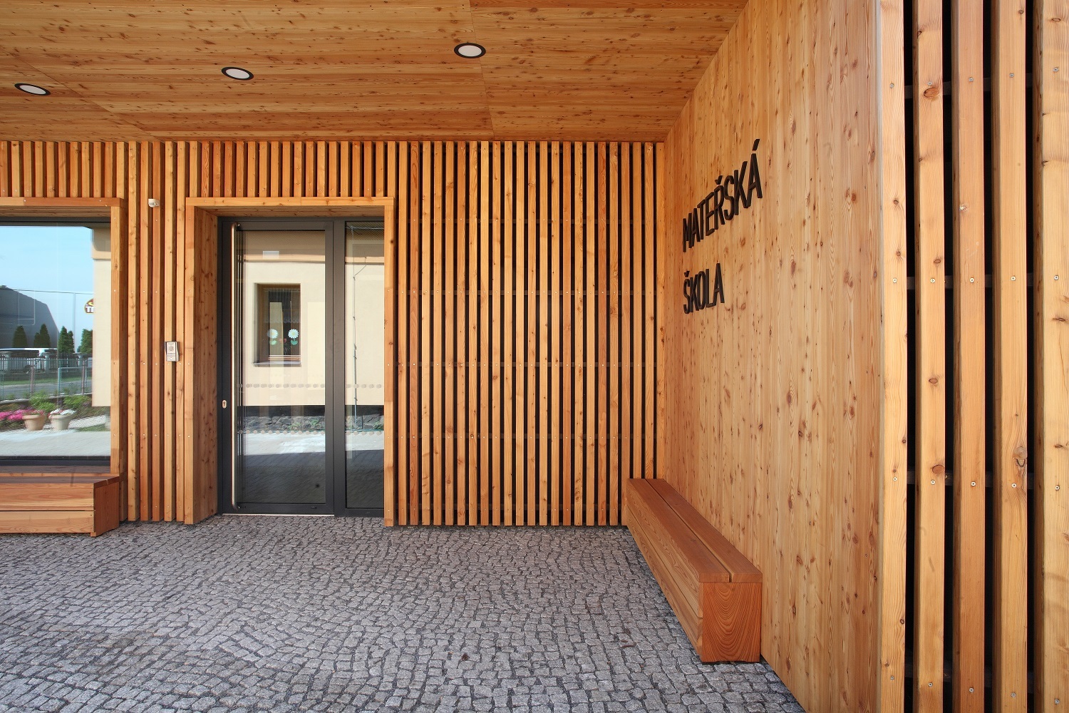 Zastrešený vstupný priestor poskytuje ochranu pred nepriazňou počasia i letným slnkom. Zabezpečuje dostatok miesta pre sedenie. Veľké okno umožňuje deťom kontakt s kamarátmi, ktorí sú už v šatni.