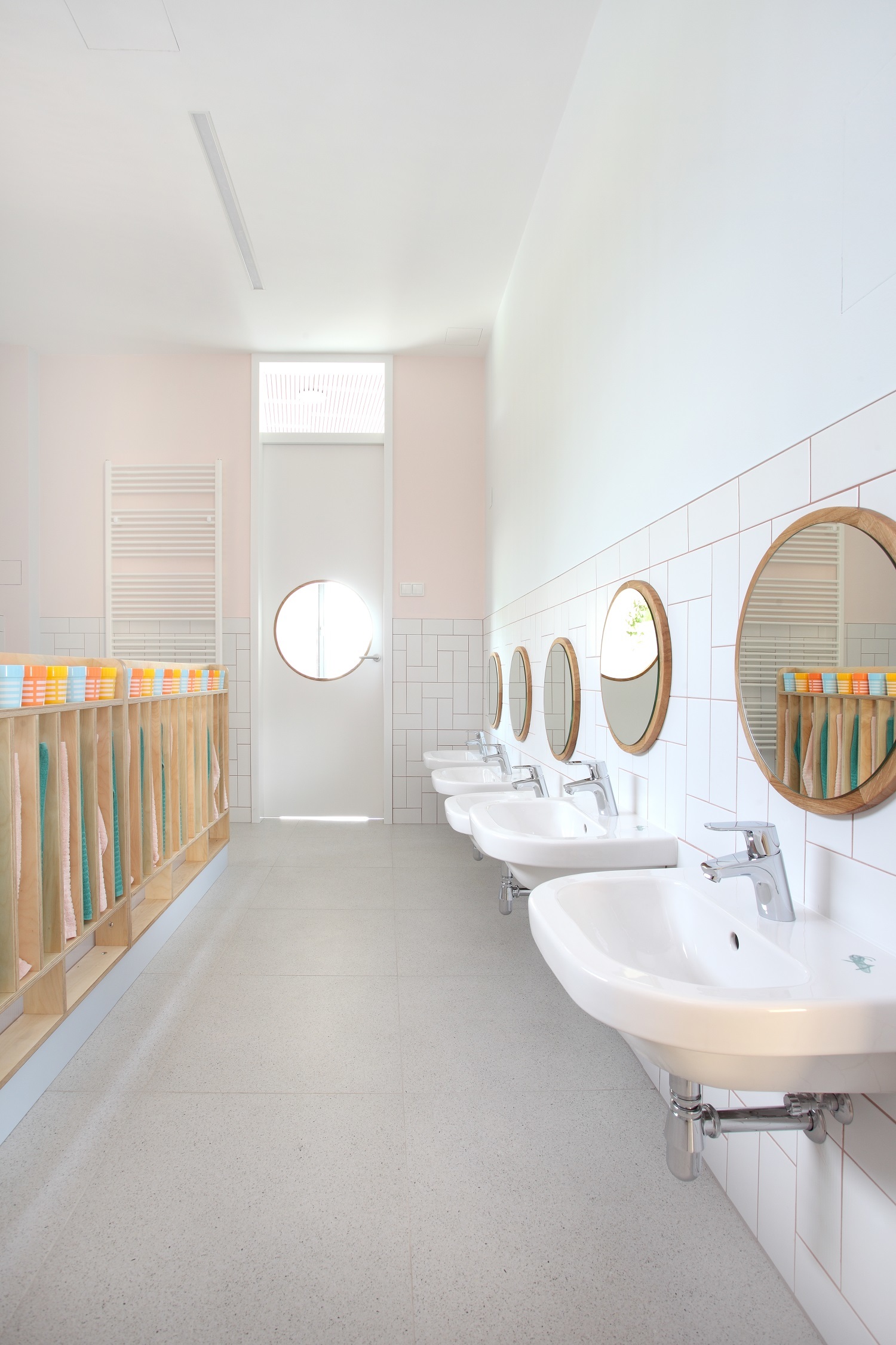 “Dispoziční řešení vzešlo nejen z požadavků vyhlášky, ale i z rozhovorů a diskuzí s učitelkami všetatské mateřské školy. Celkově je založen na přehlednosti, vizuálním propojení prostorů, minimalizaci chodeb a využití podlažní plochy pro pohyb dětí,” vysvetľujú architekti. Kancelária so šatňou učiteliek je umiestnená tak, aby priamo nadväzovala na priestory, kde sa prezúvajú a prezliekajú deti. Prípravovňa obedov a desiat je prístupná zo "špinavých priestorov" školy, aby sa služba privážajúca obed nemusela prezúvať.