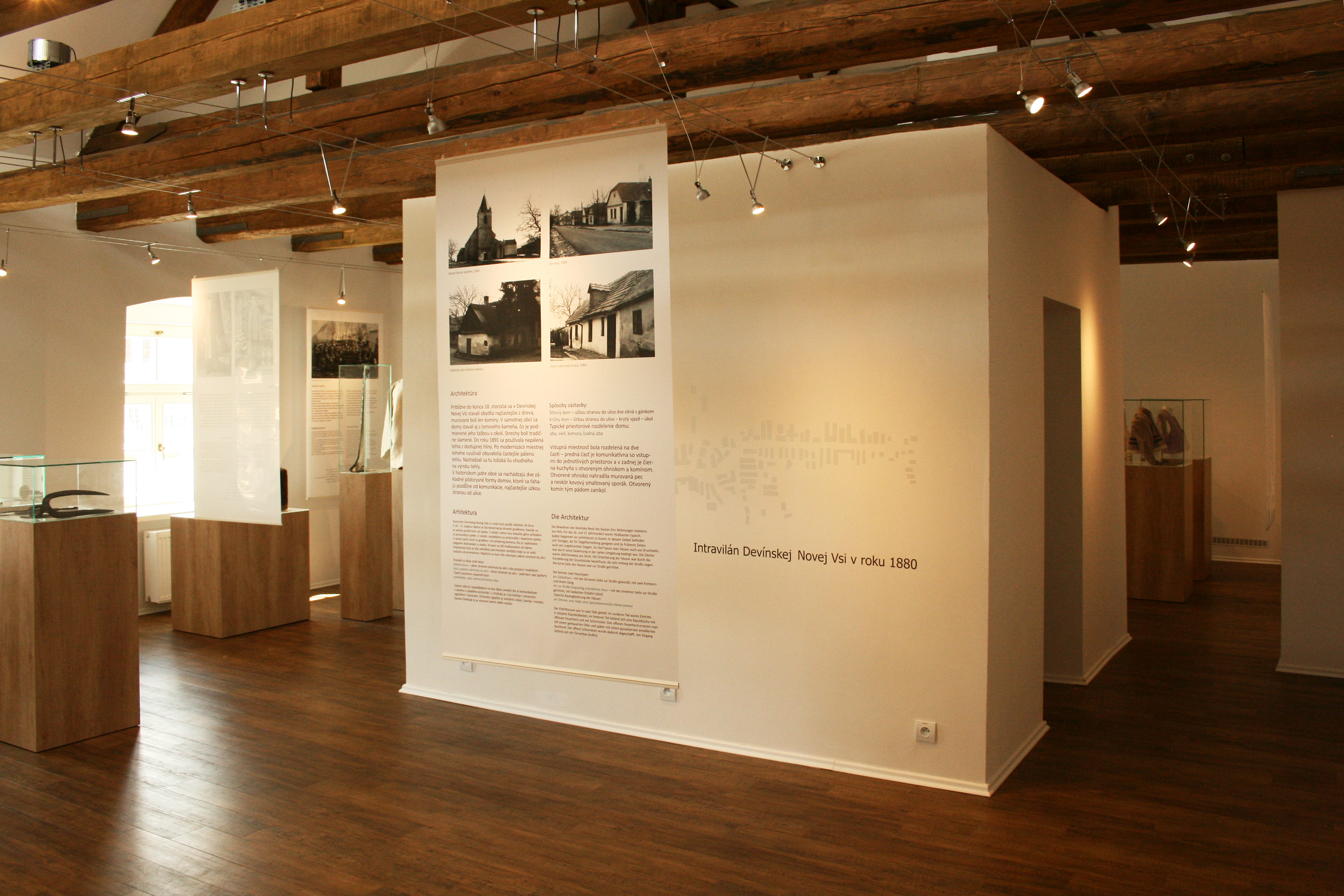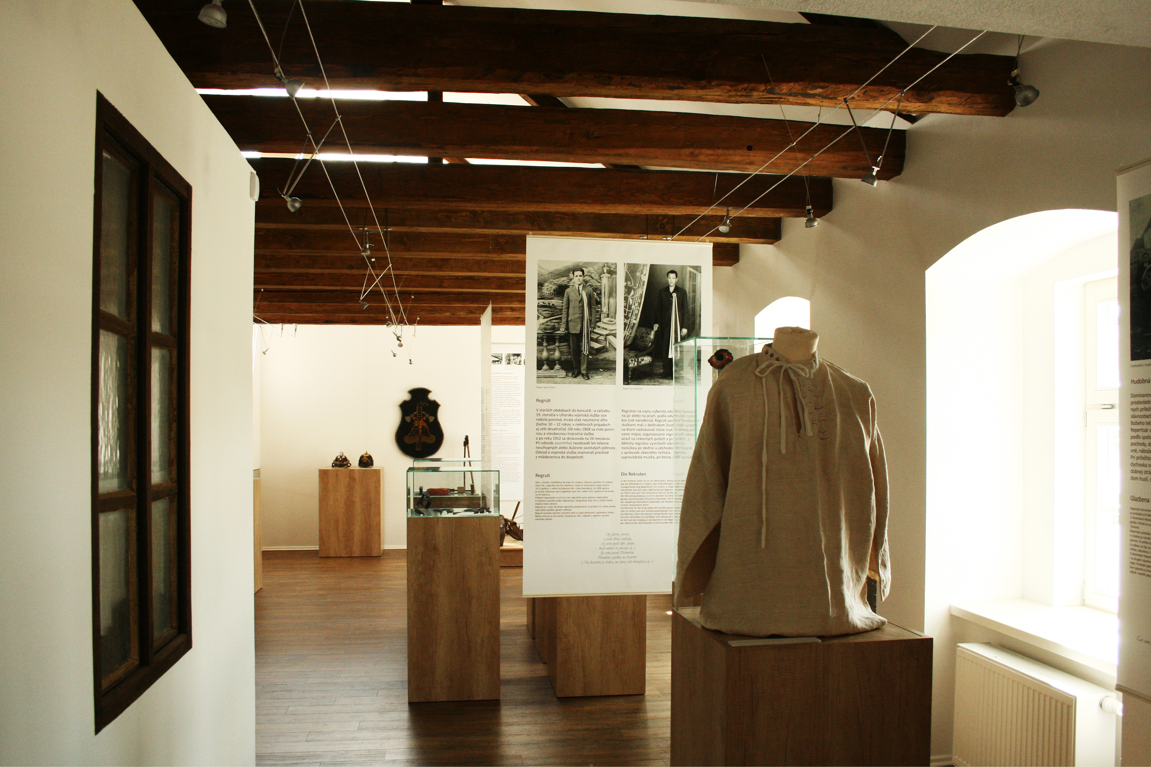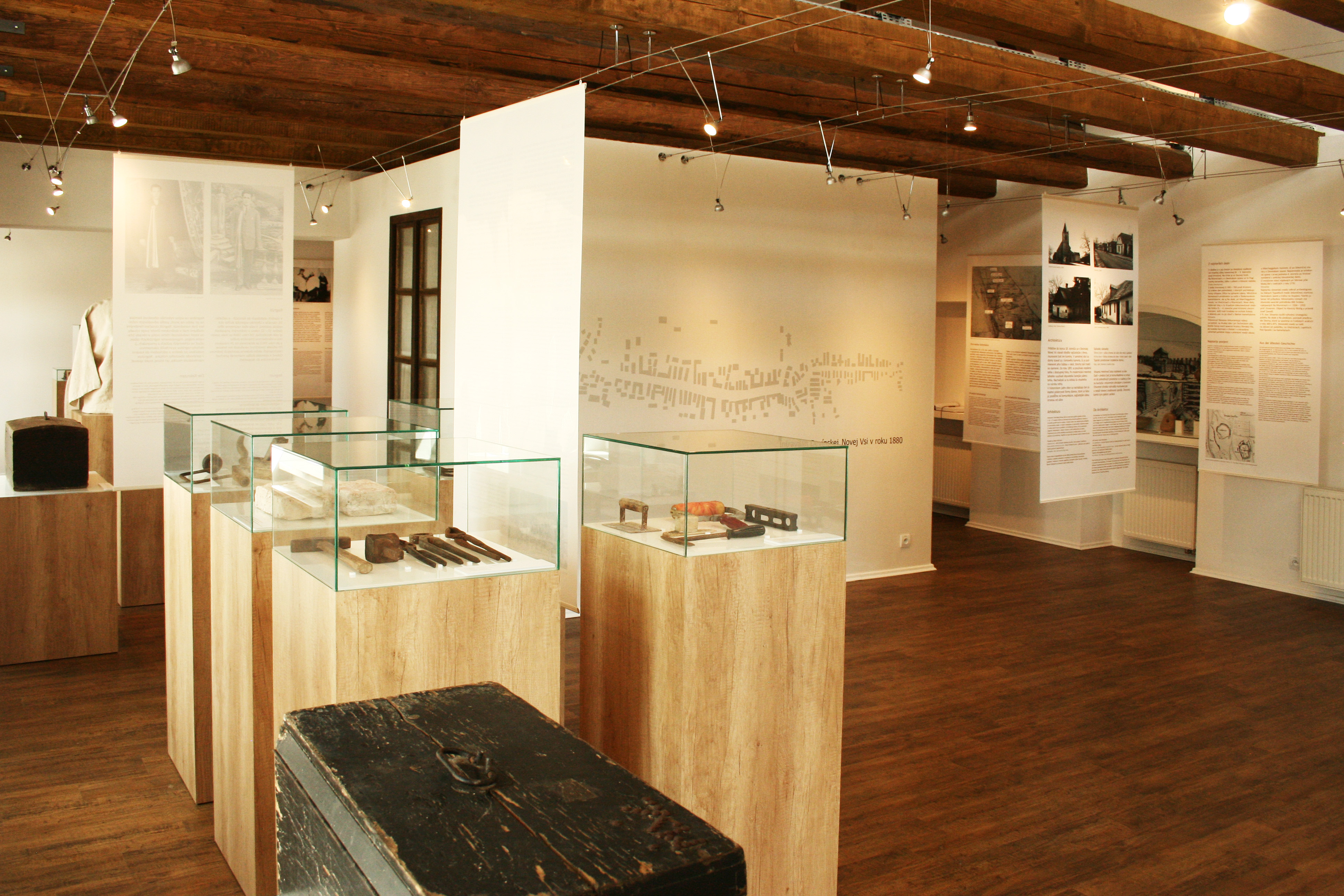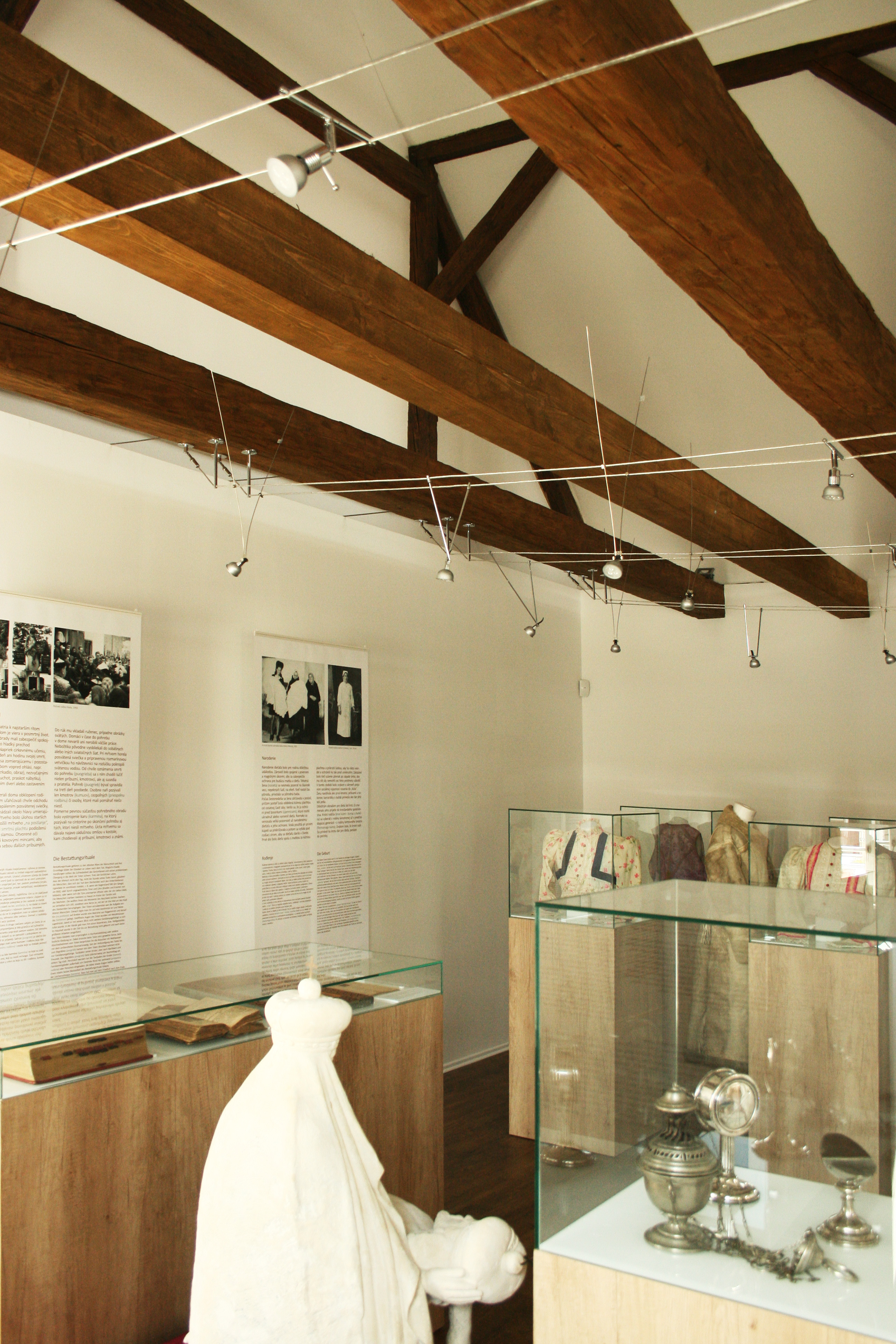 Pôvodná interiérová dispozícia objektu bola vyčistenánod všetkých rušivých prvkov, čím sa získal ucelený výstavný priestor s ostrovným zázemím. Novonavrhovaná typológia sa tak výrazne priblížila k pôvodnému radeniu vnútorných priestorov v starších objektoch miestnej ľudovej architektúry založená na jednoduchej priestorovej kompozícii: sieň - výstavná plocha, izba - projekcia, komora- hyg. zázemie. Otvorením stropného záklopu sa podarilo dosiahnúť pompéznosť, vhodnu práve pre daný účel výstavníctva a doplnkového presvetlenia priestoru. Delia ho len priznané horizontálne nosné trámy krovu, ktoré zároveň nesú lankový systém osvetlenia a závesný systém výstavných panelov. Priestoru dominuje biela kocka - expozícia tradičnej ľudovej izby. Celý priestor bude zatienený bielymi difúznymi (textilnými) tienidlami, ktoré zabránia priamemu osvetleniu exponátov.Výstavný priestor je plošne obmedzený. Preto sa zvolil ľahko modifikovateľný výstavný systém z prenosných podstavcov, ktoré zároveň svojím priestorovým radením a usporiadaním budú symbolizovať základné témy zadané kurátorským scenárom. Od vstupu do expozície bude návštevník vedený jednotlivými sekciami v predpísanej trase alebo bude len tak intuitívne plynúť jednotlivými zostavami - symbolmi výstavy.
