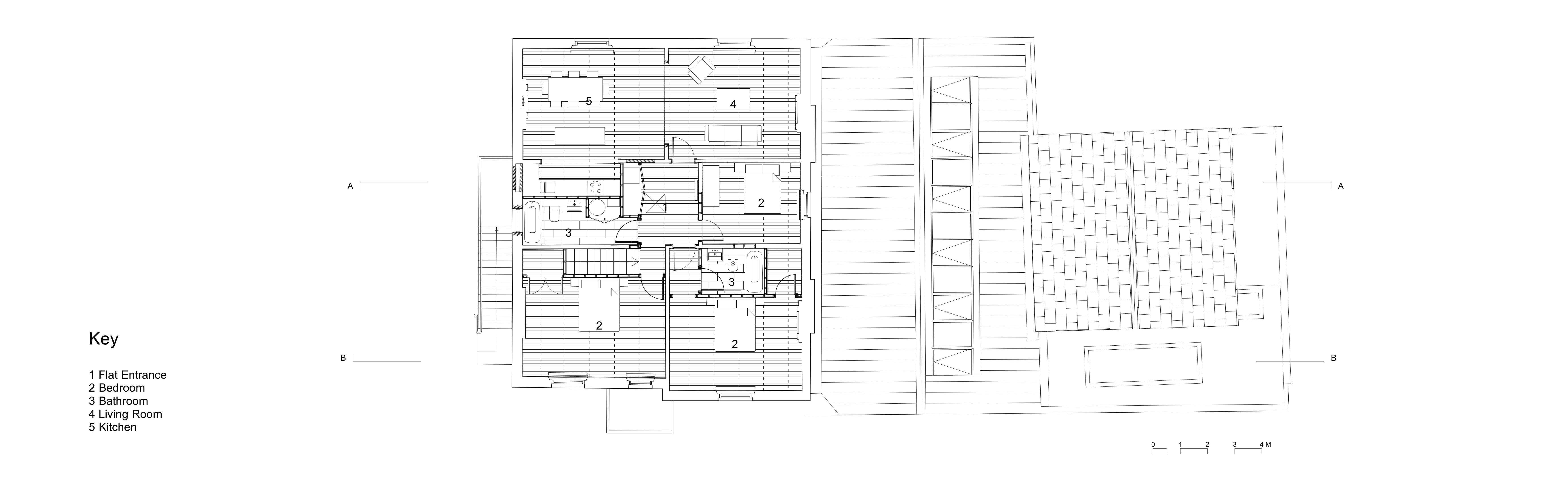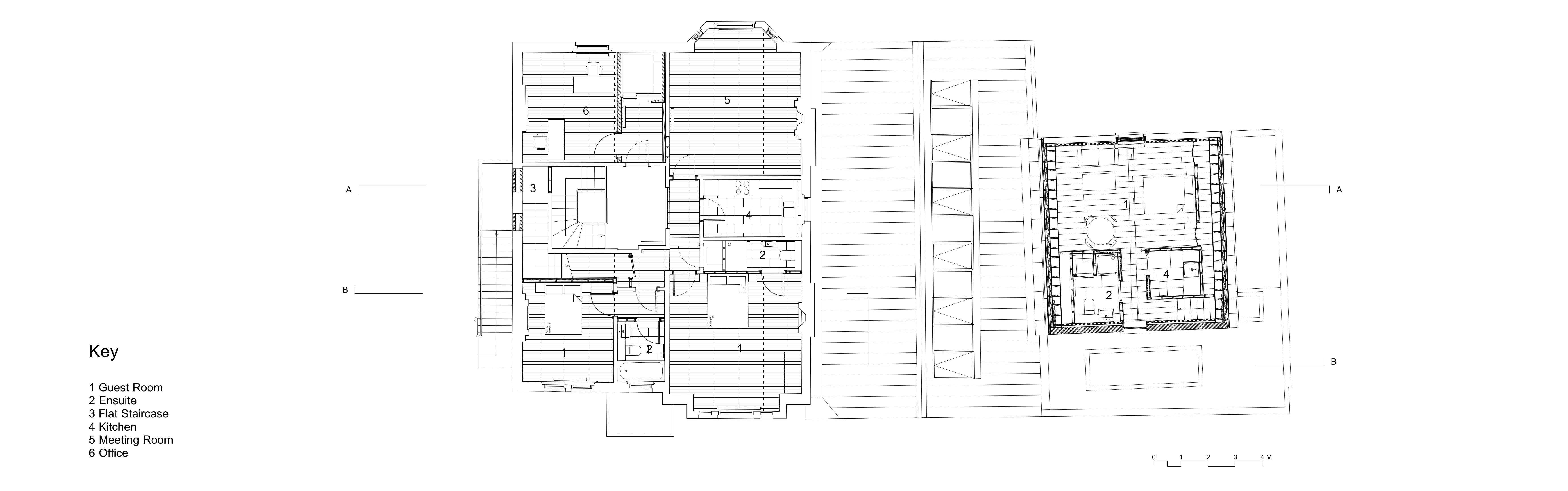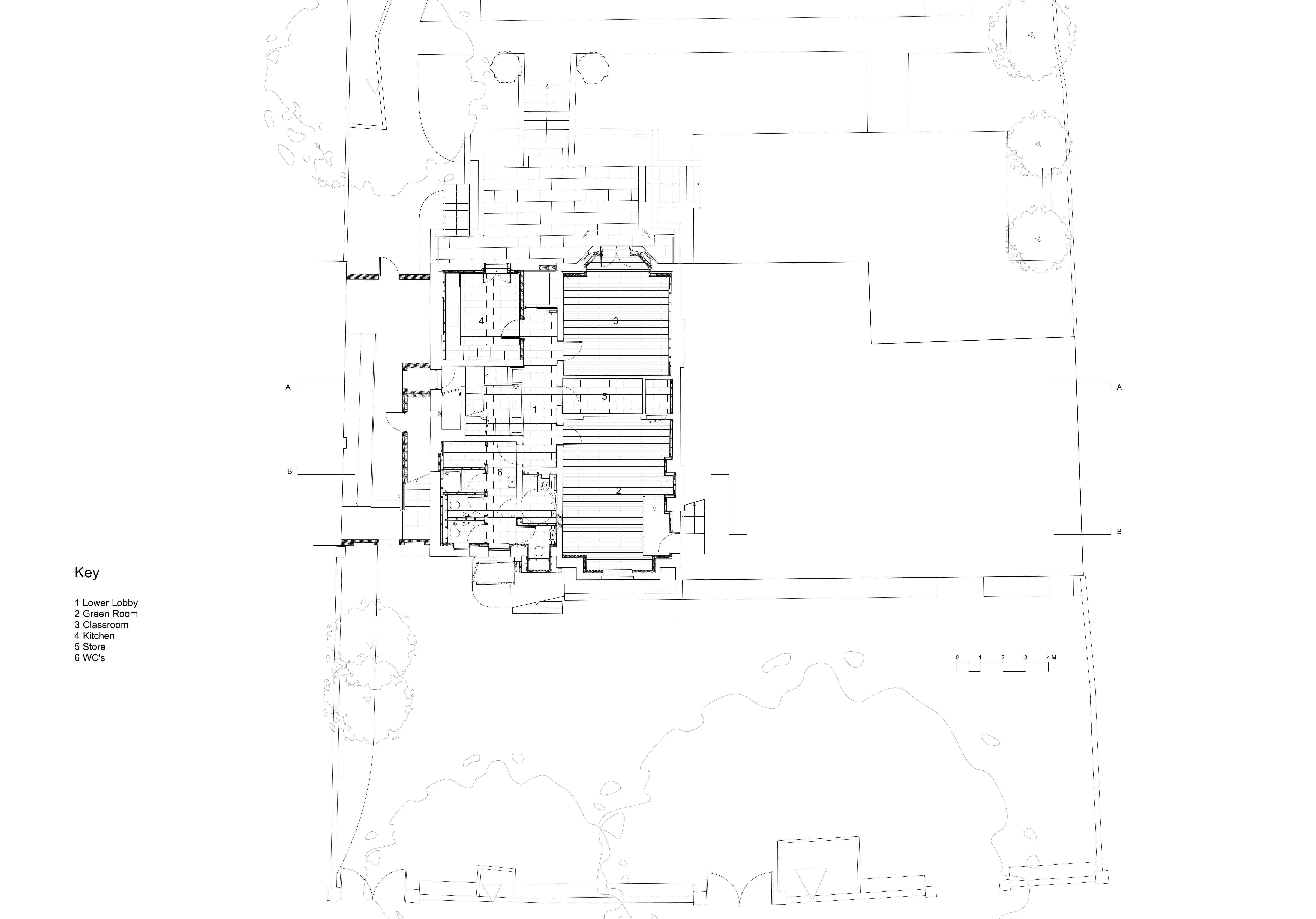 Jedna z bývalých učební slúži ako prednášková miestnosť a zároveň prepája ubytovaciu časť so spoločenskými priestormi na prízemí.