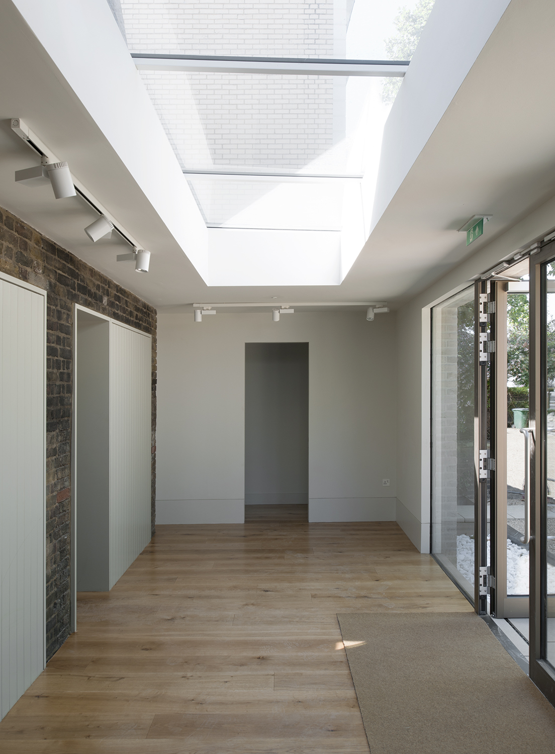 Pôvodná tehlová stena sa stala dominantným prvkom v interiéri. Vstupný priestor bol vybudovaný nanovo.