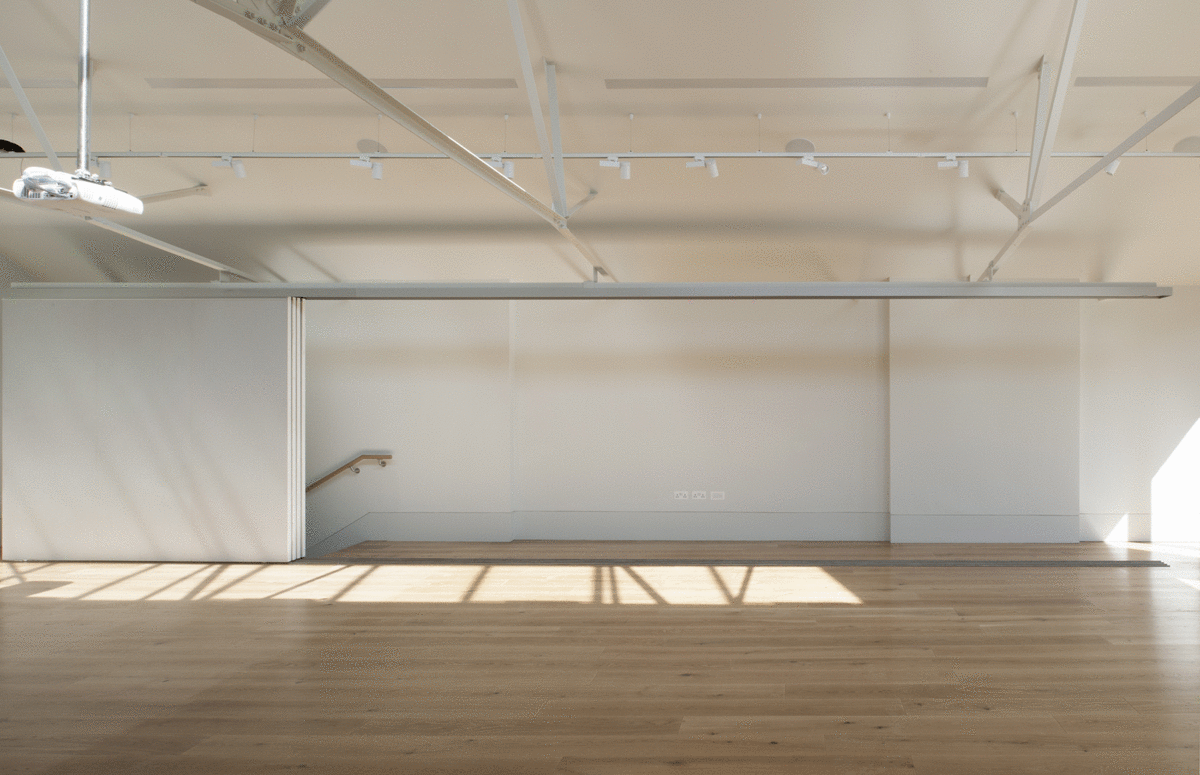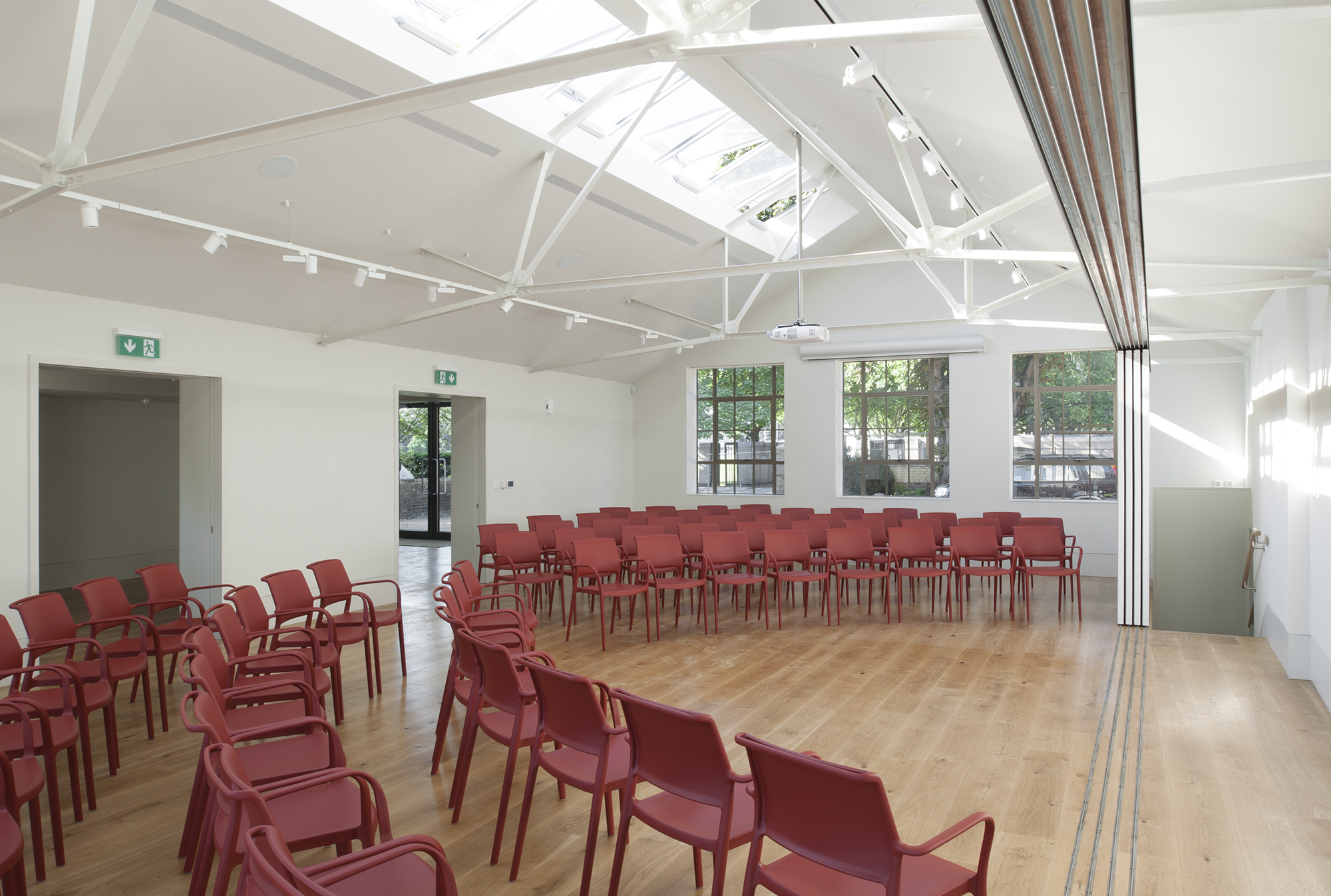 Posuvná stena oddeľuje sálu od technického zázemia, umožňuje skladovanie stoličiek a slúži aj ako výstavná plocha.