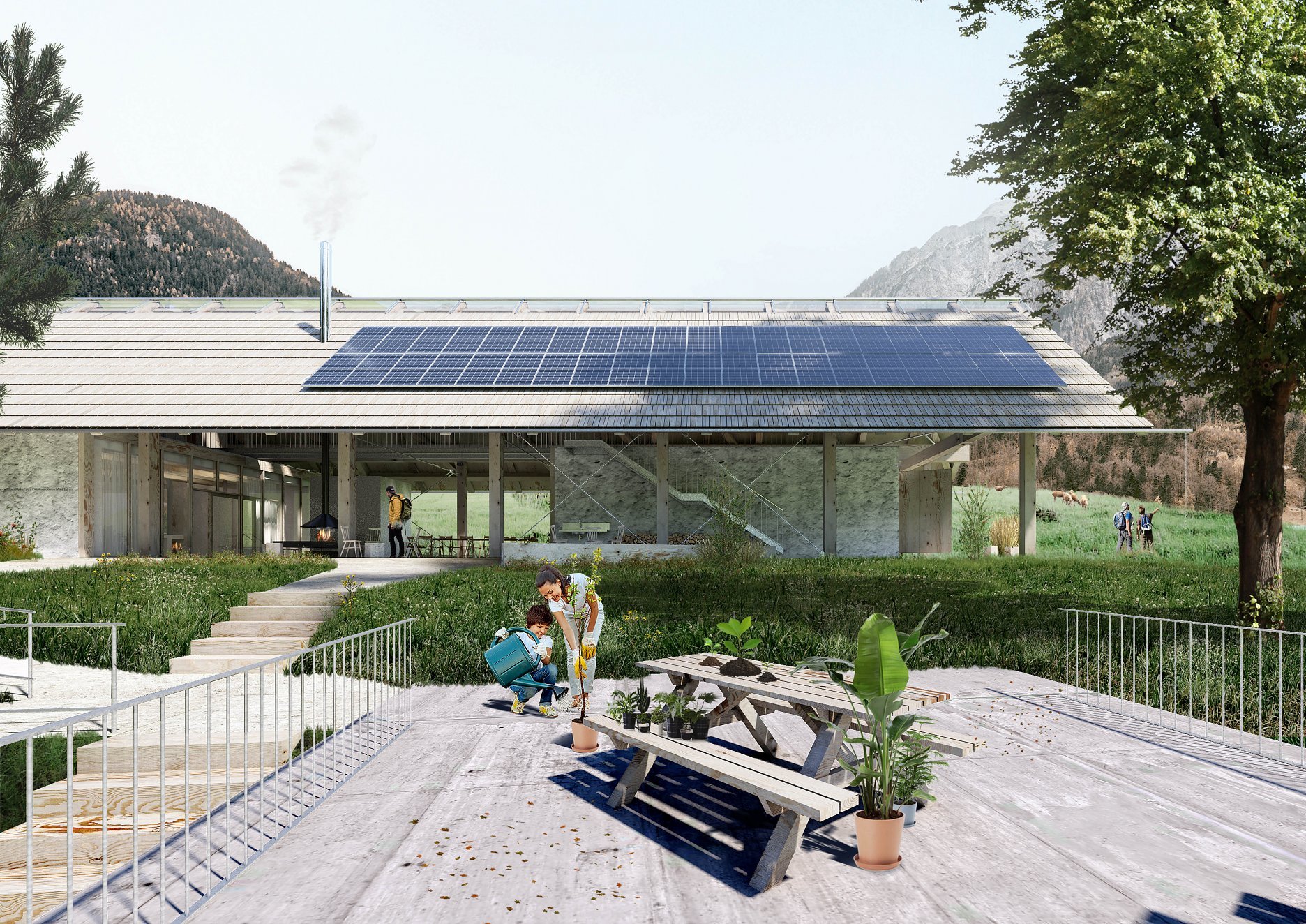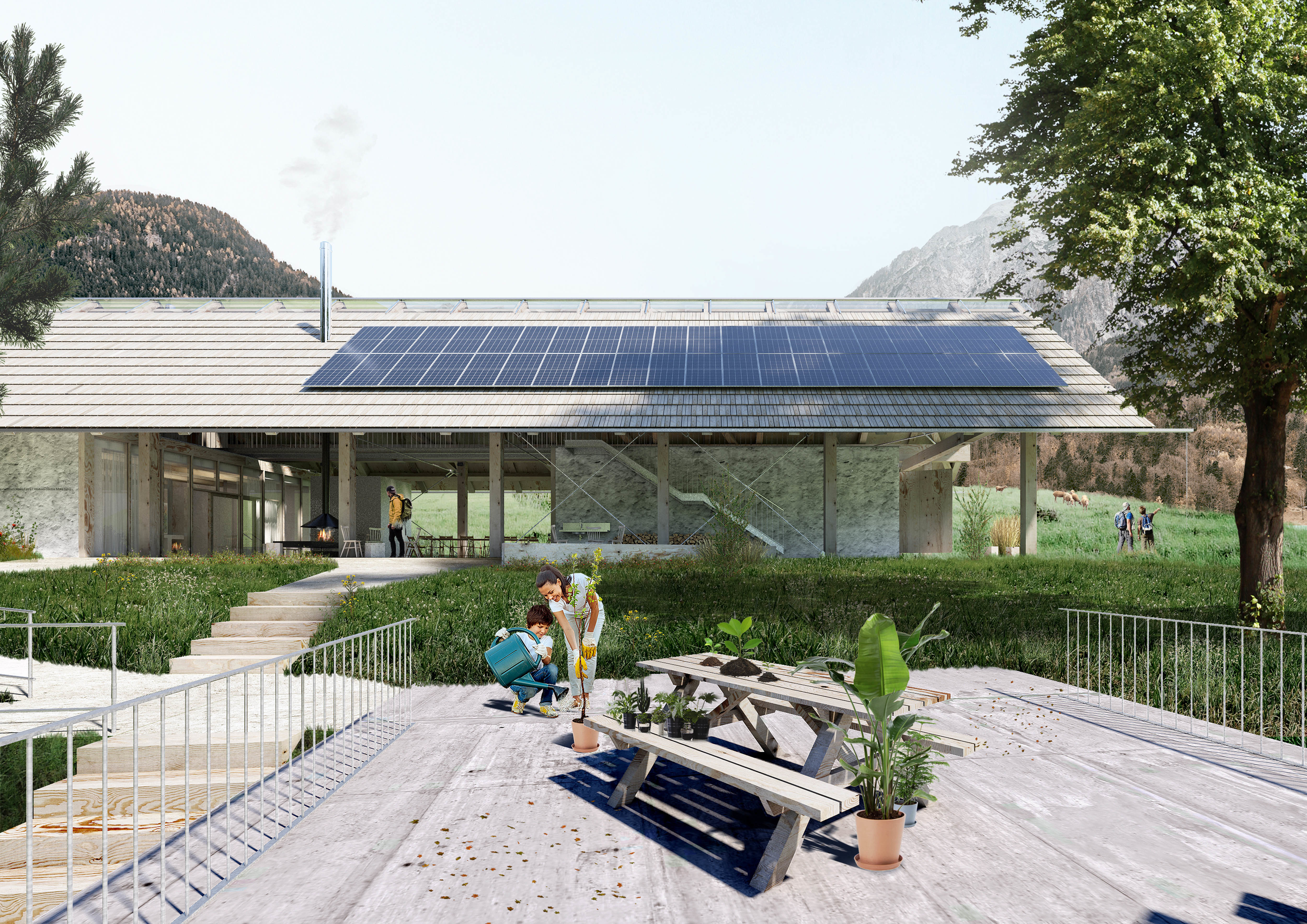 “V prípade dvoch hlavných objektov tvoriacich samotné návštevnícke centrum ponechávame vyše 50% obvodového muriva do výšky až 2,5 metra, čím zároveň znižujeme spotrebu použitého materiálu. Tieto objekty zmenšia svoj objem a získajú novú strešnú rovinu - v oboch prípadoch pochôdznu. Následne ich prepojí nový drevený trámový strop,” popisujú návrh autori.