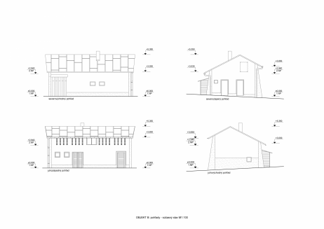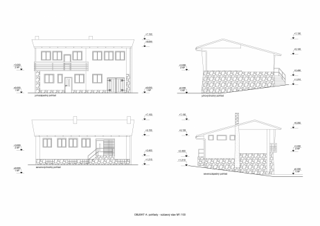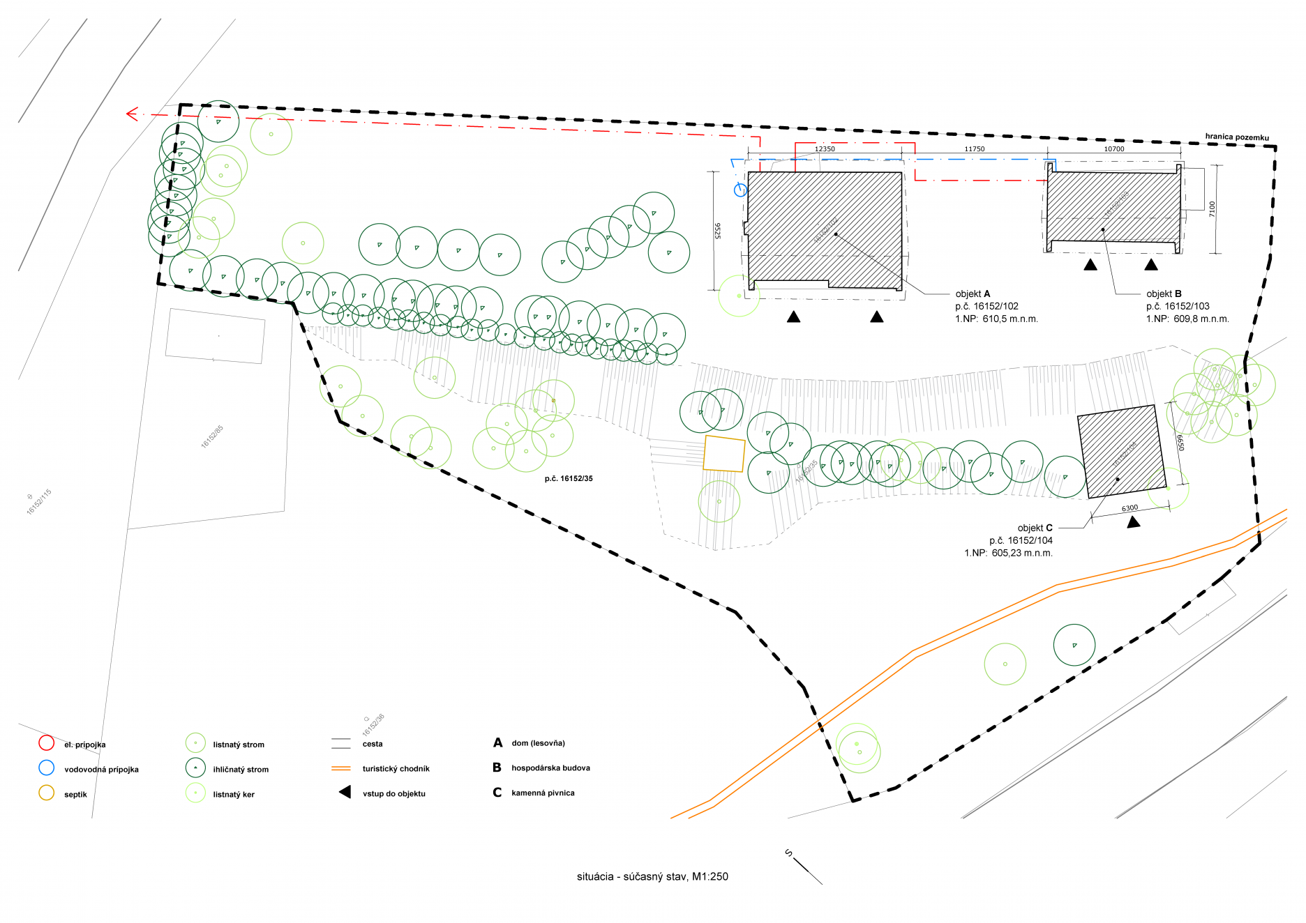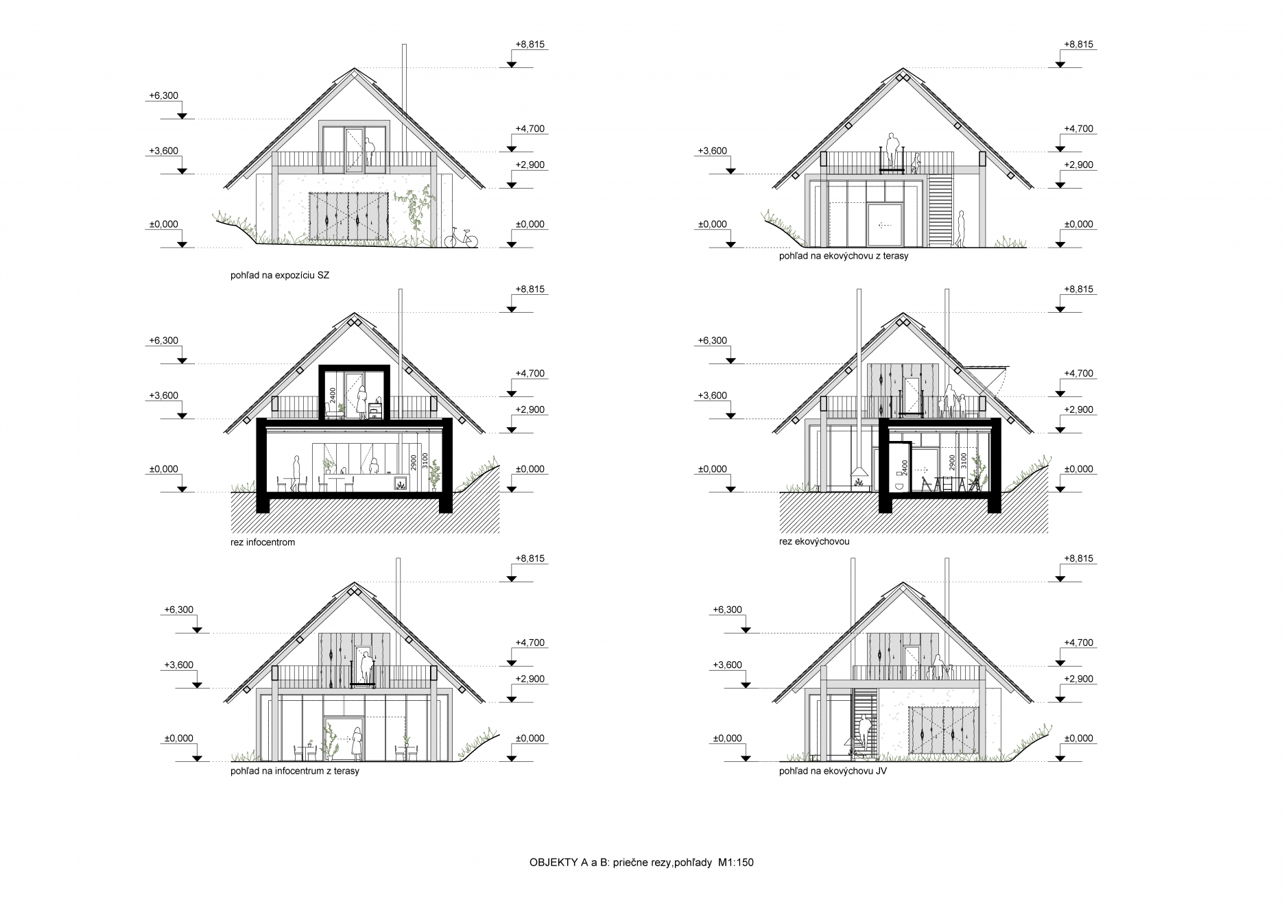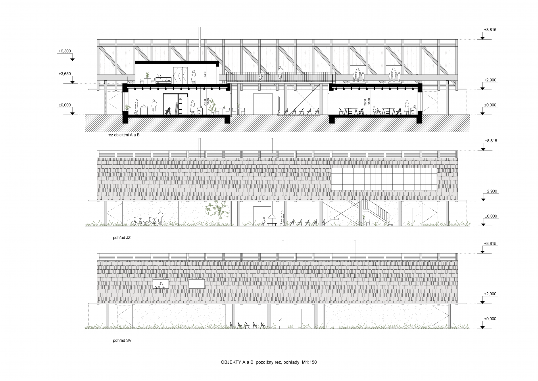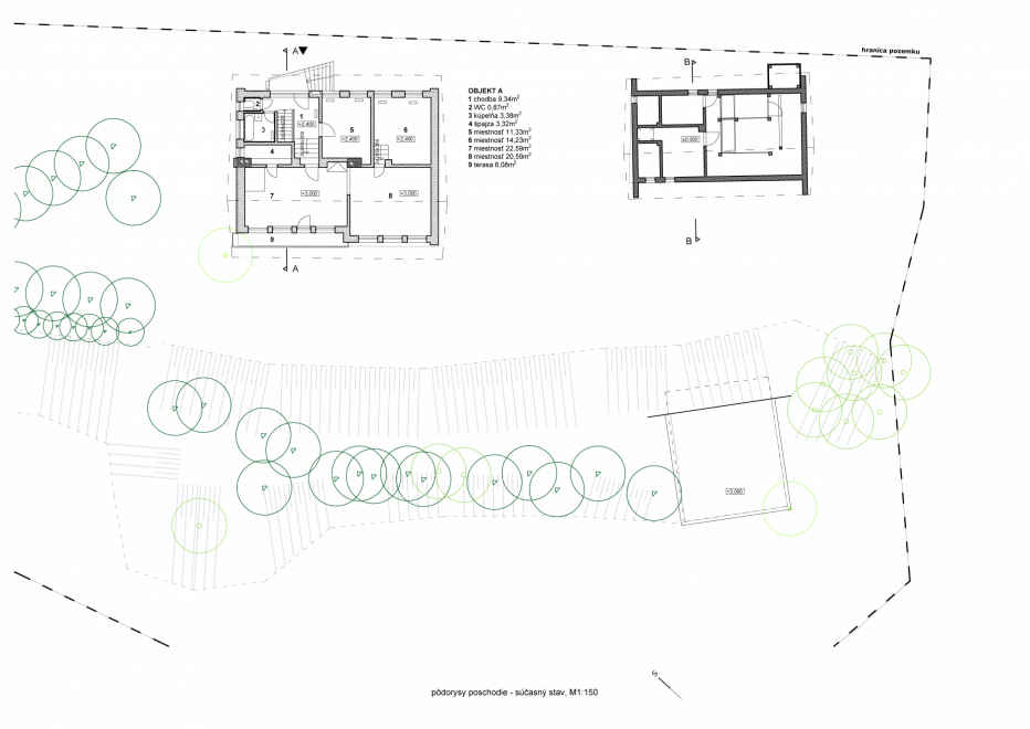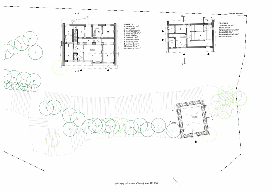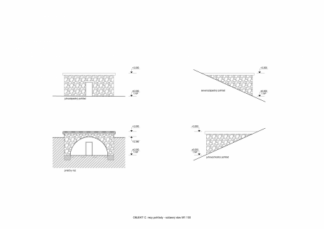 Objekty lesovne, hospodárskej budovy a pivnice - súčasný stav - pohľady a rezy: