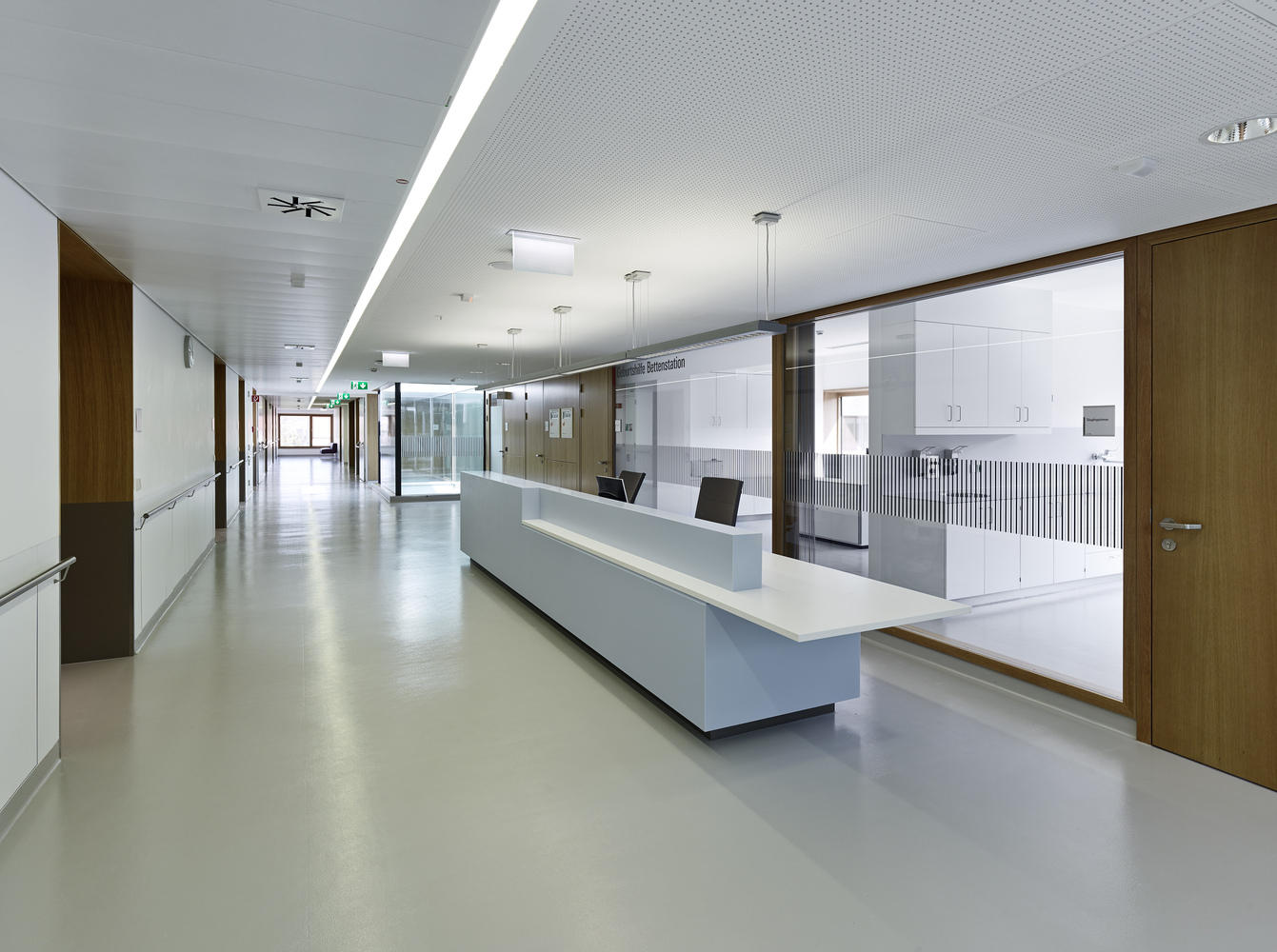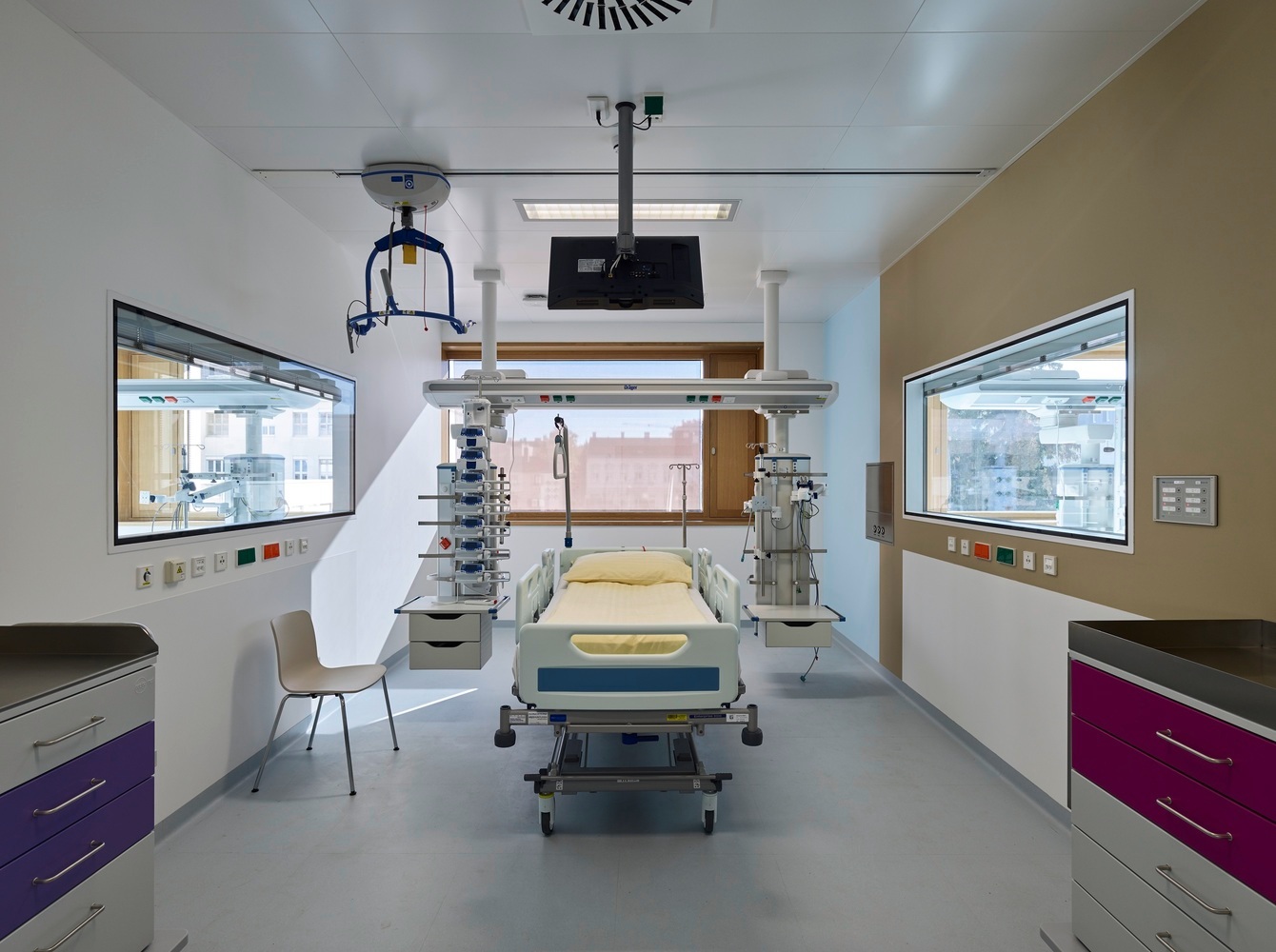 Pavilóny vzájomne prepája transparentná centrálna hala. Architekti pri návrhu kládli dôraz na prehľadnosť prevádzky a jednoduchosť orientácie návštevníkov, pacientov a personálu. Výrazný informačný systém vedie návštevníkov z otvorenej centrálnej haly do jednotlivých pavilónov. Chodby sú na každom podlaží opticky prepojené s pohľadmi do átria, čo umožňuje rýchlu orientáciu v rámci celého komplexu. Samozrejmosťou je dôraz na flexibilitu využitia priestoru s minimom fixných konštrukcií (potrebu ešte zvýraznila “doba covidová”) a osobitá pozornosť venovaná štruktúre spoločných priestorov. Podporujú interakciu pacientov a vytvárajú komfortné zázemie pre personál.