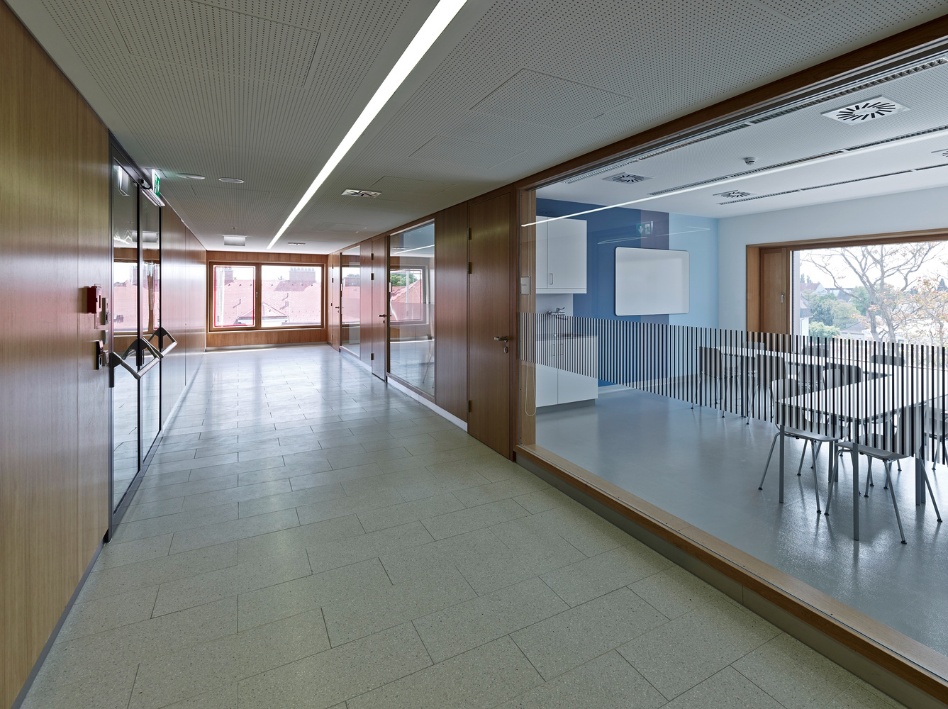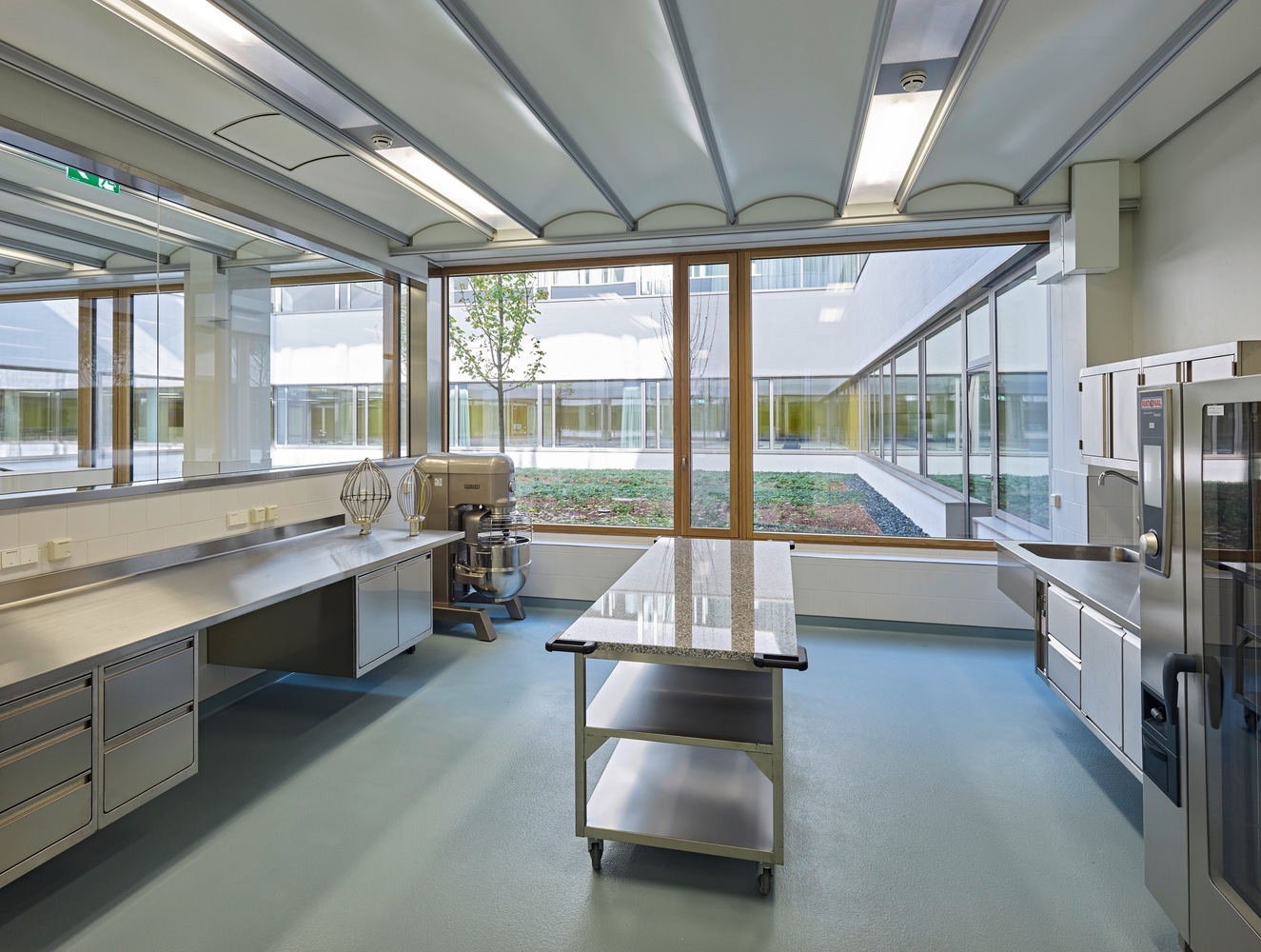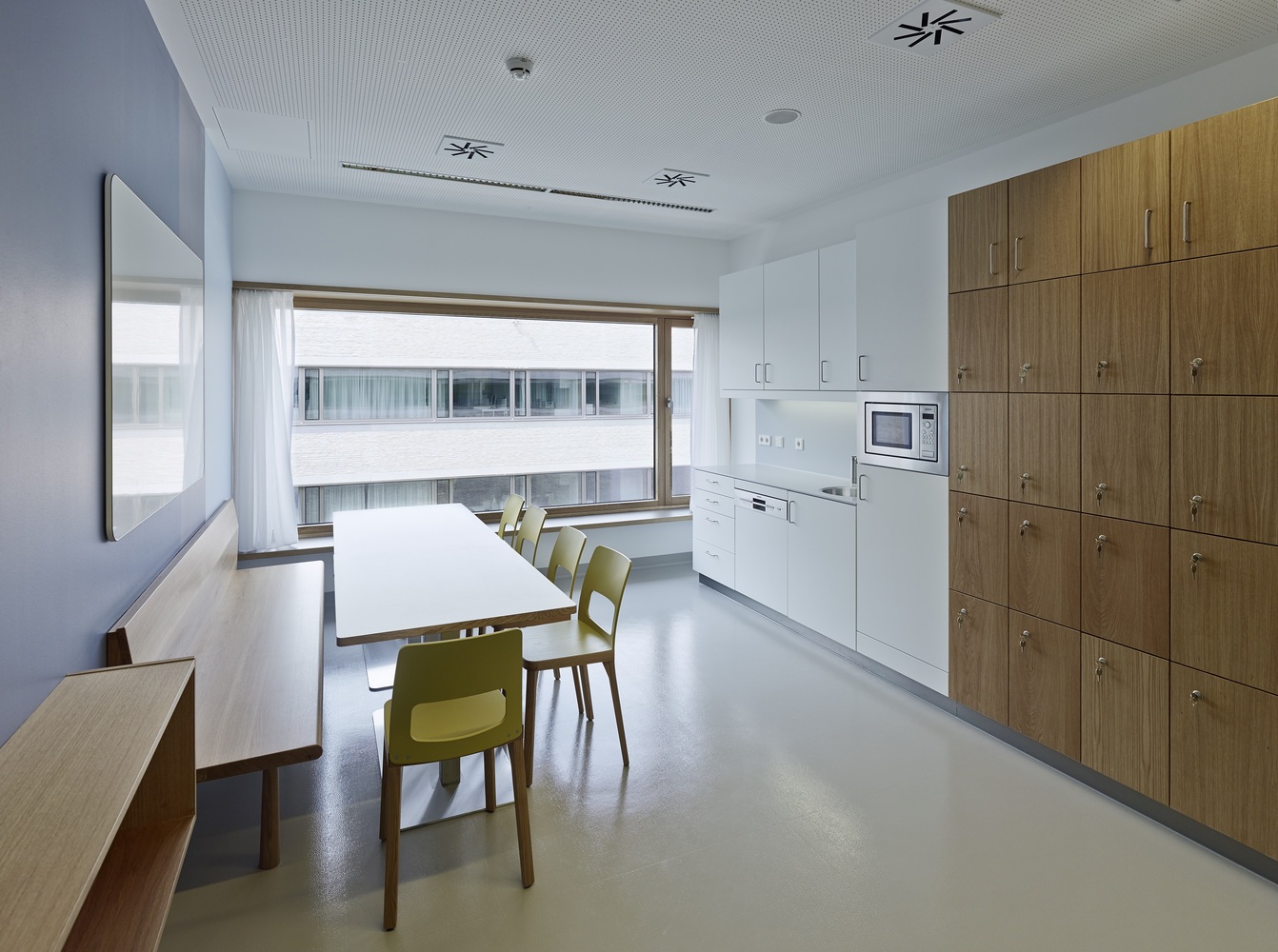 Dôraz autorov na kvalitu vnútorného prostredia podporuje materiálové riešenie. Tvrdé hygienické povrchy a svetlú farebnú schému dopĺňajú prírodné materiály ako drevo, alebo kameň.