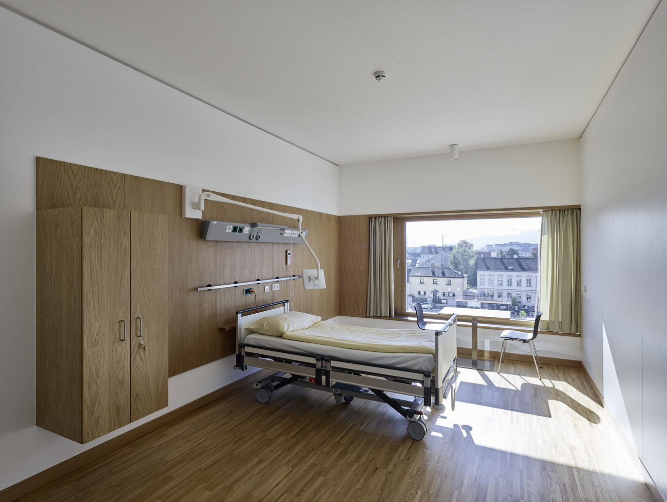 Urbanistické riešenie, ktoré člení prevádzku do vzájomne prepojených pavilónov s výškou 16 metrov sa snaží redukovať mierku novej zástavby. Nové objemy sú čiastočne ustúpené od ulice do zeleného prostredia vnútrobloku. Svet sám o sebe tvoria vnútorné átriá, do ktorých smerujú rozsiahle presklené plochy a výhľady z čakární a oddelení.
