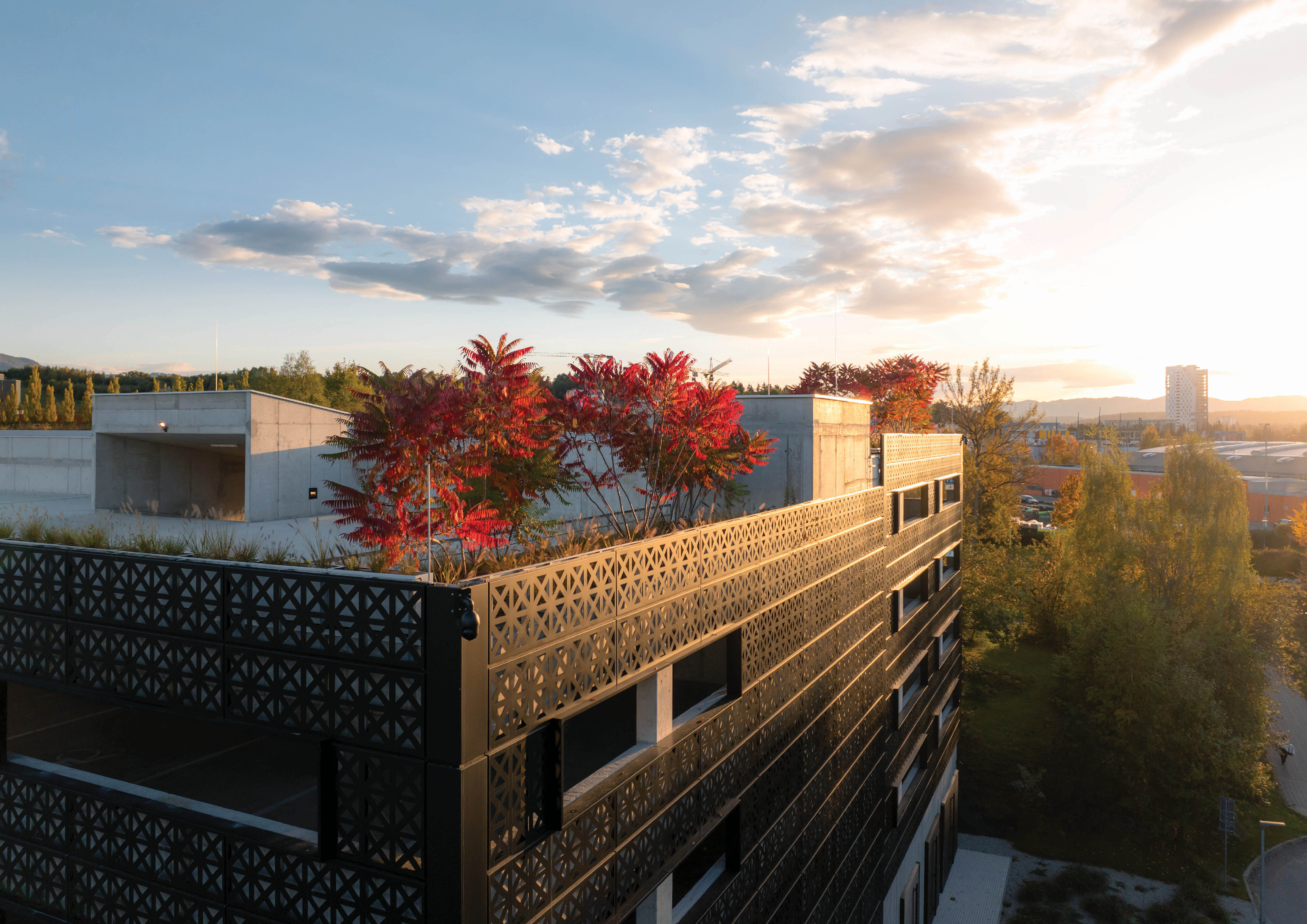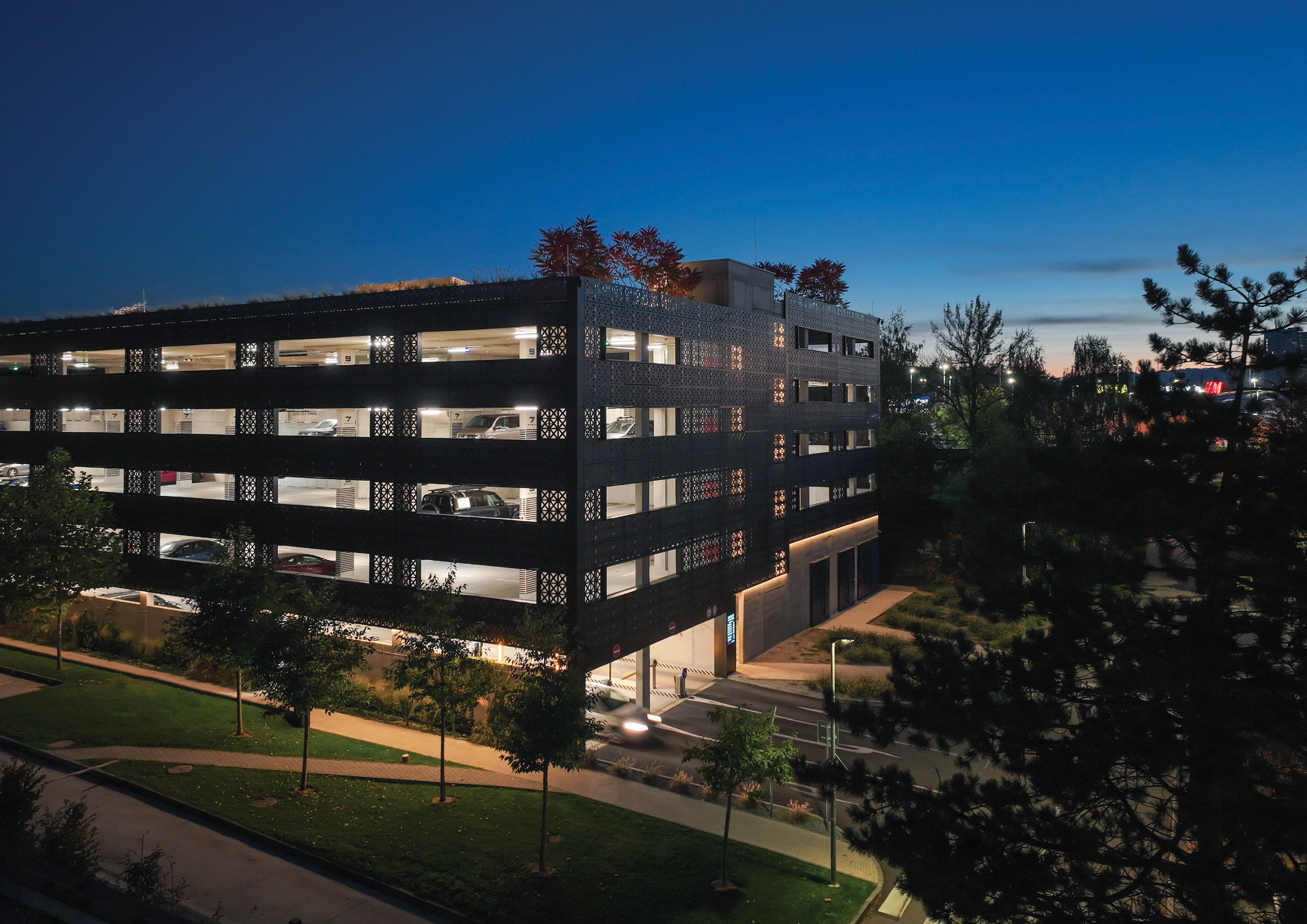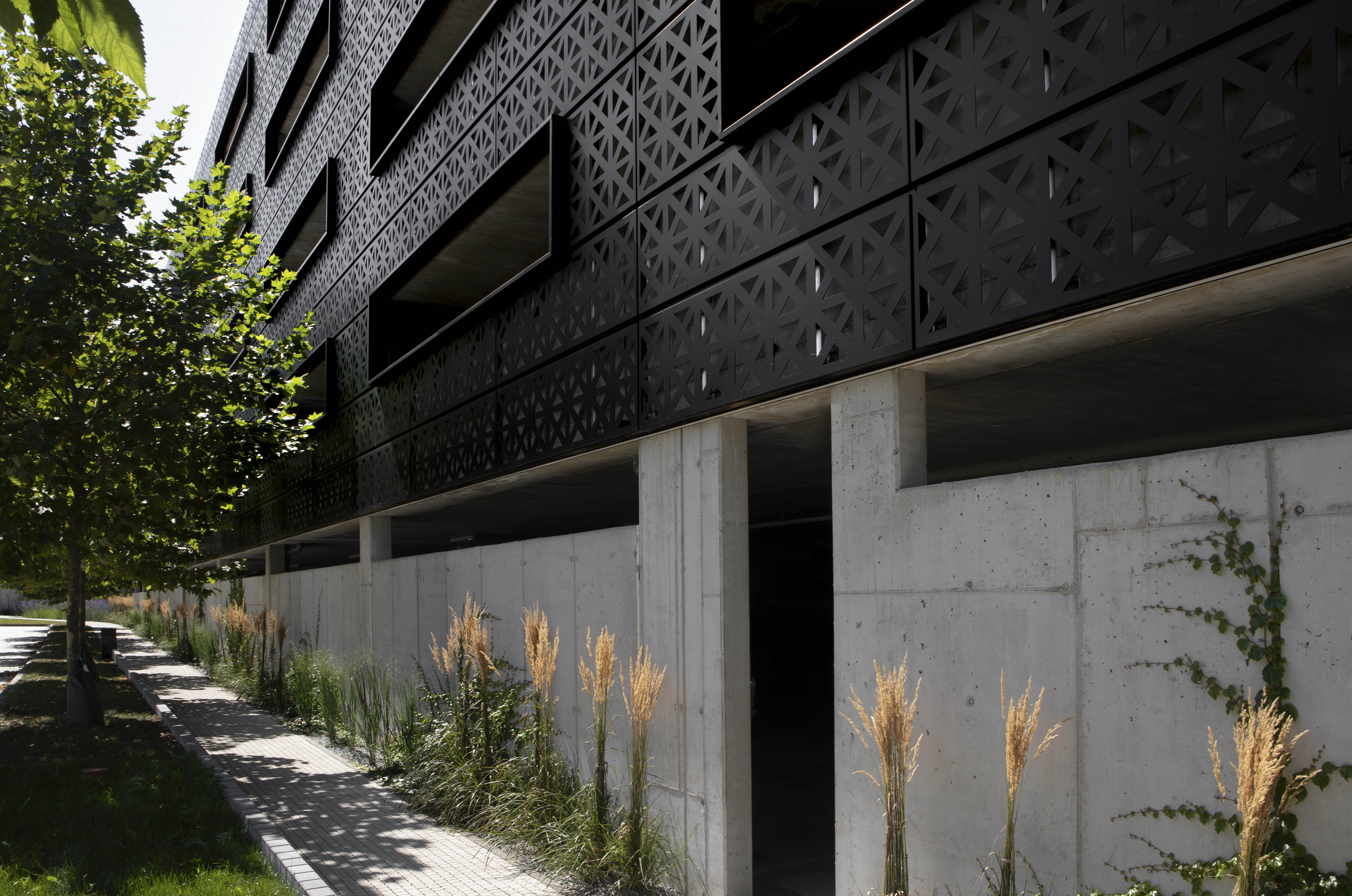 Architektonické riešenie objektu vychádza z jednoduchej hmoty, ktorá má obdĺžnikový pôdorys. Základná železobetónová konštrukcia objektu je doplnená perforovaným obkladom s náznakom okenných otvorov. Objekt viacúrovňového parkovania je päťpodlažný s posunom podlaží prístupnými polrampami a troma komunikačnými jadrami. Časť strechy tvorí zelená strecha a fotovoltické panely. V rámci vybudovania objektu bol zrealizovaný samostatný vjazd do tohto objektu, úprava existujúcich peších komunikácií, úprava zelených plôch a potrebná infraštruktúra.