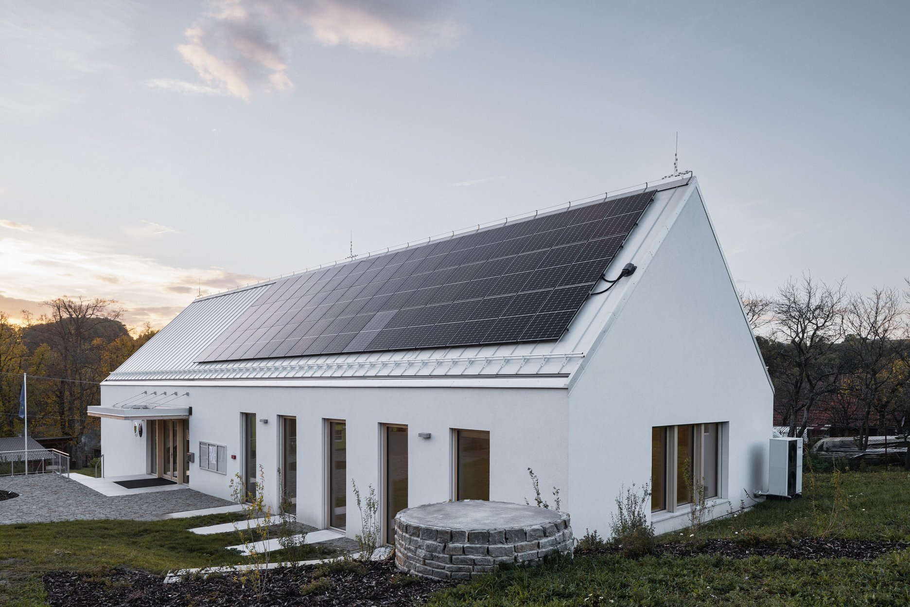 Pozitívna energetická bilancia však nie je jediným udržateľným princípom. Architekti využili lokálne zdroje a materiály – vonkajšia kamenná dlažba pochádza z neďalekého lomu, drevo na krov zas z miestneho lesa. Do výstavby, a najmä do uvedenia objektu do prevádzky, sa podľa svojich možností zapojili aj obyvatelia Rudimova.