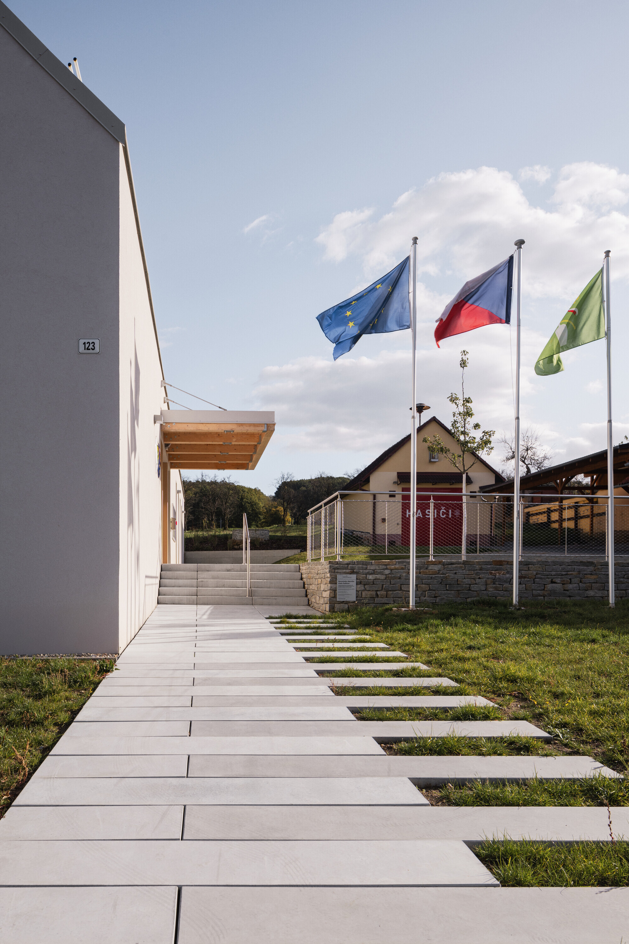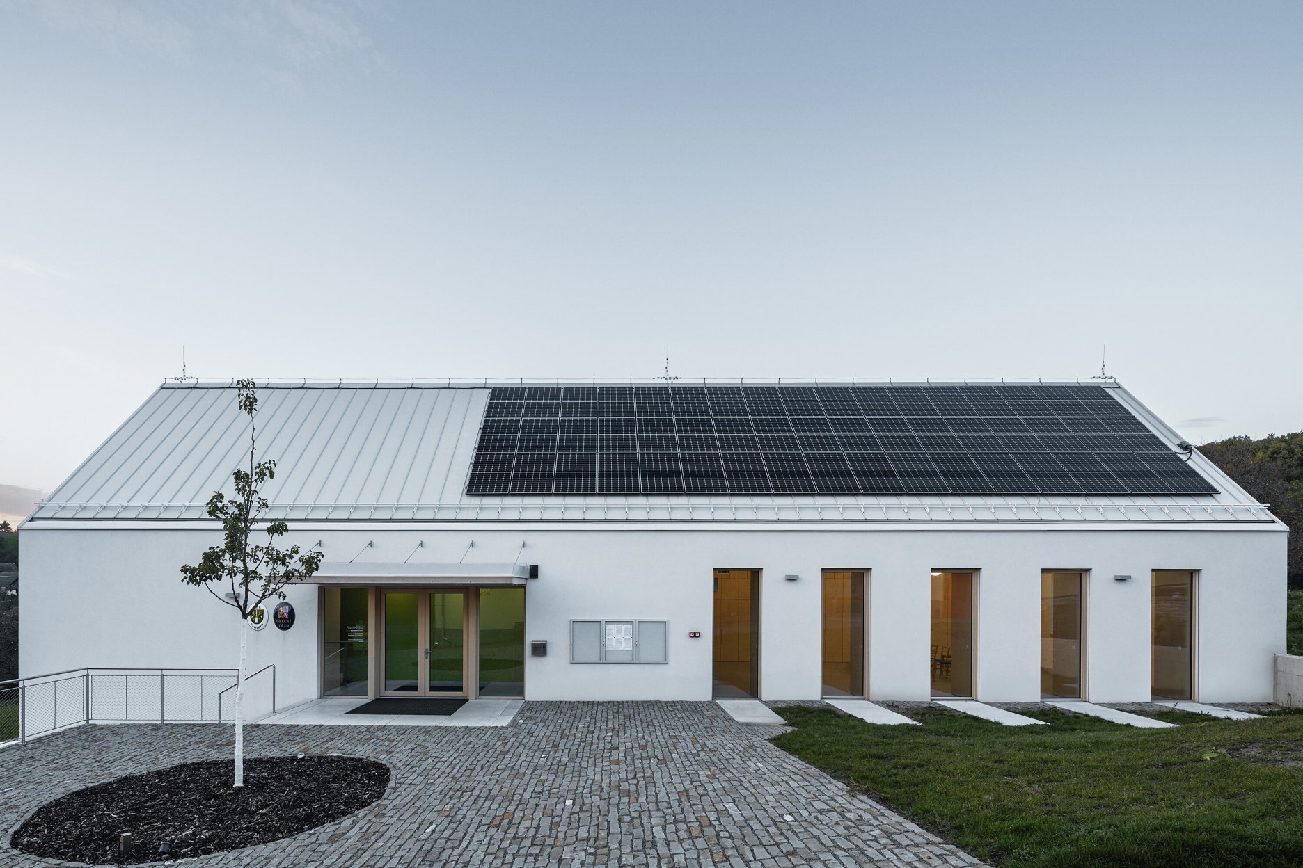 Mierka objektu zodpovedá veľkosti obce i okolitej drobnej zástavbe, najmä rodinným domom. Navrhnutý je tak, aby nebol len solitérom, ale predovšetkým súčasťou mozaiky stavieb dôležitých pre život obce. Jeho forma, podľa slov architektov, vychádza z archetypu vidieckej stodoly, no zároveň odkazuje na susediacu hasičskú zbrojnicu, čím oba celky vizuálne prepája. Význam novovytvoreného priestoru medzi nimi podčiarkuje hruška vysadená pri dokončení stavby – v budúcnosti poskytne tieň a stane sa dominantou priestoru. Na dláždenú plochu nadväzuje záhrada, ktorá v minulosti nebola využívaná a postupne sa otvára do okolitej krajiny. Spolu so záhradou ponúka areál pestré možnosti využitia.