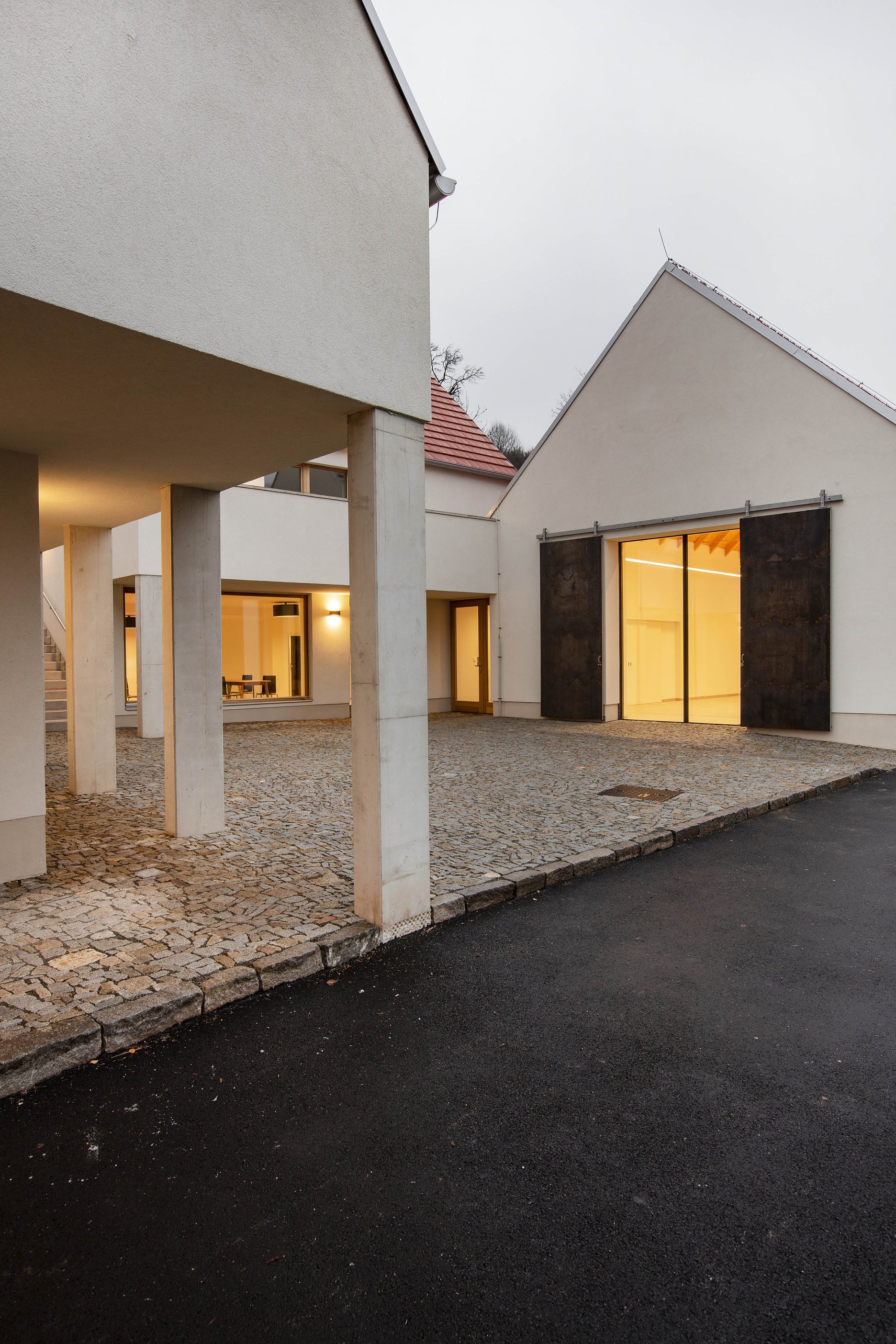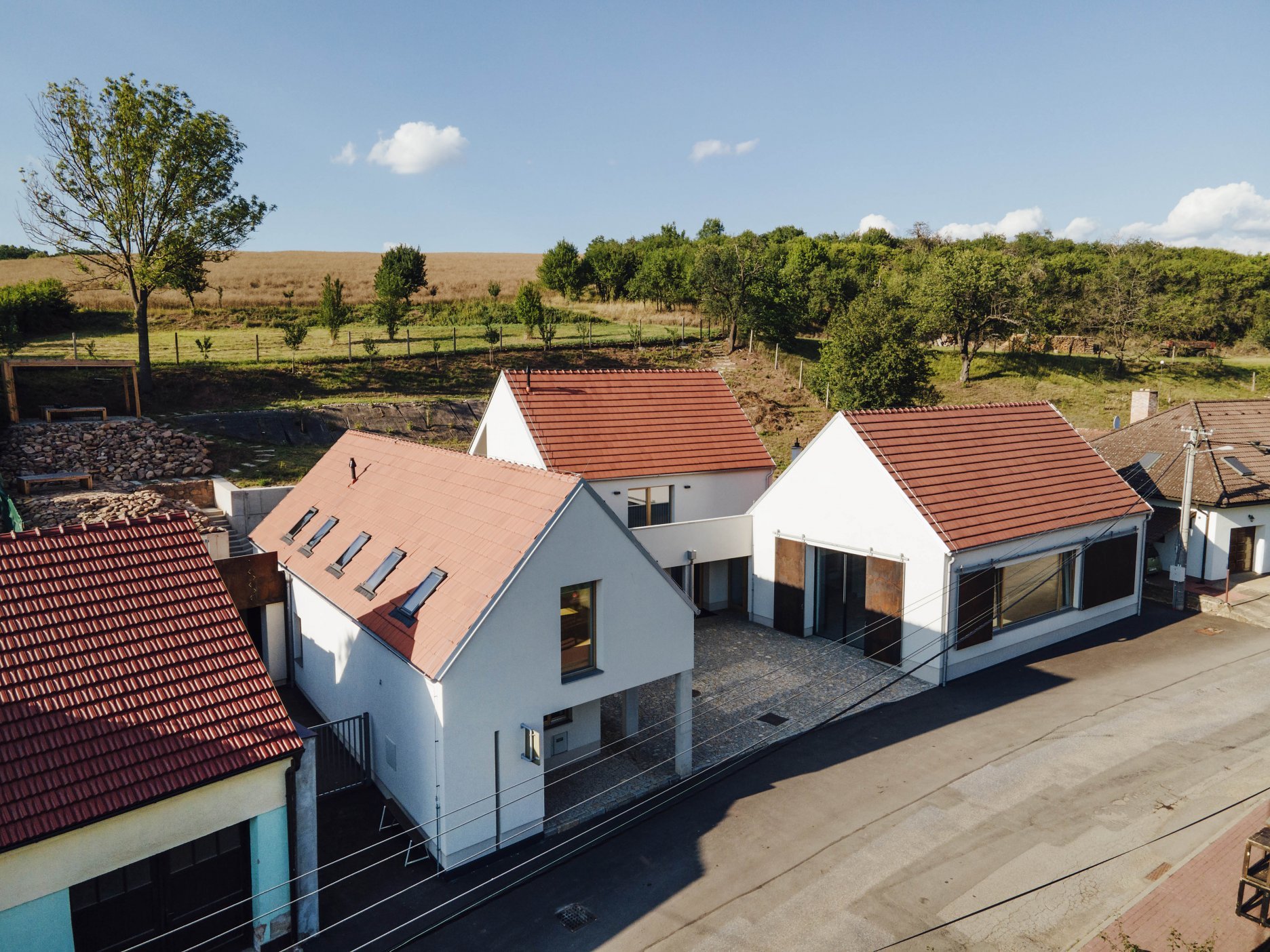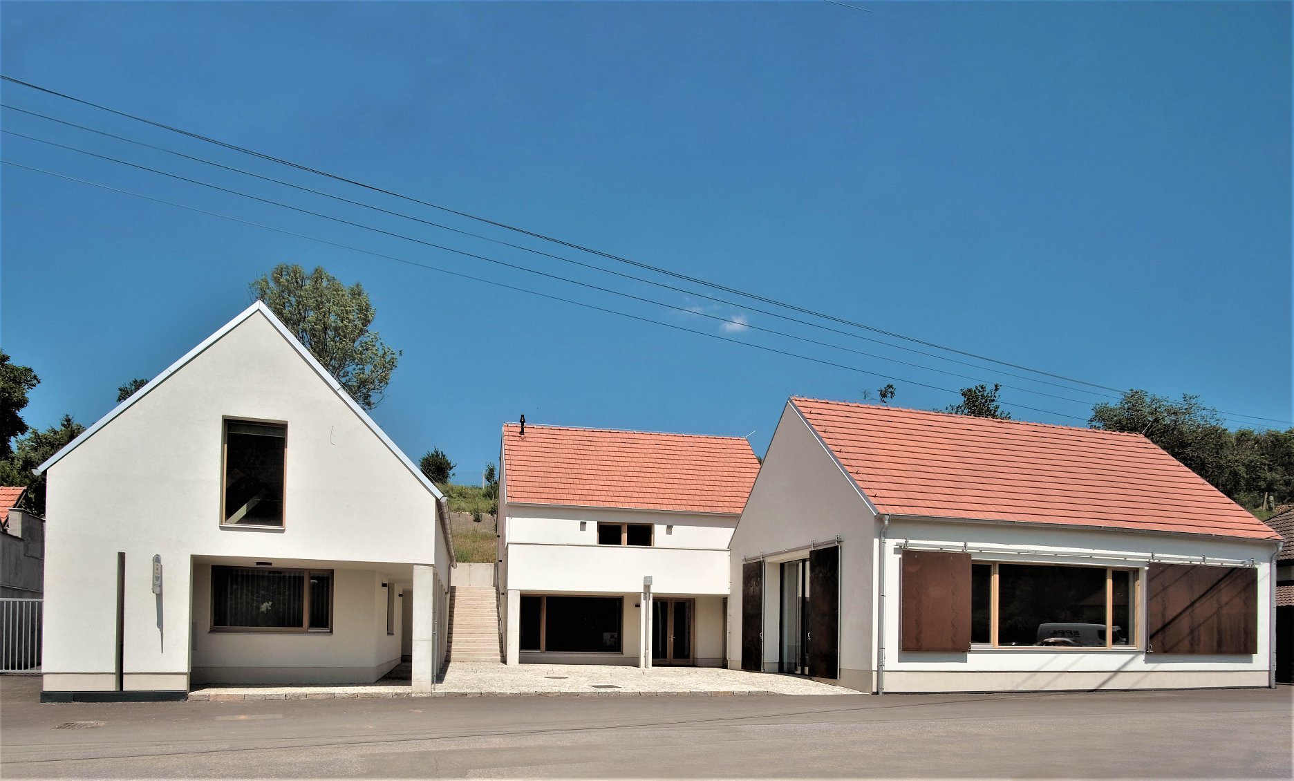 Trojichu archetypálne pôsobiacich objektov charakterizuje hladká biela omietka a strechy s klasickou škridlou. Prízemné časti s plochou strechou architekti nenápadne “ukryli” medzi hlavné objekty. Výrazné cortenové okenice sú súčasným doplnením inak tradičného vyznenia, ktoré zostáva uchopiteľné pre spoločenstvo miestnych občanov.