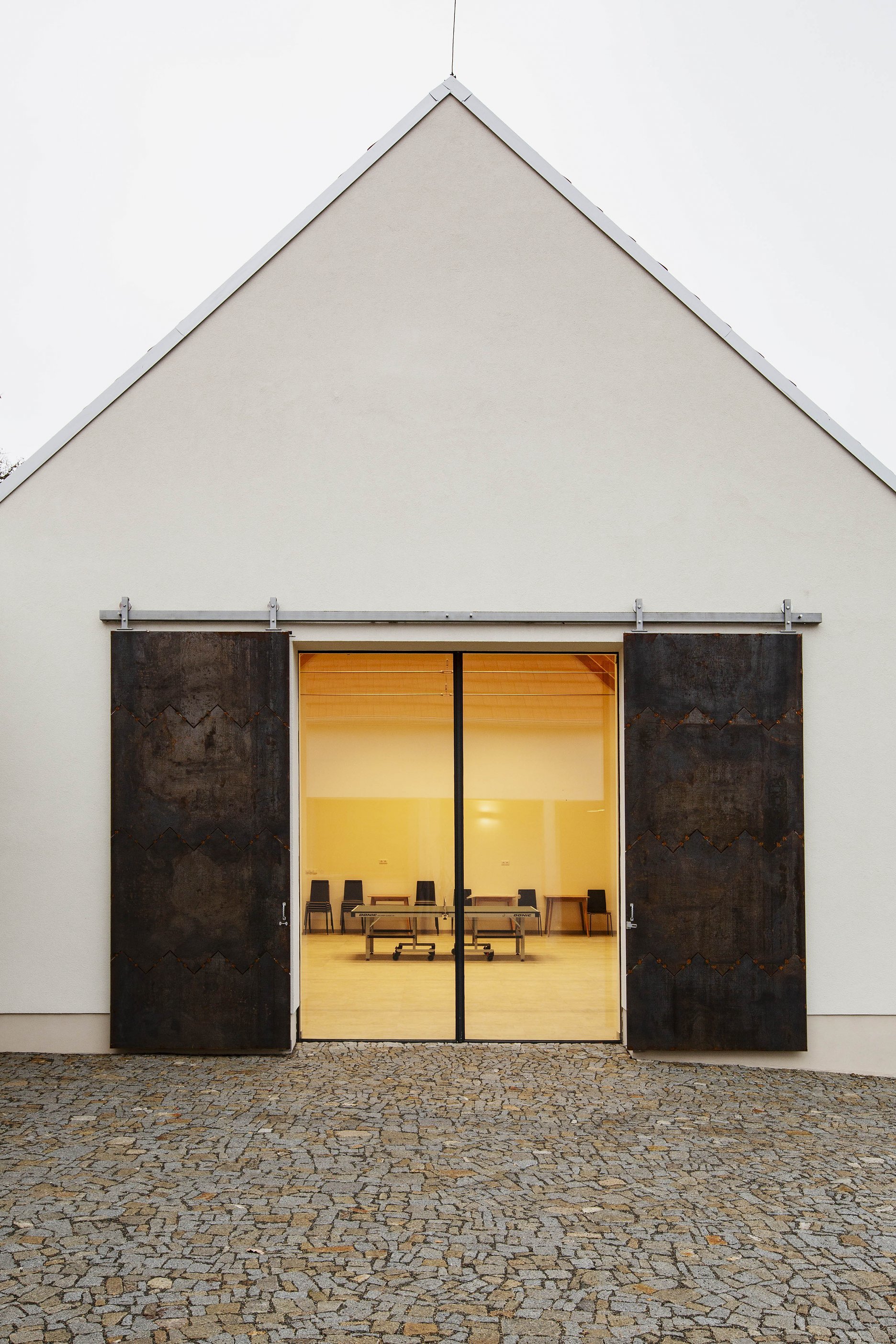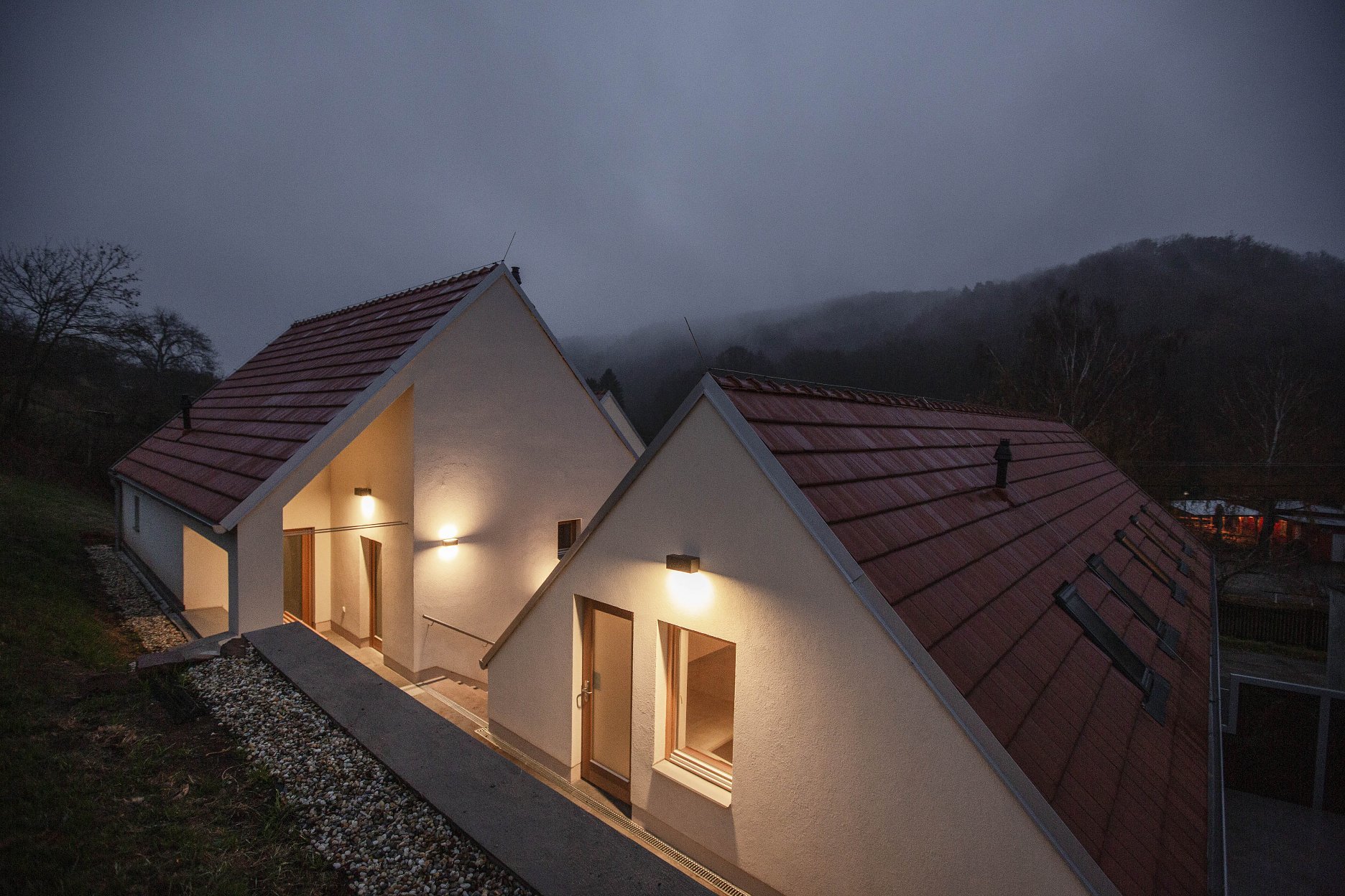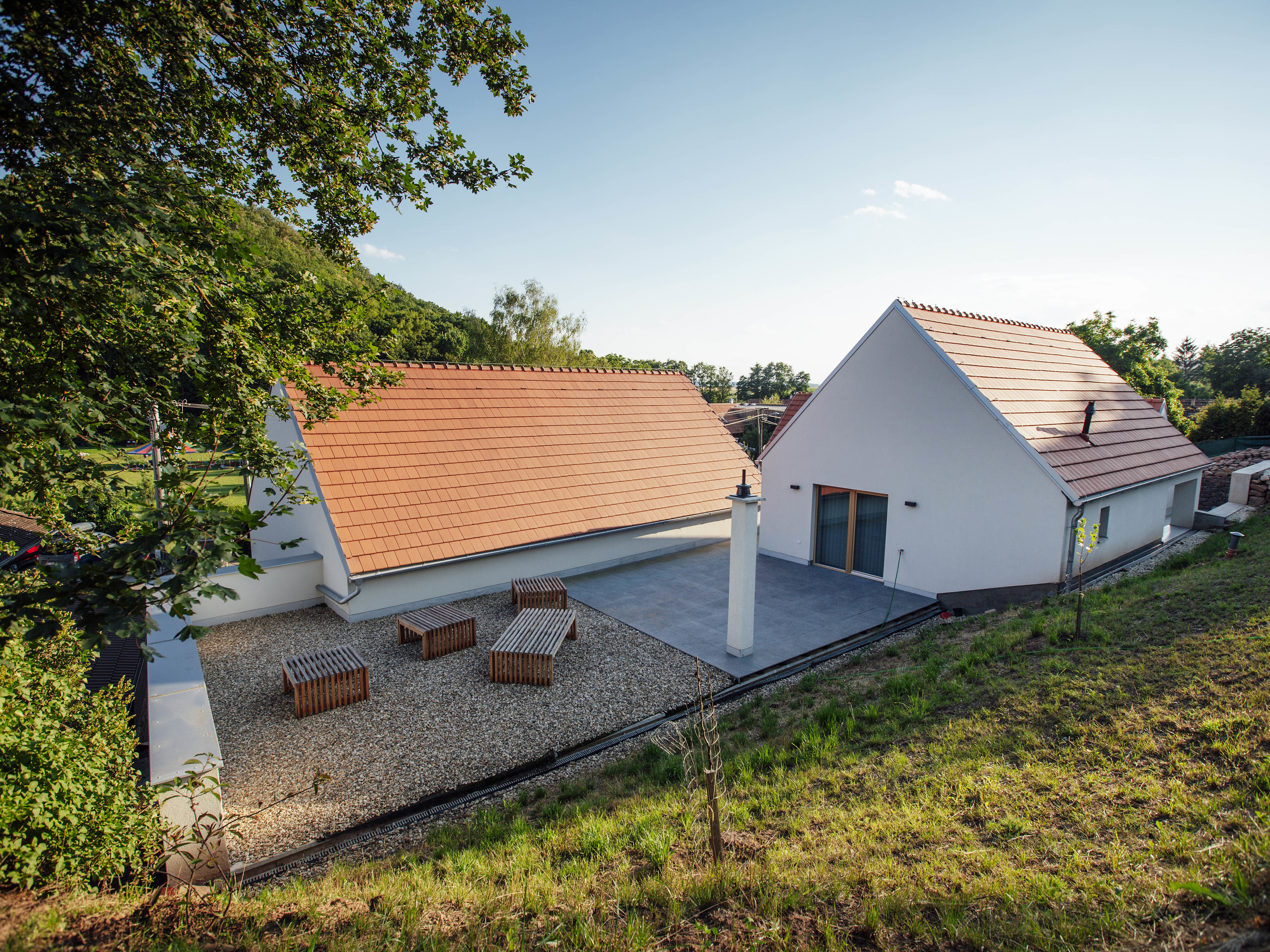 Trojichu archetypálne pôsobiacich objektov charakterizuje hladká biela omietka a strechy s klasickou škridlou. Prízemné časti s plochou strechou architekti nenápadne “ukryli” medzi hlavné objekty. Výrazné cortenové okenice sú súčasným doplnením inak tradičného vyznenia, ktoré zostáva uchopiteľné pre spoločenstvo miestnych občanov.