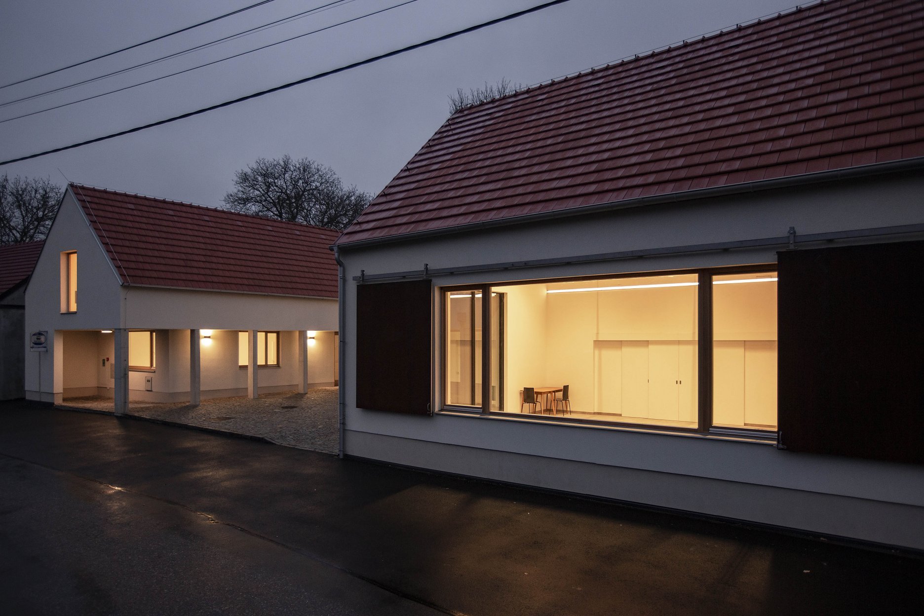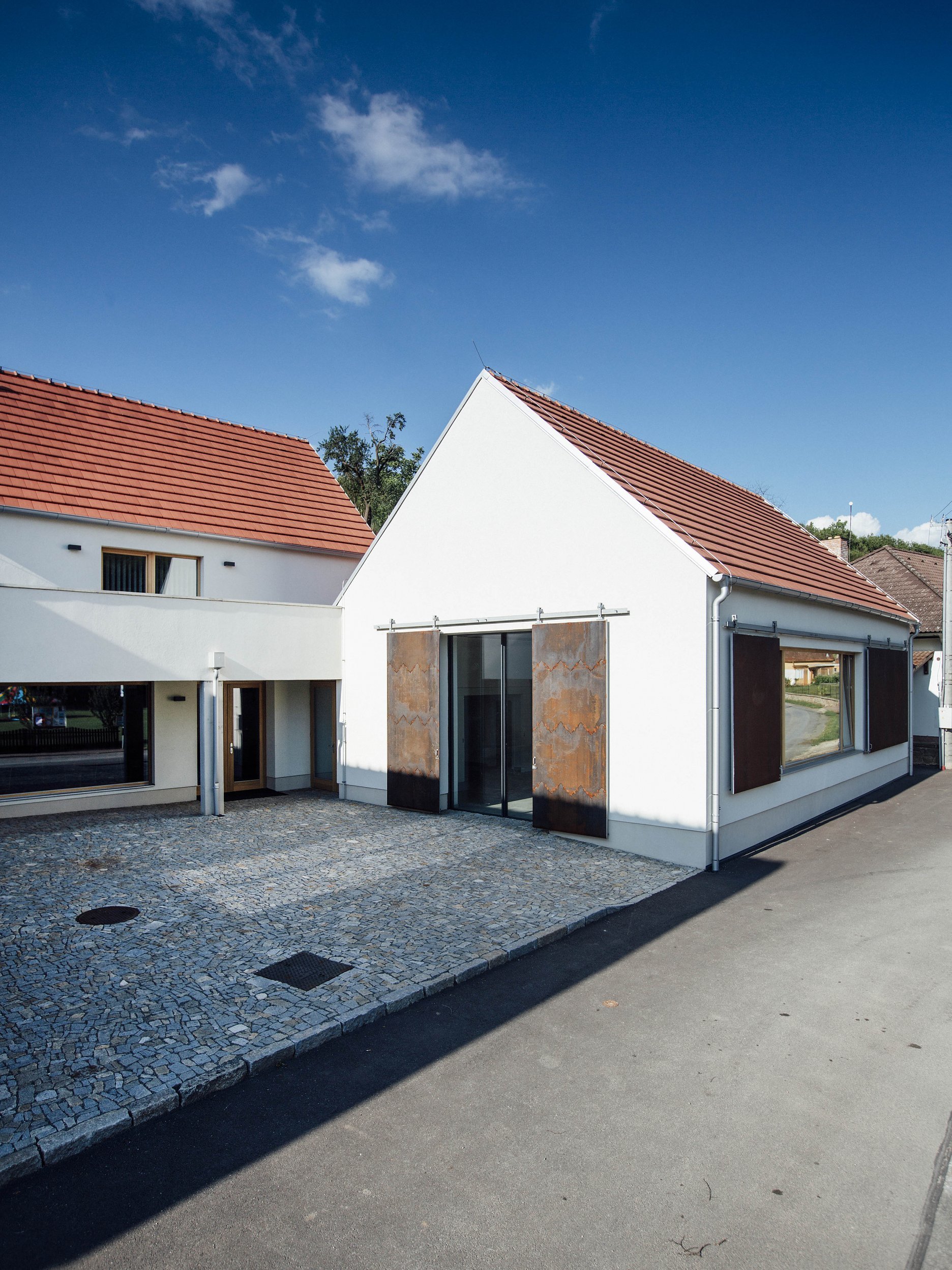Keď v malej juhomoravskej obci s necelými dvoma stovkami obyvateľov prestala fungovať chátrajúca krčma, rozhodla sa samospráva na jej mieste vybudovať obecný dom, ktorý by vytvoril nové zázemie pre komunitný život. Nový komplex v centre obce tvorí ľahko čitateľná kompozícia objektov, ktoré vytvárajú nádvorie. Ústredný priestor dopĺňa oddychová záhrada vo svahu za budovami.