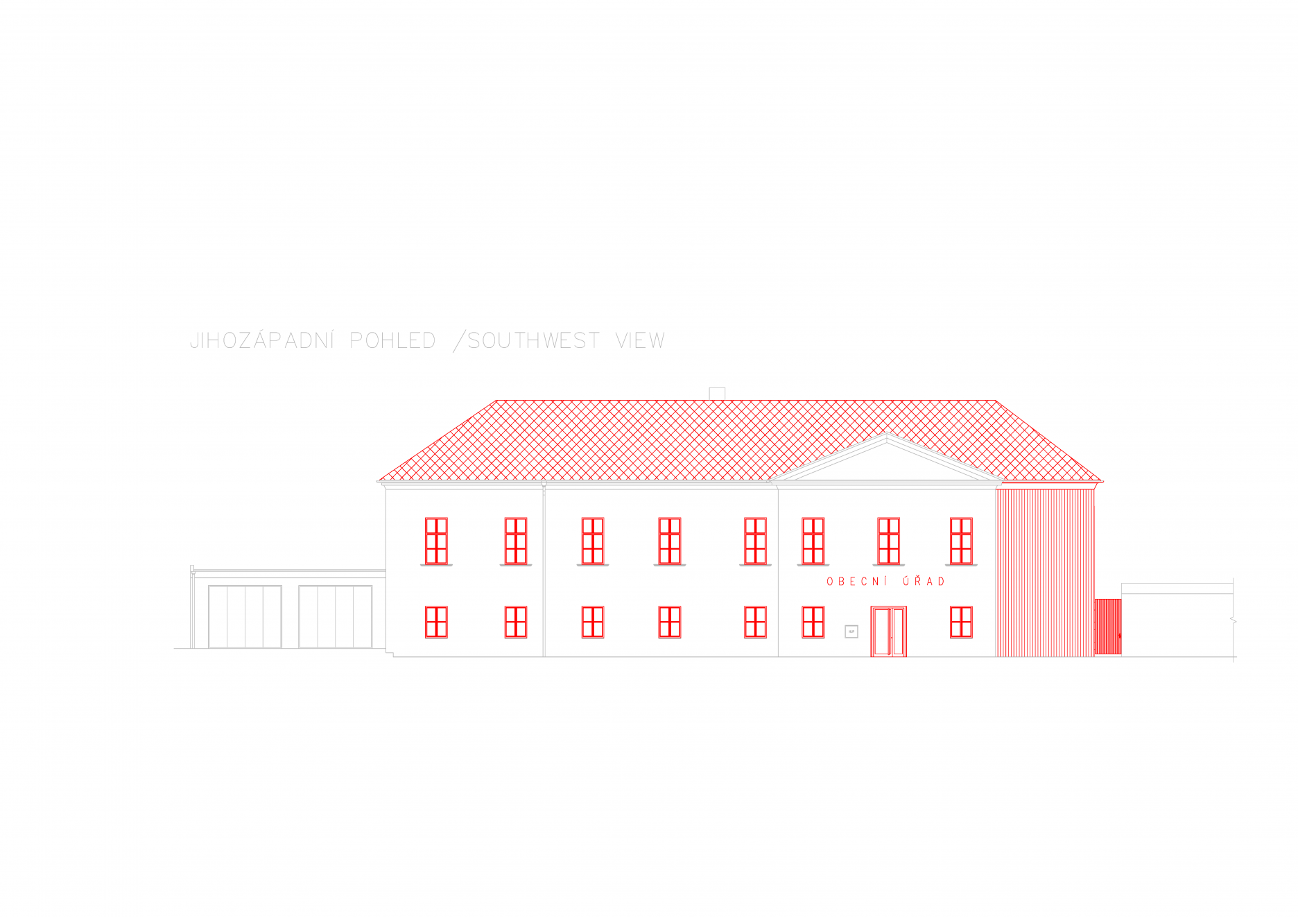 Návrh vychádza z požiadavky obce Hluchov revitalizovať zanedbaný objekt a vyriešiť nedostačujúce sociálne zázemie obce. Architekti sa zaoberali tiež komplexným riešením novej prevádzky. Pôvodné dispozičné riešenie s kanceláriami na poschodí už nevyhovovalo súčasným nárokom na bezbariérovú prevádzku. Dispozícia je po novom obrátená. Prízemie využívajú kancelárie obecného úradu. Poschodie vyhradili architekti pre spoločenskú sálu, knižnicu a výčap. Historický objekt doplnila nová dostavba, ktorá zastrešuje hygienické zázemie pre obe poschodia. Prístavba cituje krídlo pôvodného zámku, z ktorého sa zachoval len fragment múru.