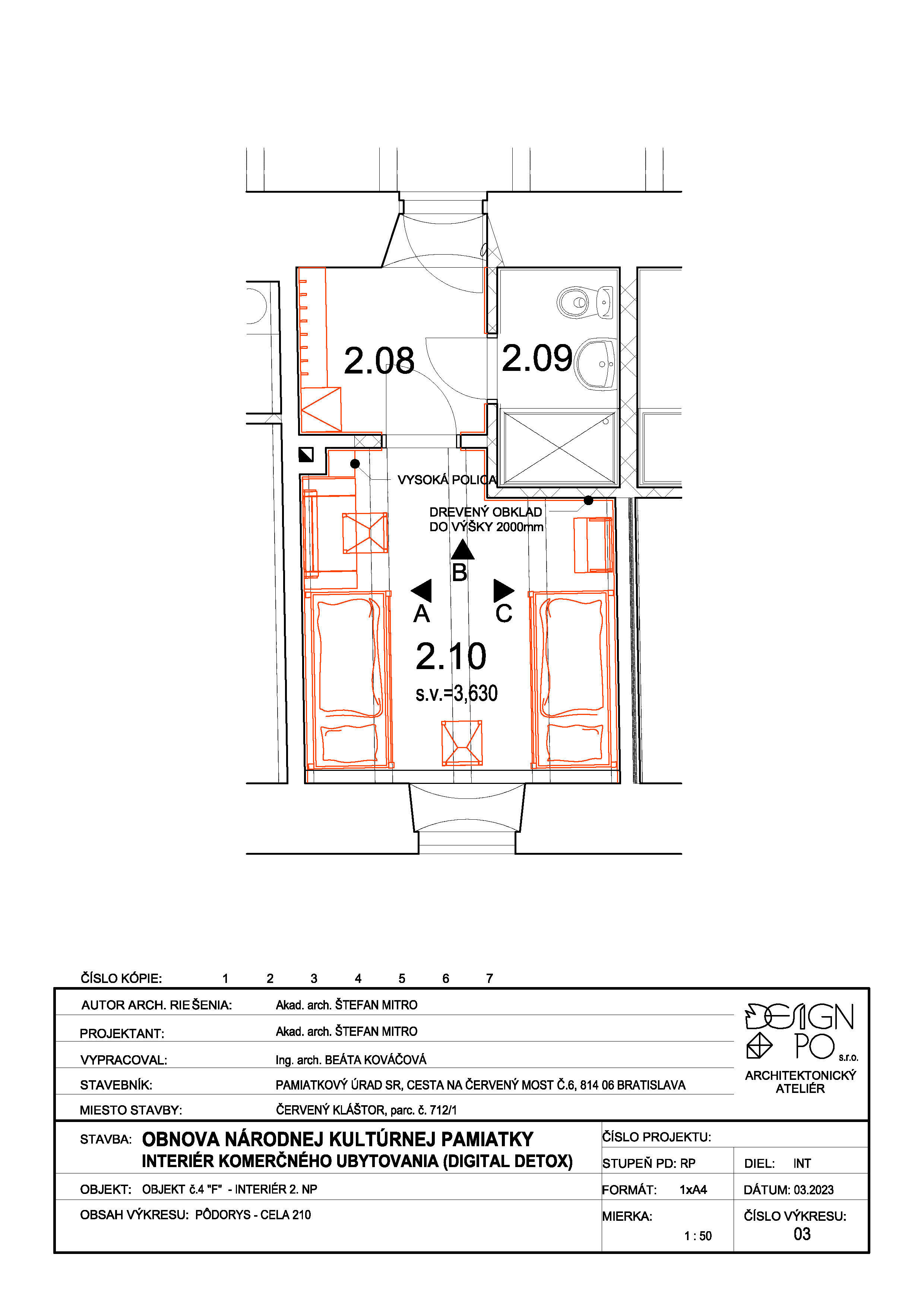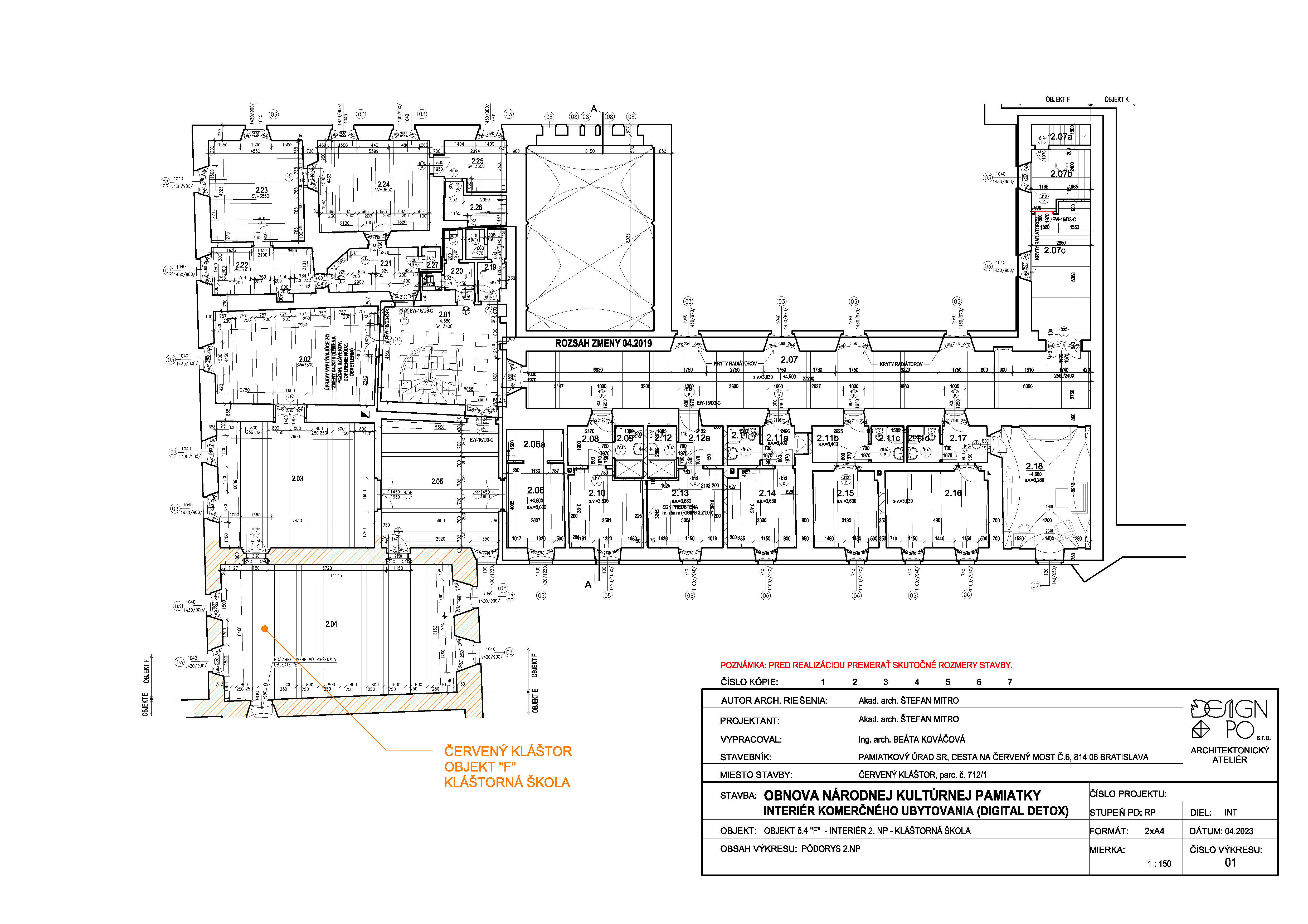 Pod dohľadom SURPMO Praha vznikli nové krovové konštrukcie trojice sedlových striech konventu, dubové vlysové podlahy a ikonické valcovité svietidlá z ohýbanej ocele a skla, ktoré dodnes definujú charakter interiéru objektu "F".