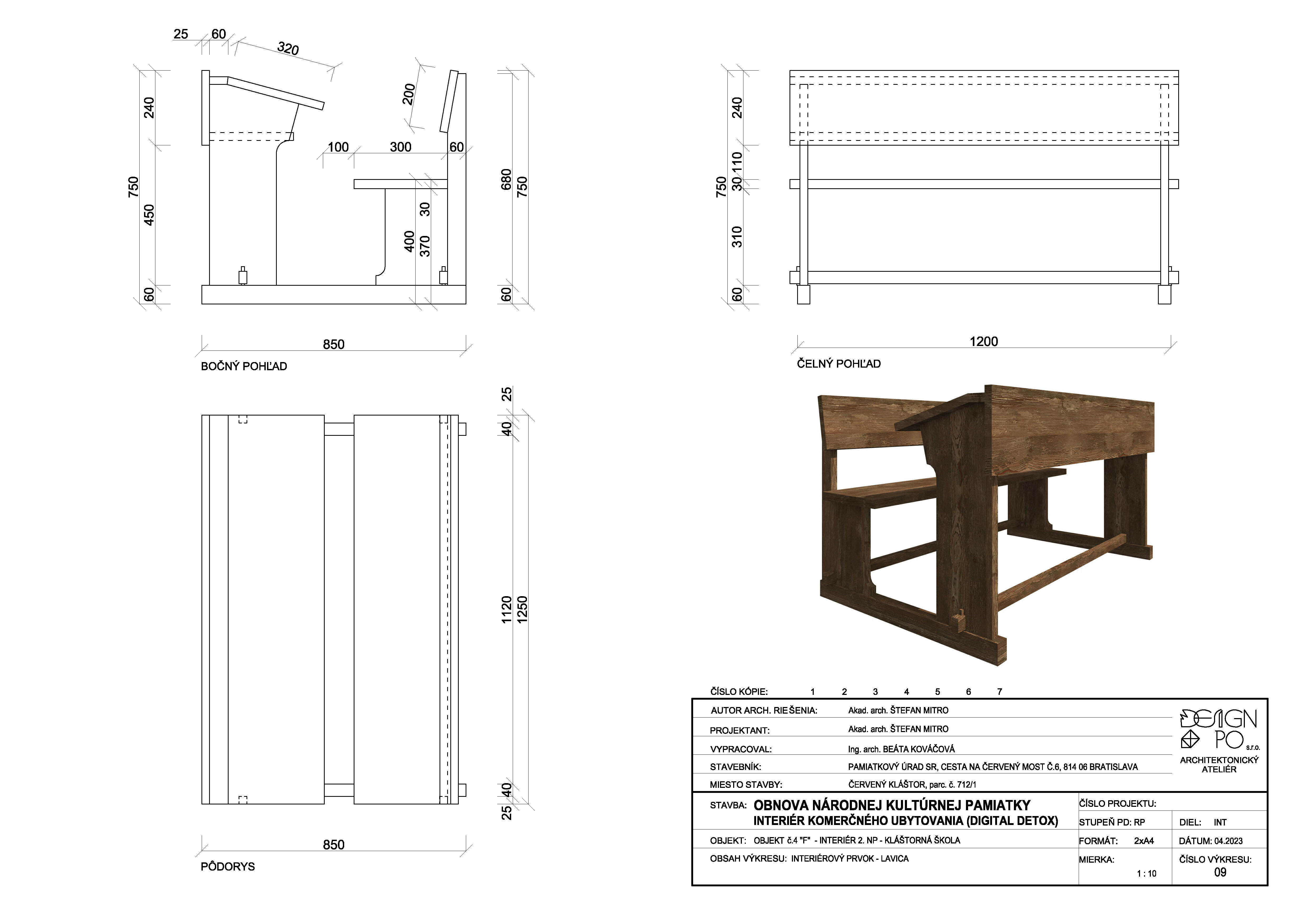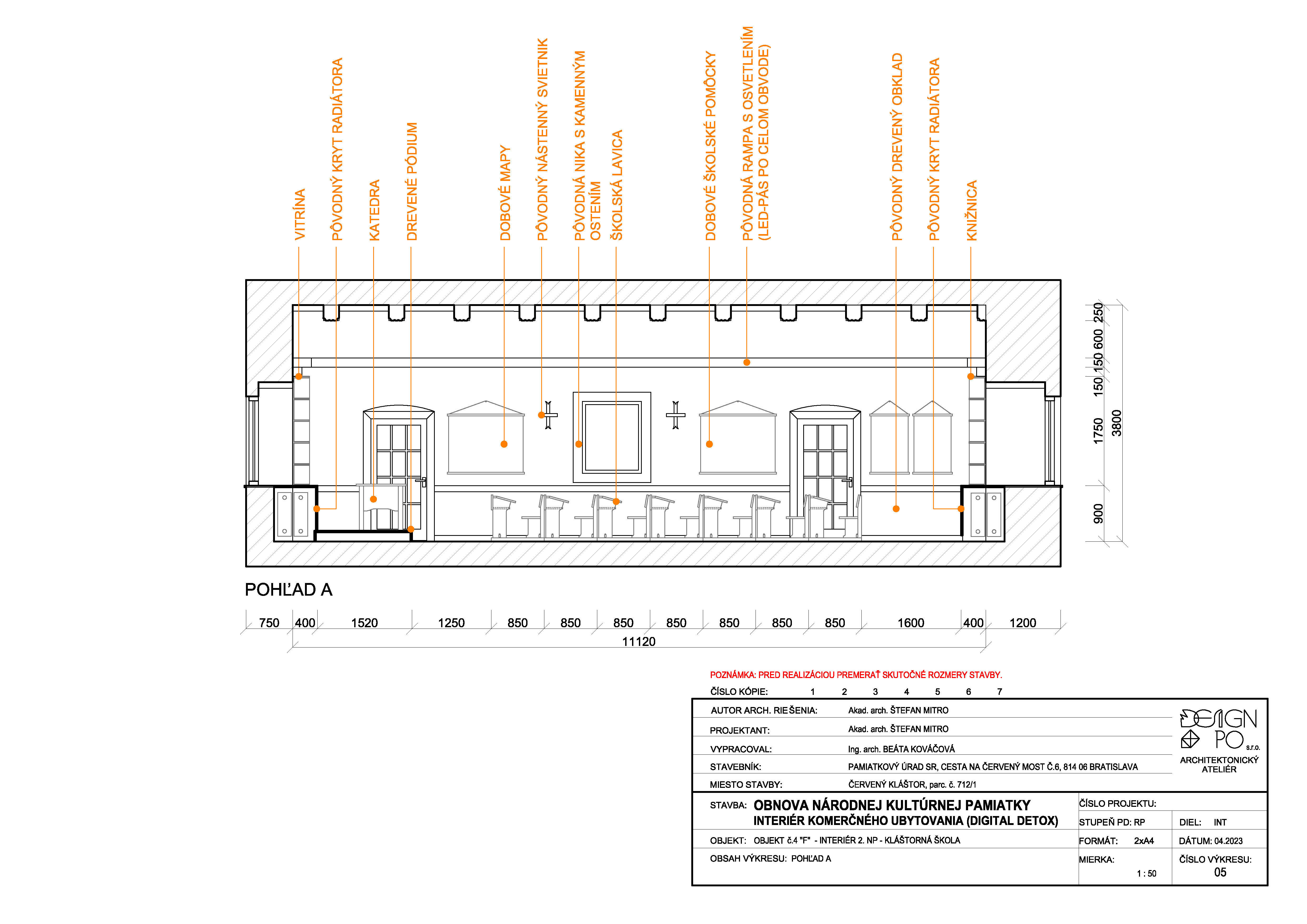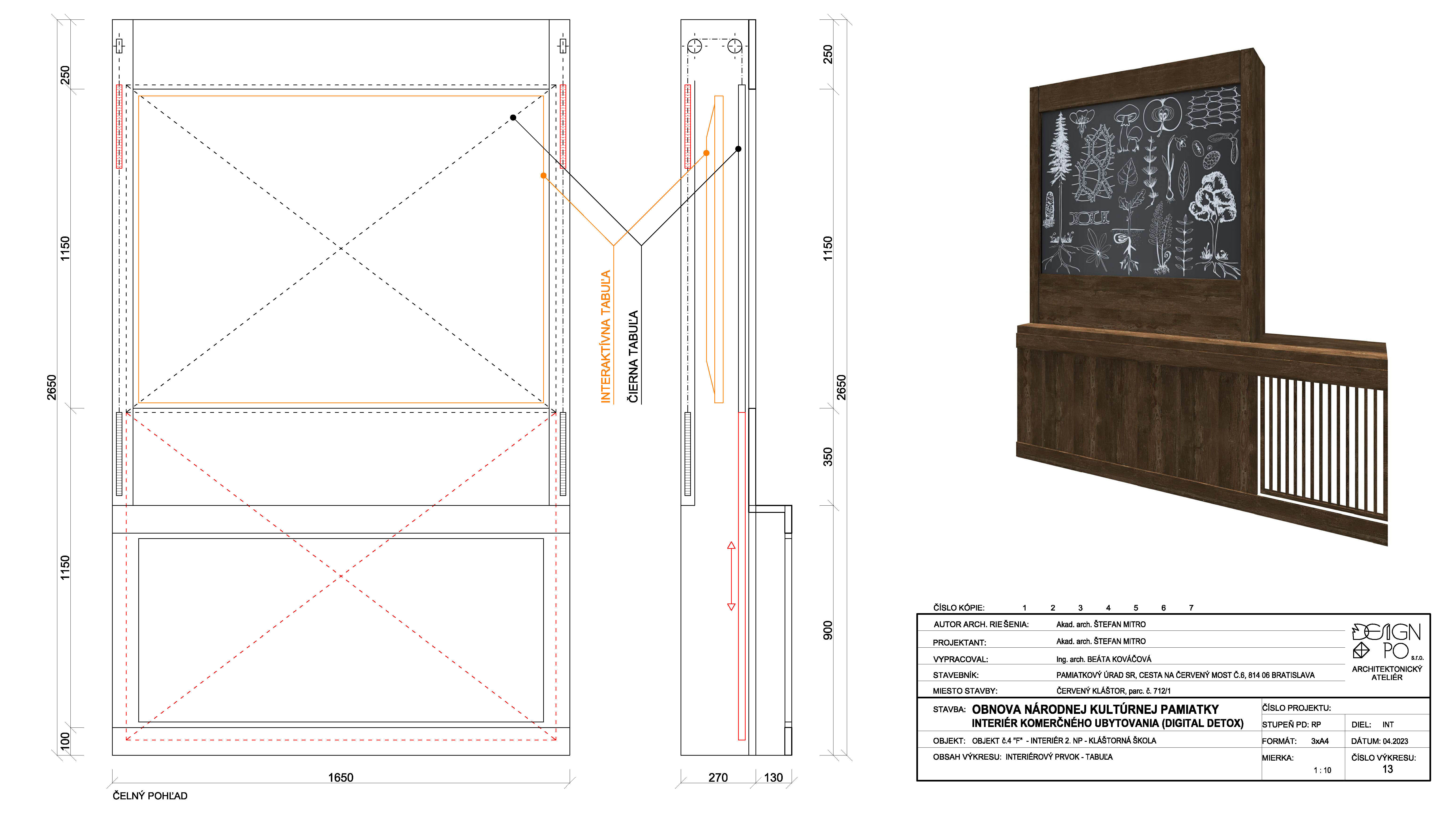 O poschodie vyššie, v miestnosti 2.04 (72,31 m²), vzniká interaktívna trieda. Pôvodné trubkové svietidlá zostávajú odhaleným artefaktom modernistickej fázy, sekundárne osvetlenie zabezpečujú repasované drevené rampy so skrytými LED pásmi. Klasicisticky tvarovaná čierna tabuľa sa zasúva pred 90-palcovú interaktívnu plochu. Lavice, kefované borovicové masívy s olejovo-voskovým náterom, integrujú písaciu dosku a sedenie pre dvojicu žiakov, čím reinterpretujú historické zariadenie. V zadnej stene sa reštauruje kamenná nika uzavretá novou kovanou mrežou; slúžiť bude na prezentáciu vzácnych herbárových faksimílií.