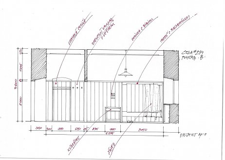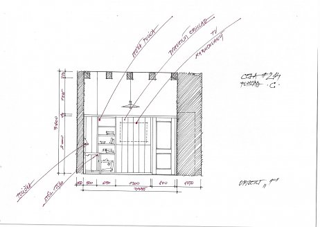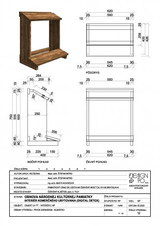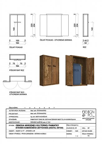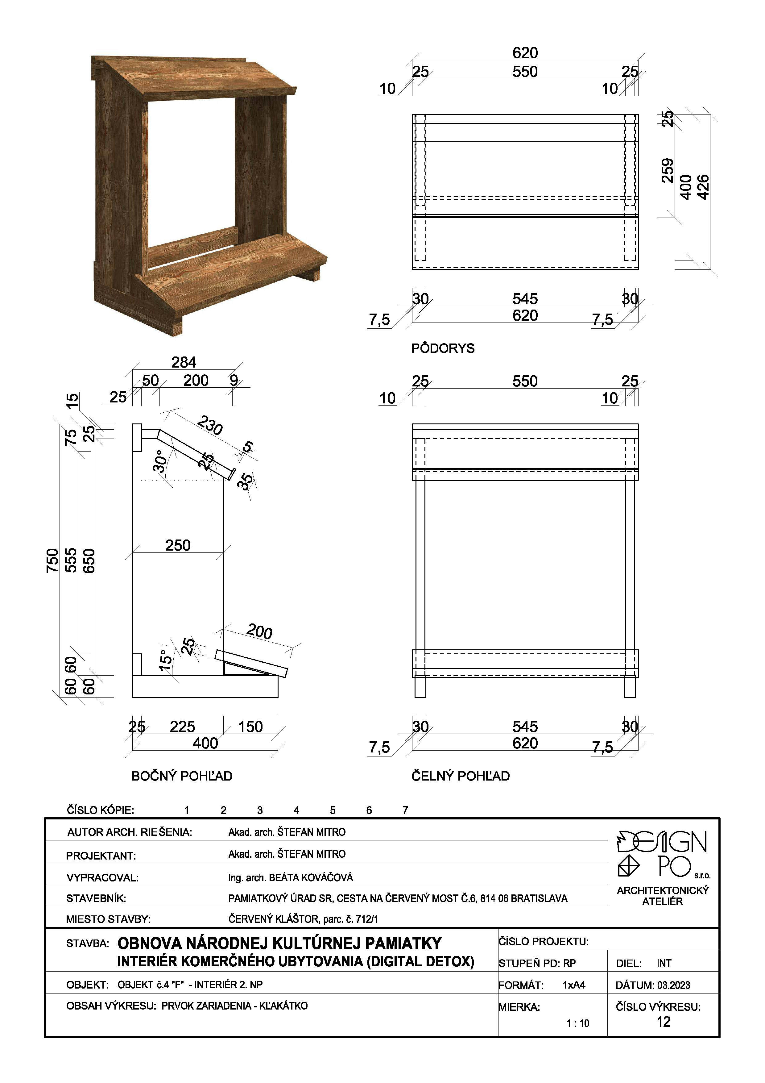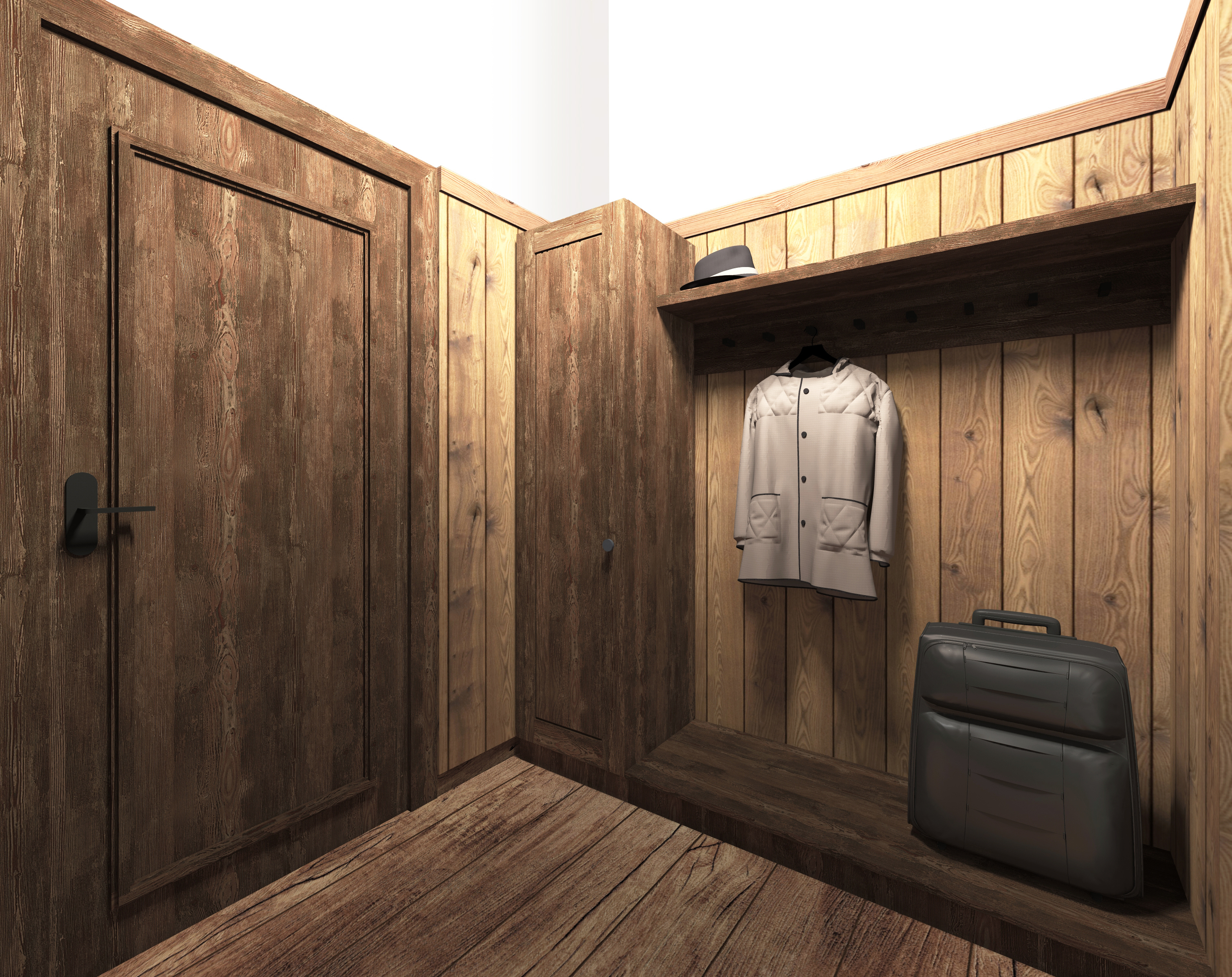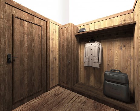 K základnému mobiliáru patrí aj zavesená drevená kazeta nad kľakátkom (ukrýva Bibliu a krížik) a drobné poličky. Odkladací priestor zabezpečujú vstavané police na batožinu a zabudovaná skriňa s vešiakom integrovaným do čelnej steny predsiene.