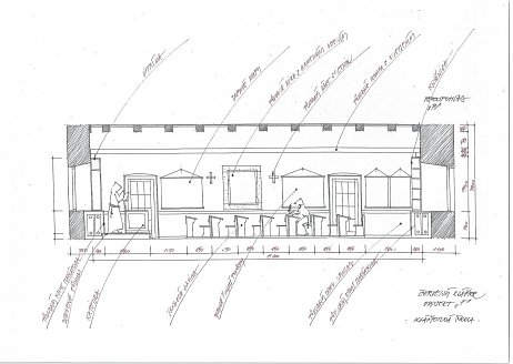 Nové inštalácie (elektro, slaboprúd, EPS) sú vedené výhradne v soklových lištách alebo samonosných priečkach, takže historické murivá zostávajú bez drážok. Retro lampy vychádzajú z tvaroslovia pôvodných trubkových svietidiel, no využívajú nízkoenergetické LED zdroje. Všetky nánosy farieb na obkladoch prešli skúškou retušovateľnosti; finálny náter, vápenná lazúra tónovaná miestnou hlinou, zjednocuje rôzne materiálové vrstvy a zlepšuje difúznu rovnováhu povrchov.