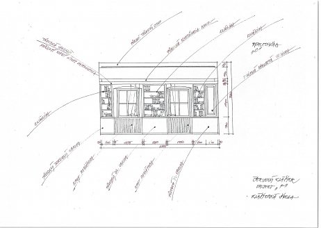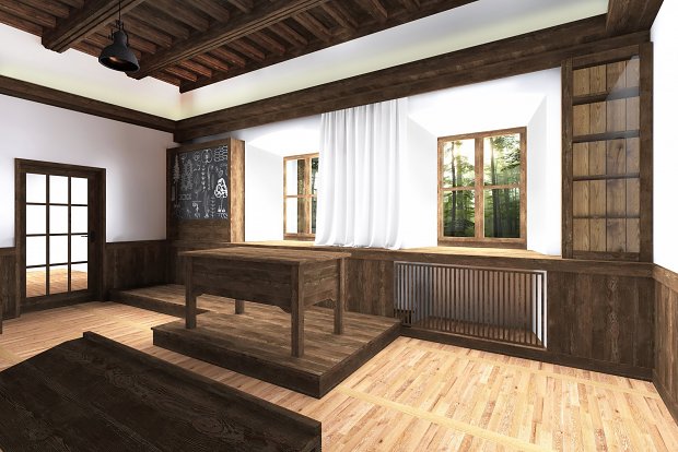 Ponecháva dubovú vlysovú podlahu, trámový strop s priečnymi trámikmi, aj drevené kryty radiátorov s perforovanou kovovou mriežkou.