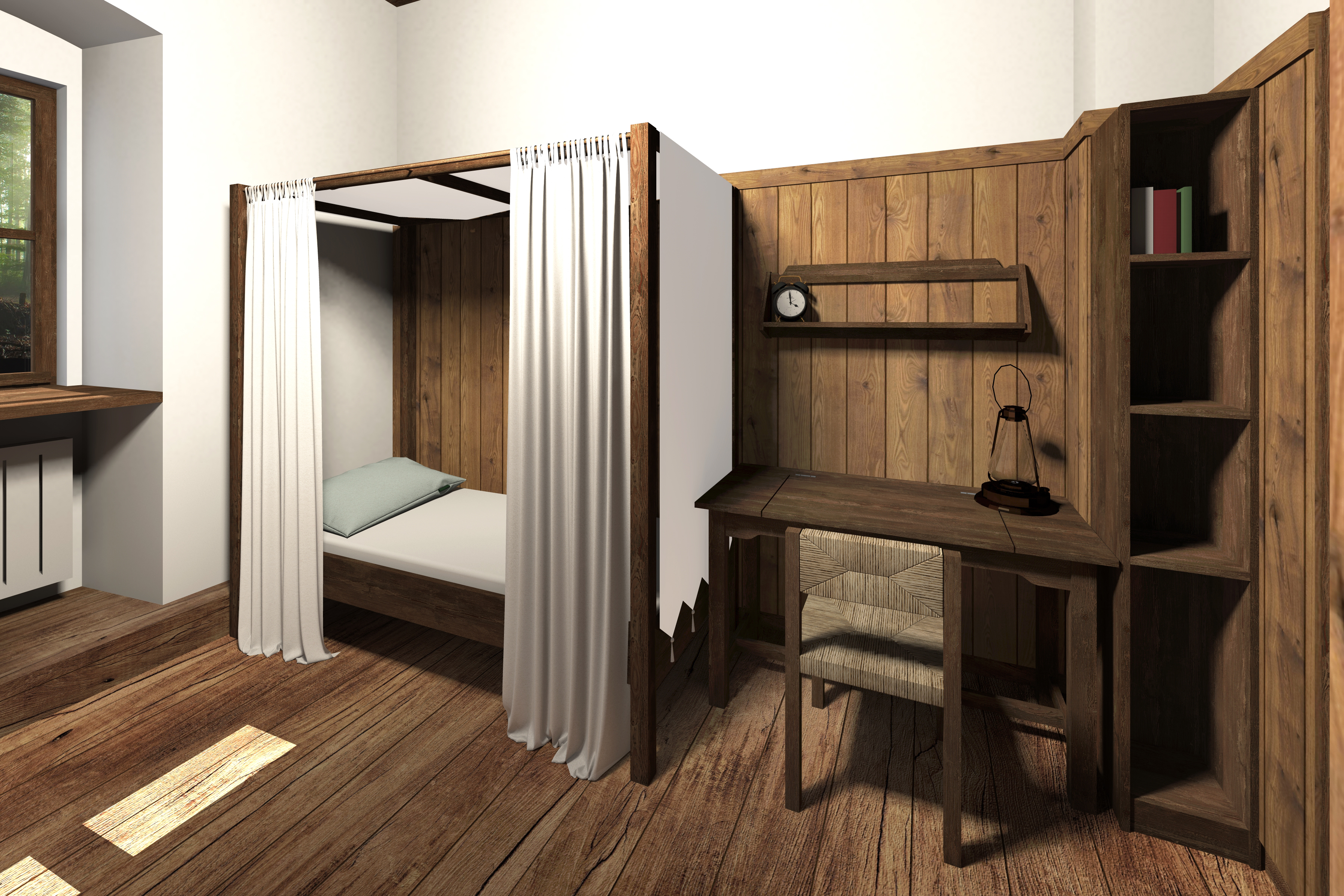 Na prvom podlaží trojice sedlových striech vzniklo päť jednoducho zariadených ciel. Celodrevené postele, stolček a sviečka nahrádzajú obrazovky; signál Wi-Fi aj mobilných sietí je úmyselne odtienený. Pobyt propagovaný ako „Digital Detox Camp“ reprezentuje návrat k monastickej idei ticha a kontemplácie. Architektonické riešenie využíva regulovanú mikroventiláciu a tlmené LED orientačné osvetlenie v sokloch, aby sa zachovala vizuálna jednoduchosť aj bezpečnostné štandardy.