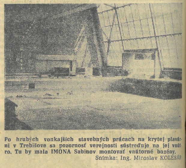 Budova mestskej plavárne bola postavená v rámci investičnej časti akcie „Z“. Začiatok jej výstavby sa datuje do roku 1971. Majstri ju stavali za pomoci povinných brigád Trebišovčanov. Celý areál budovali 16 rokov a použilo sa naň 26 000 000 česko-slovenských korún. V roku 1984 stavbu prevzal Okresný stavebný podnik Trebišov, čo významne urýchlilo výstavbu tohto športového stánku. Z dohľadaných archívnych článkov, uverejnených v regionálnych novinách, vieme, že plavecký bazén s rozmermi 25 x 15 m bol dokončený v roku 1986. V bazénovej časti nechýbal ani bazén pre deti s plochou 10 x 4 m. V krytej plavárni bolo zriadené liečebné oddelenie s ponukou kúpeľných služieb (masáž, manikúra, pedikúra...). Z minulosti sú známe usporiadania rôznych plaveckých súťaží, pretekov O putovný pohár mesta, ale aj obľúbených výcvikov pre žiakov základných škôl. Vybudovanú plaváreň odovzdali do užívania 30. 4. 1987.