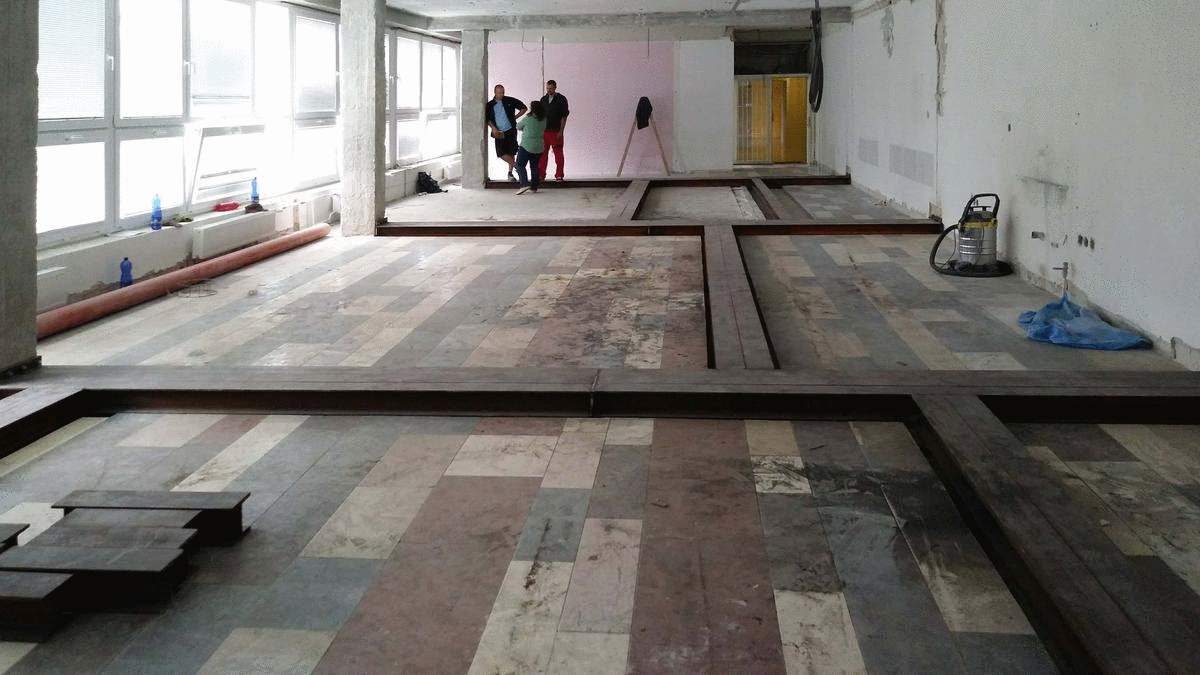 Výška podlahy sa kvôli oceľovému roštu zdvihla o 18 cm, pochôdzna vrstva – linoleum – je lepená na dutinovú podlahu z kalcium-sulfátových panelov. Priestor medzi starou a novou zdvihnutou podlahou je využitý na vedenie elektroinštalácie.