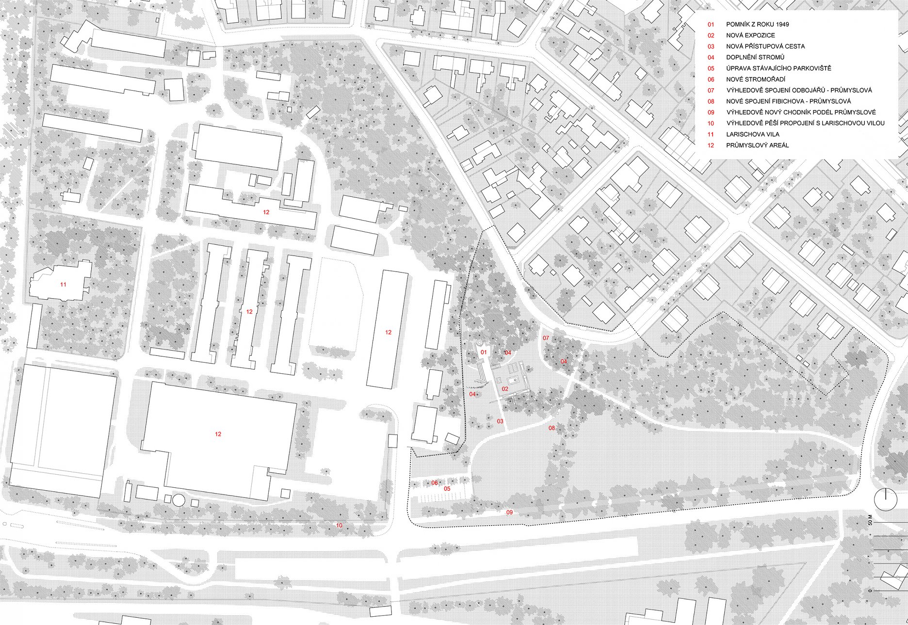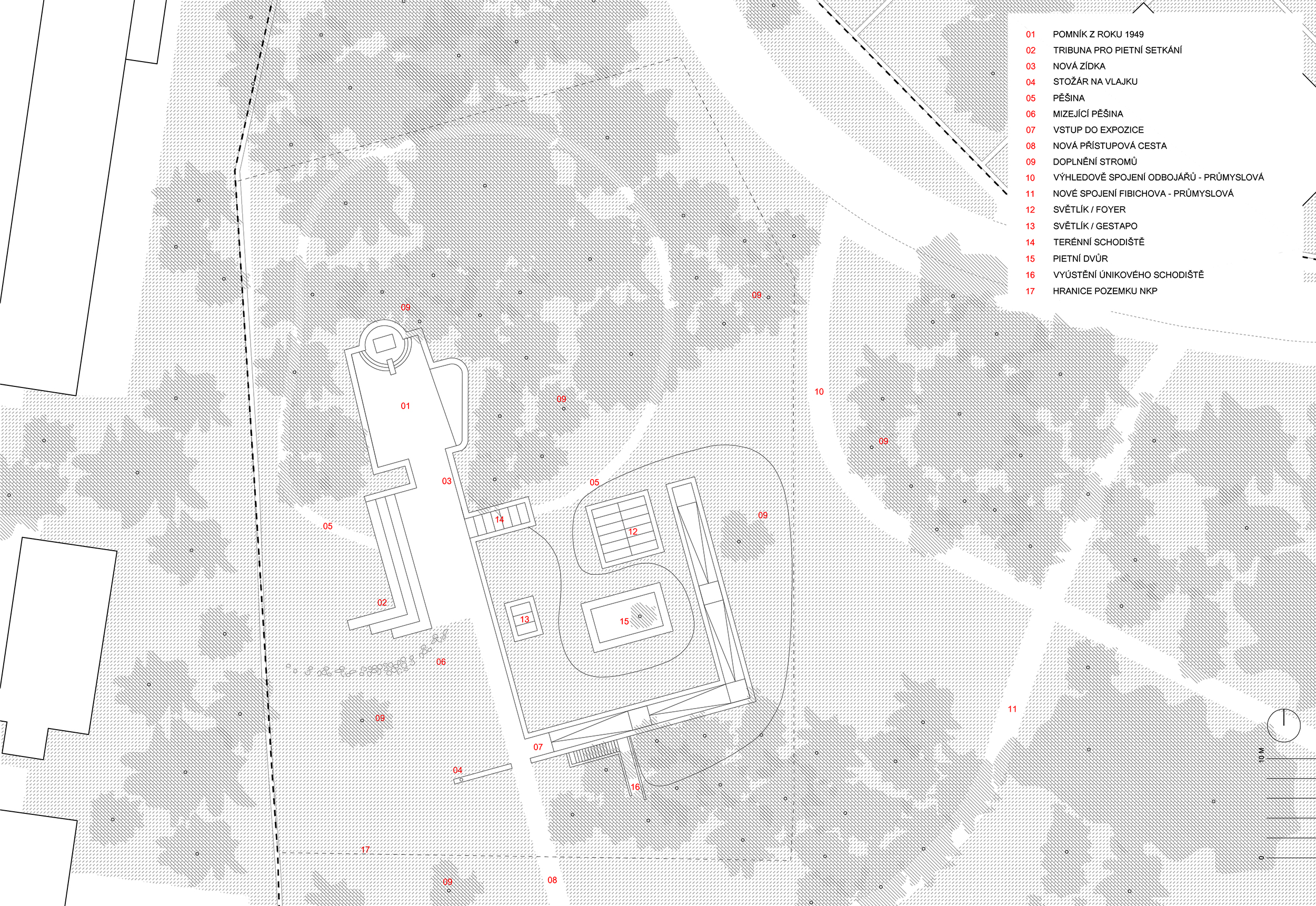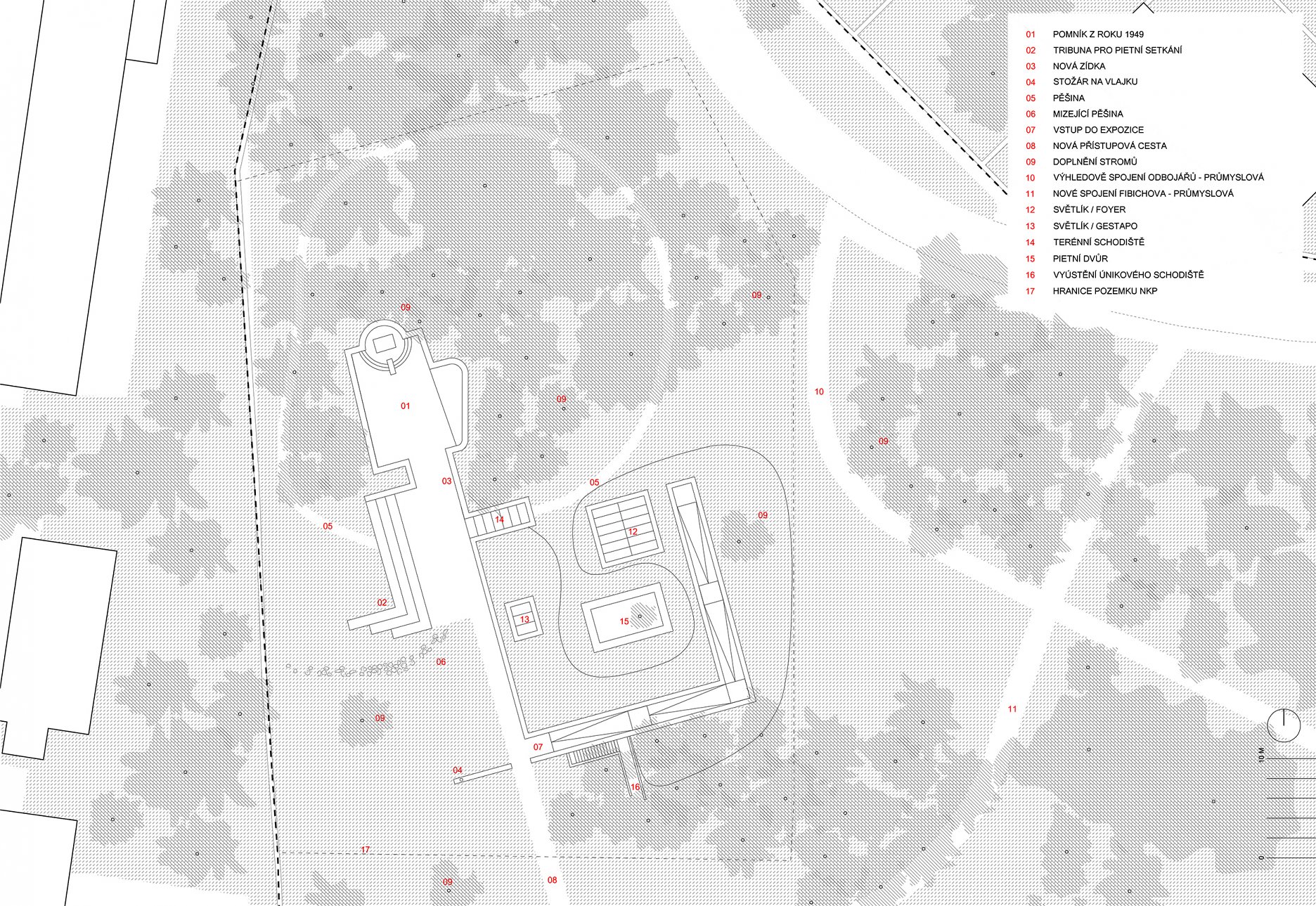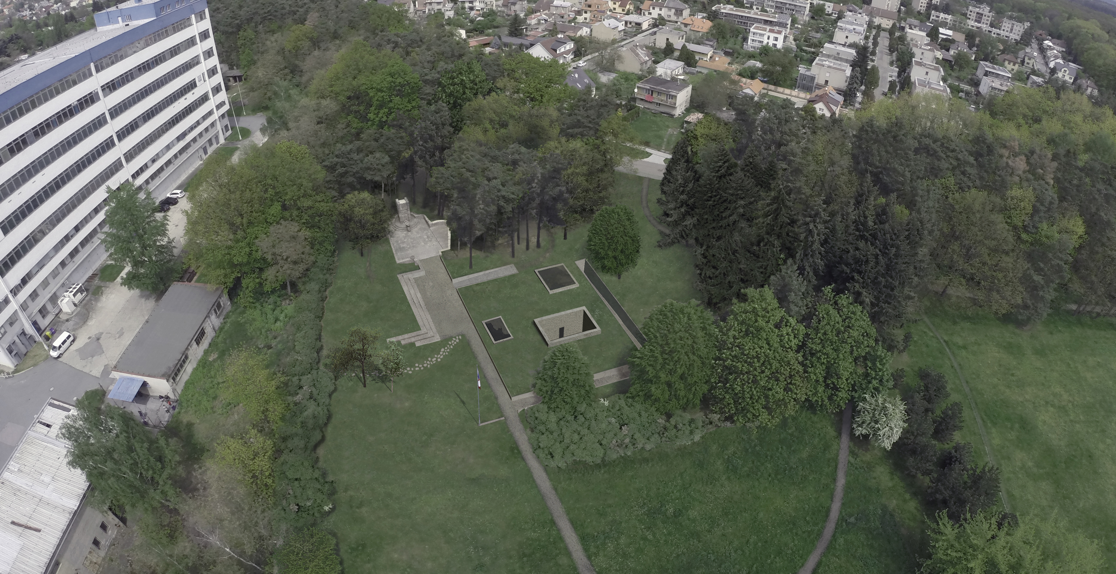 V areáli okolo pamätníka vznikla sieť nových peších ciest, ktorá sa drží prirodzených spojníc v lokalite, alebo reaguje na novovzniknuté súvislosti (začlenenie pamätníka do parku, odstránenie bariér, vznik nového parkoviska…). Nový pohľad na pietne územie otvára chodník, vedúci po piesočnom vale.