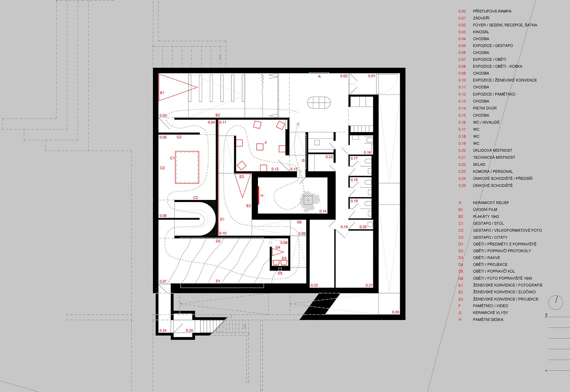 Dispozícia je koncipovaná tak, aby bolo možné celú expozíciu uzavrieť a kinosálu s foyer a ďalšími priľahlými priestormi využívať samostatne. Počas rôznych udalostí (prednášky, stretnutia, výučba, detský program…) zostáva pietny dvor stále prístupný.