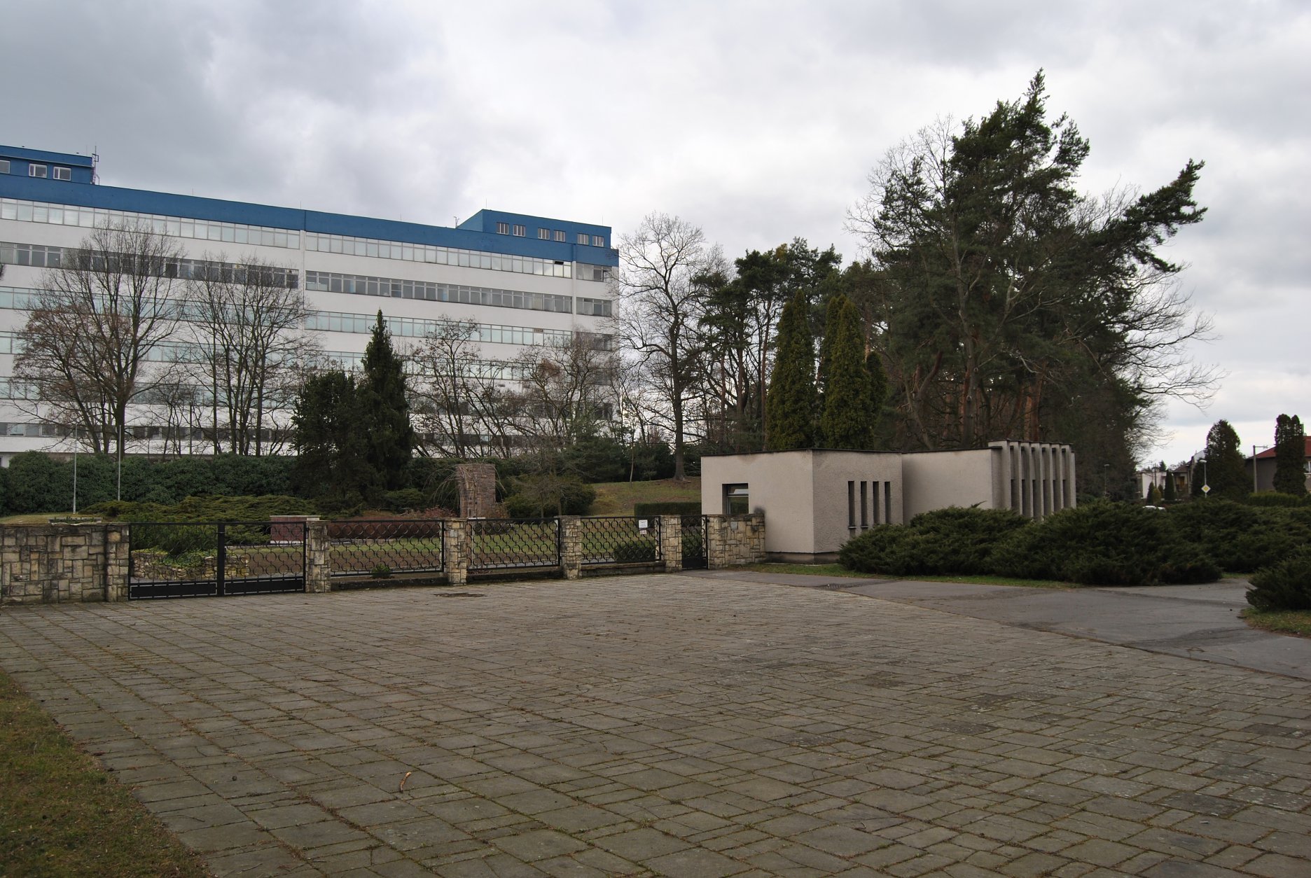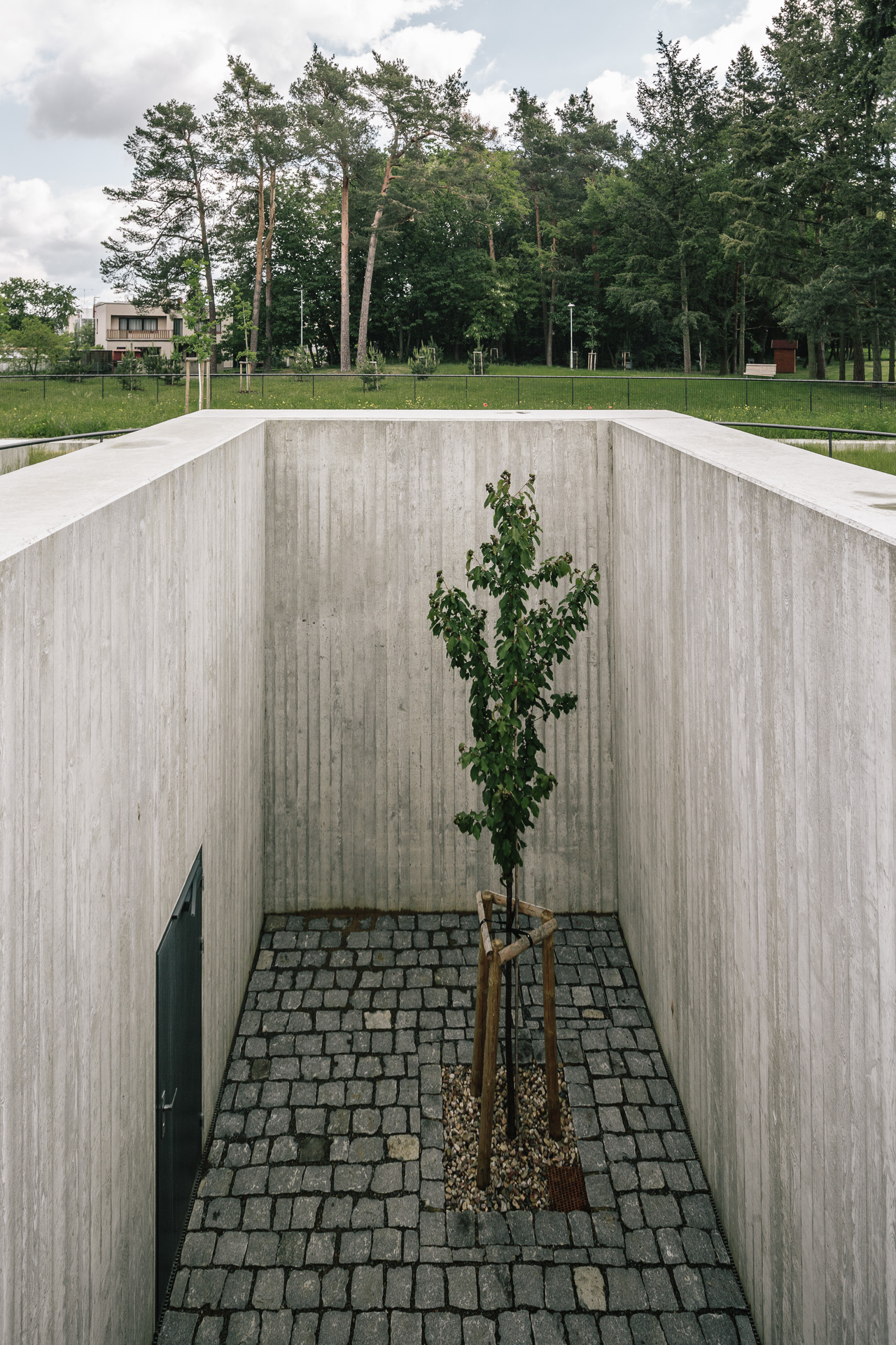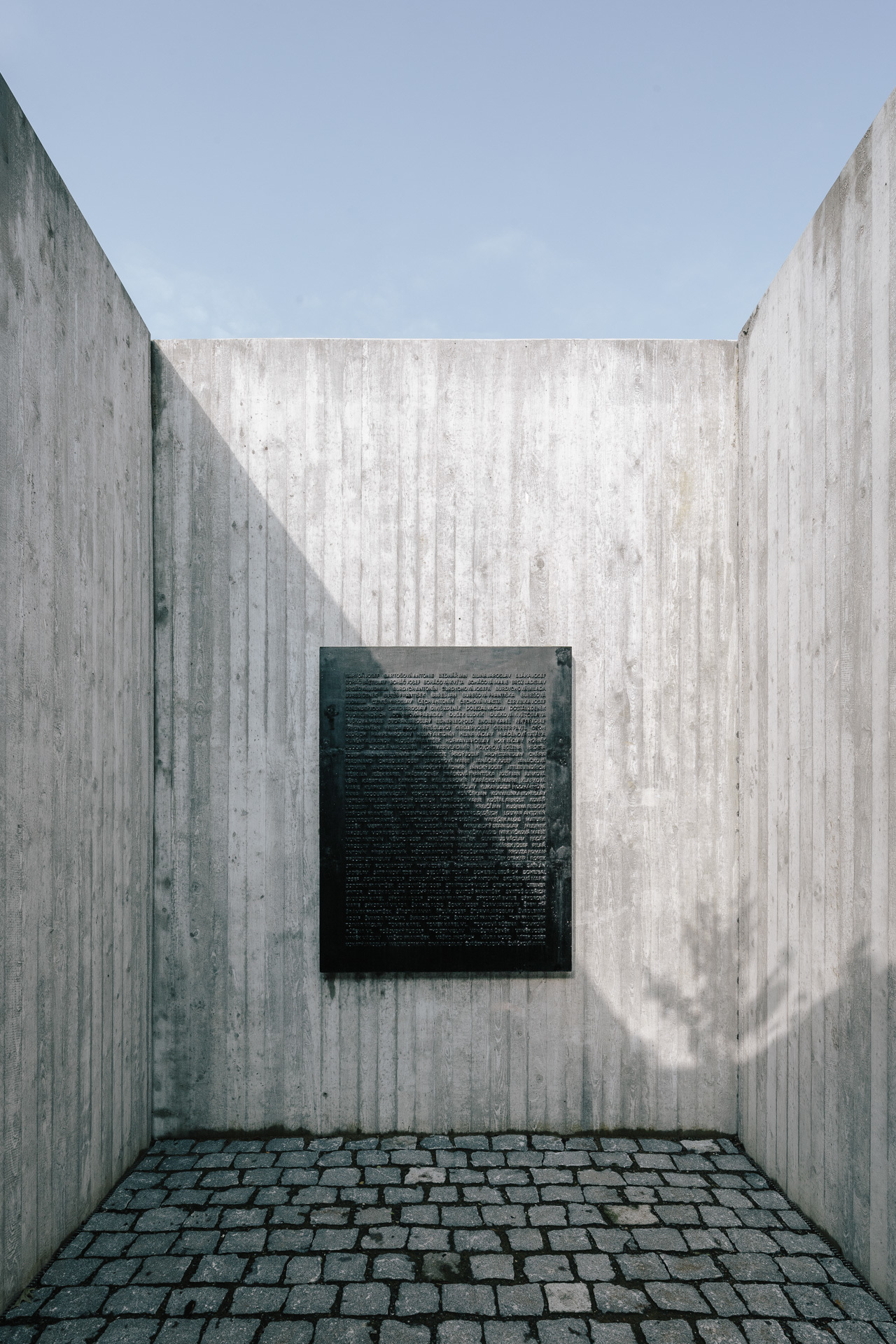 Tesne pred návratom do foyer prechádzajú návštevníci okolo pietneho dvora s pamätnou tabuľou. Len štyri steny, čerešňa a nebo nad hlavou.