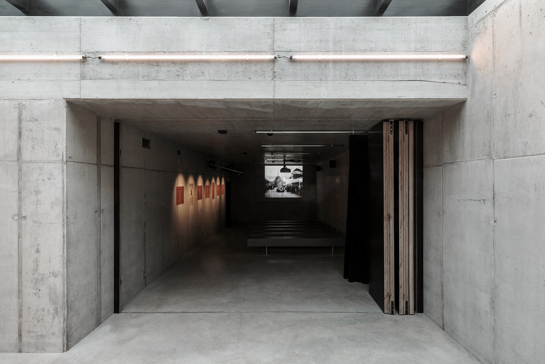 Pohľadový betón v exteriéri aj interiéri dopĺňajú ďalšie surové materiály - robustné oceľové vstupné vráta, masívne drevené lavice, železné rámy vitrín, pozinkované dvere a stôl v expozícii, nábytok z vodeodolnej preglejky, alebo asfaltová pamätná doska.