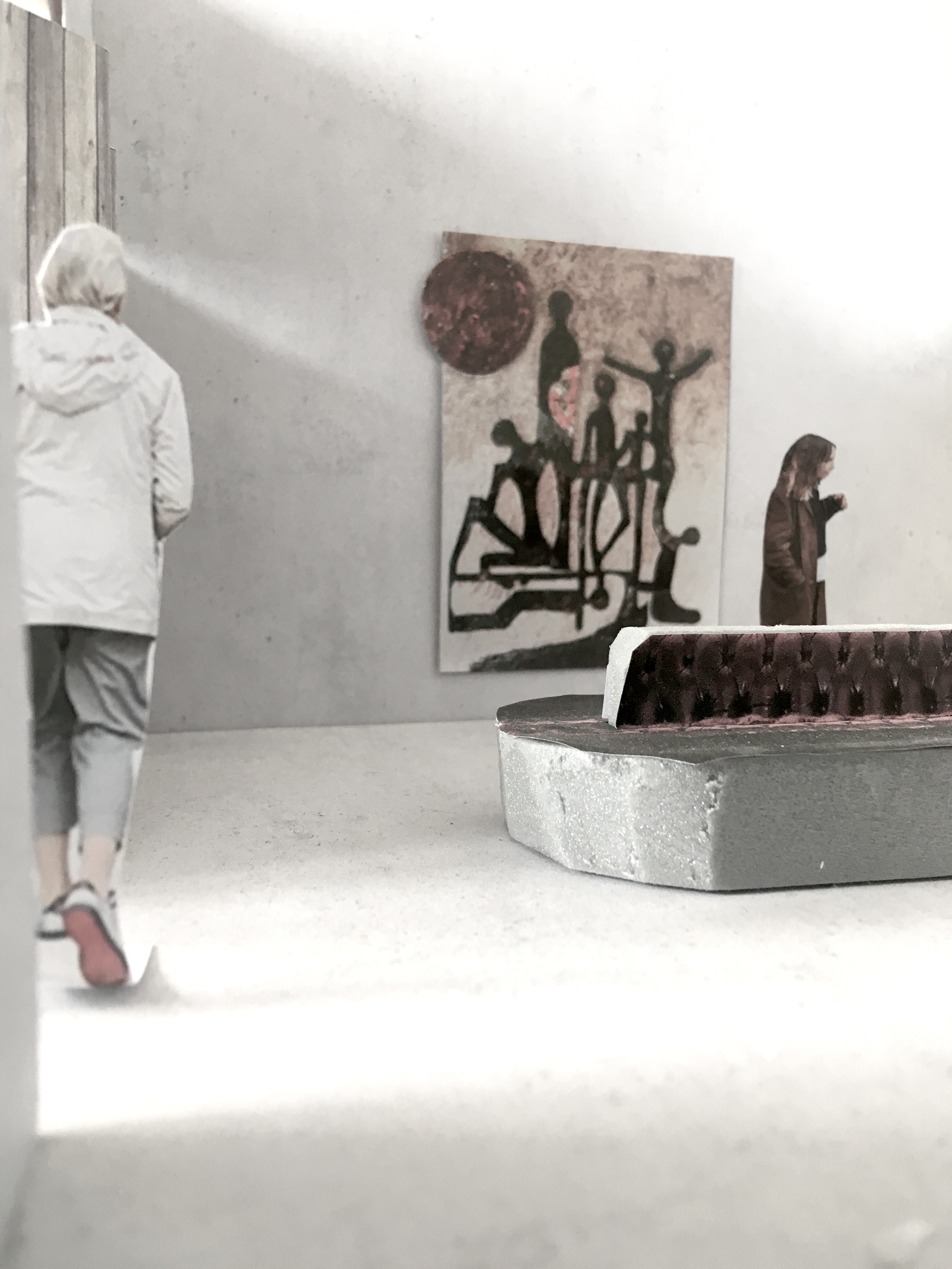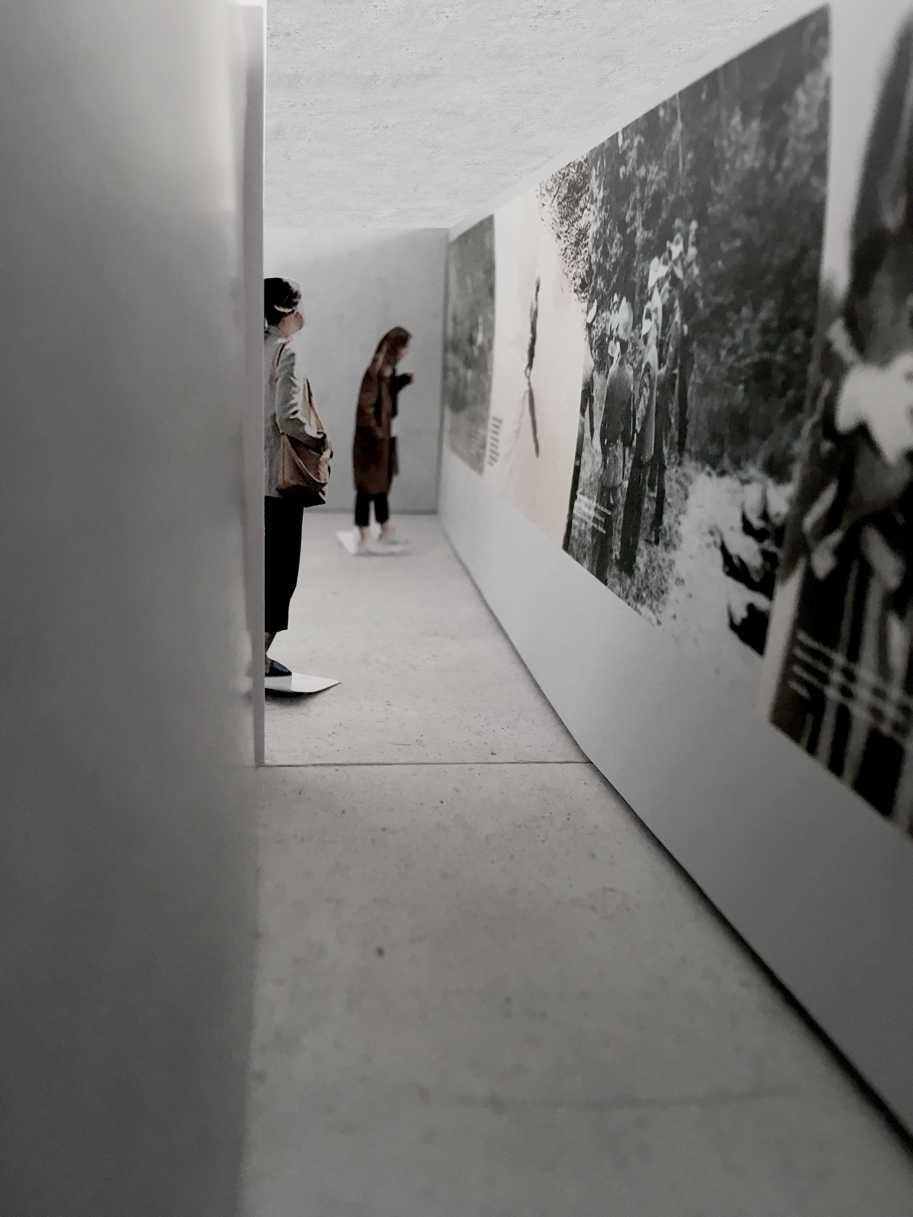 Následne sa sklon rámp obracia a začína postupne stúpať. Úzka chodba stavia návštevníka tesne pred rozmerné fotografie približujúce Ženevské konvencie - medzinárodné dohovory uzavreté po roku 1945. Téma potrestania zločincov pripomína videozáznam z Norimberského procesu aj prehľad povojnových osudov vrahov z nacistického popraviska Zámeček.
