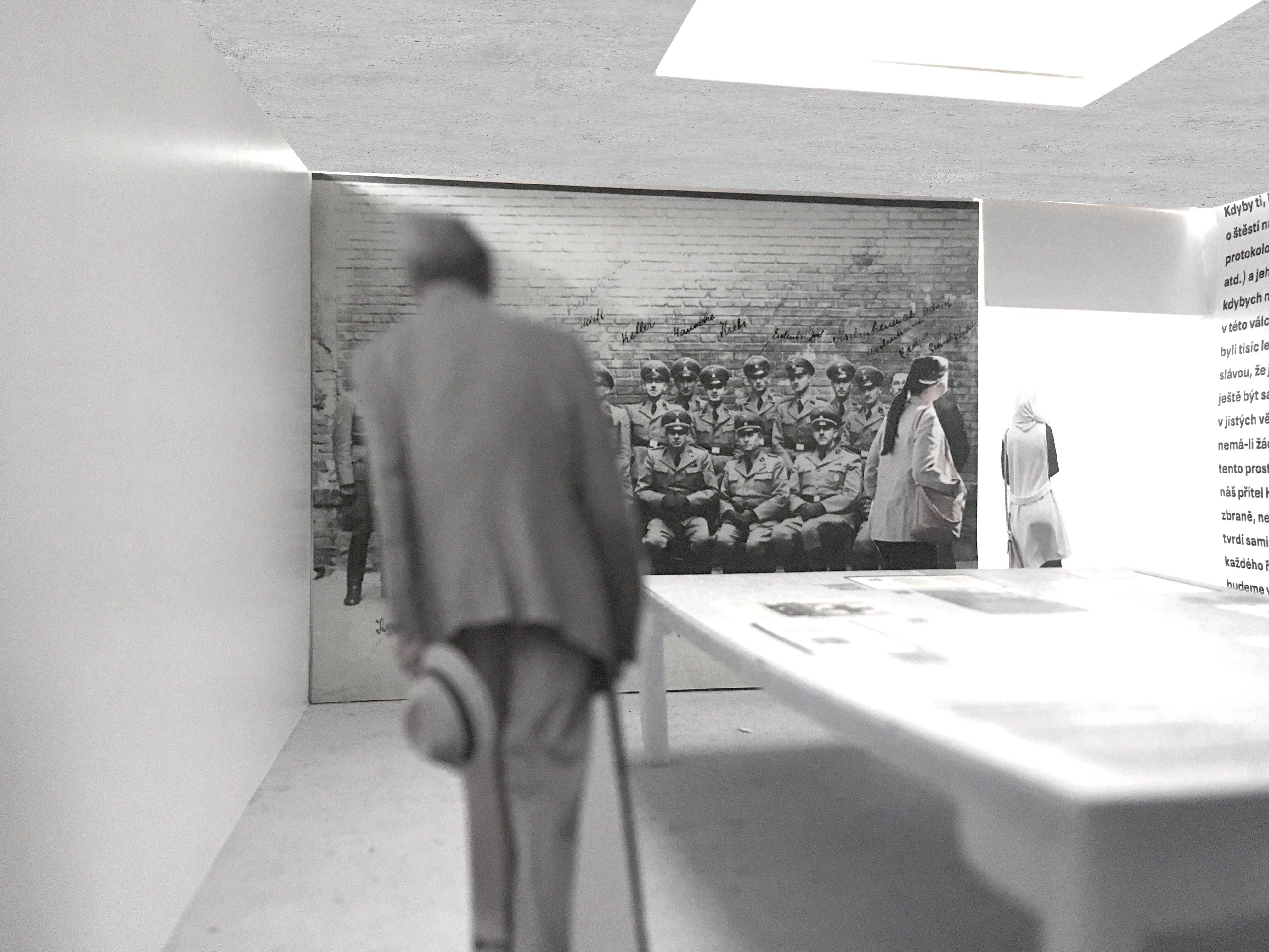 Expozícia následne pokračuje miestnosťou s obrazovkami, z ktorých sa prihovárajú preživší a pamätníci vtedajších udalostí. Znásobenie toho istého obrazu zdôrazňuje mrazivosť svedectva.