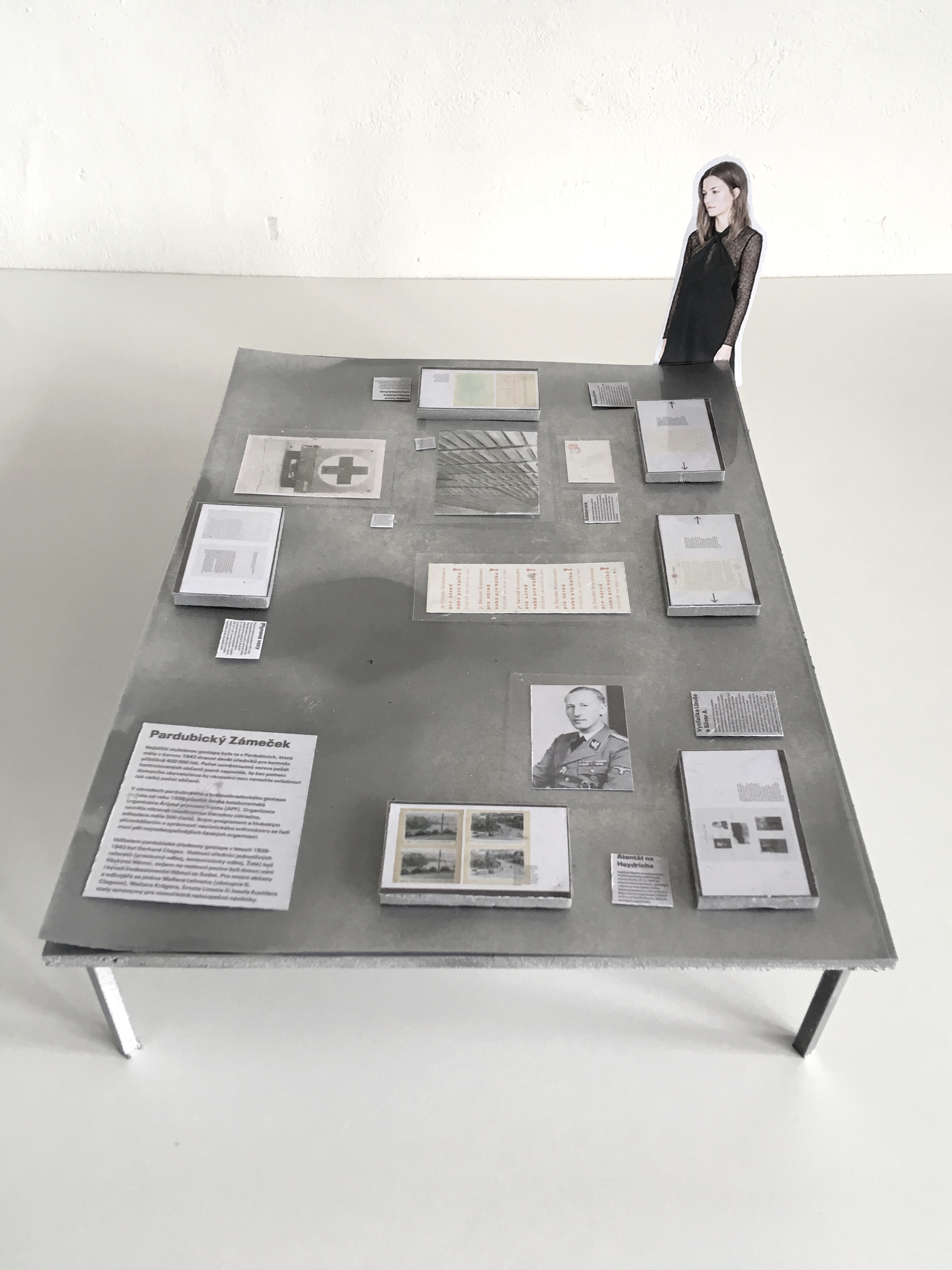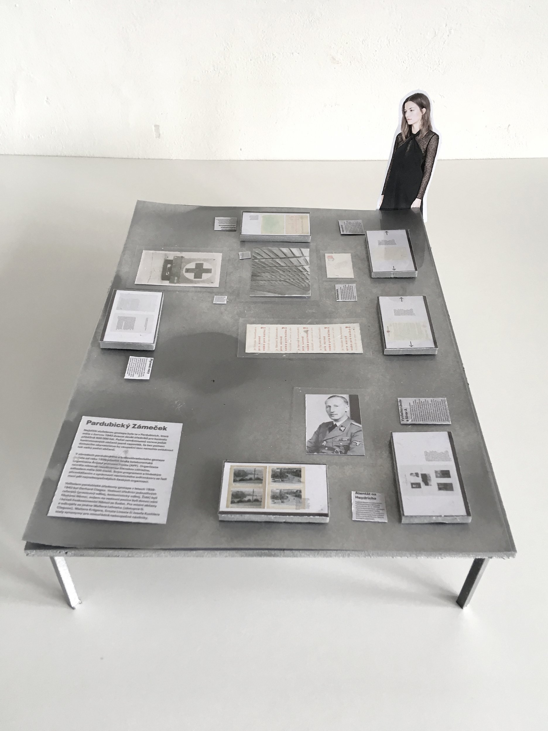 Nasledujúca miestnosť pripomína administratívnu precíznosť nacistického aparátu a jeho korene. Návštevník sa ocitá v „pracovni“ s horným osvetlením s množstvom dokumentov, v ktorých môže listovať (udanie, zoznamy deportovaných Židov, priebeh heydrichiády v Pardubiciach...) za „dohľadu“ členov vtedajšej poriadkovej polície na nástenných, zámerne rozostrených fotografiách.
