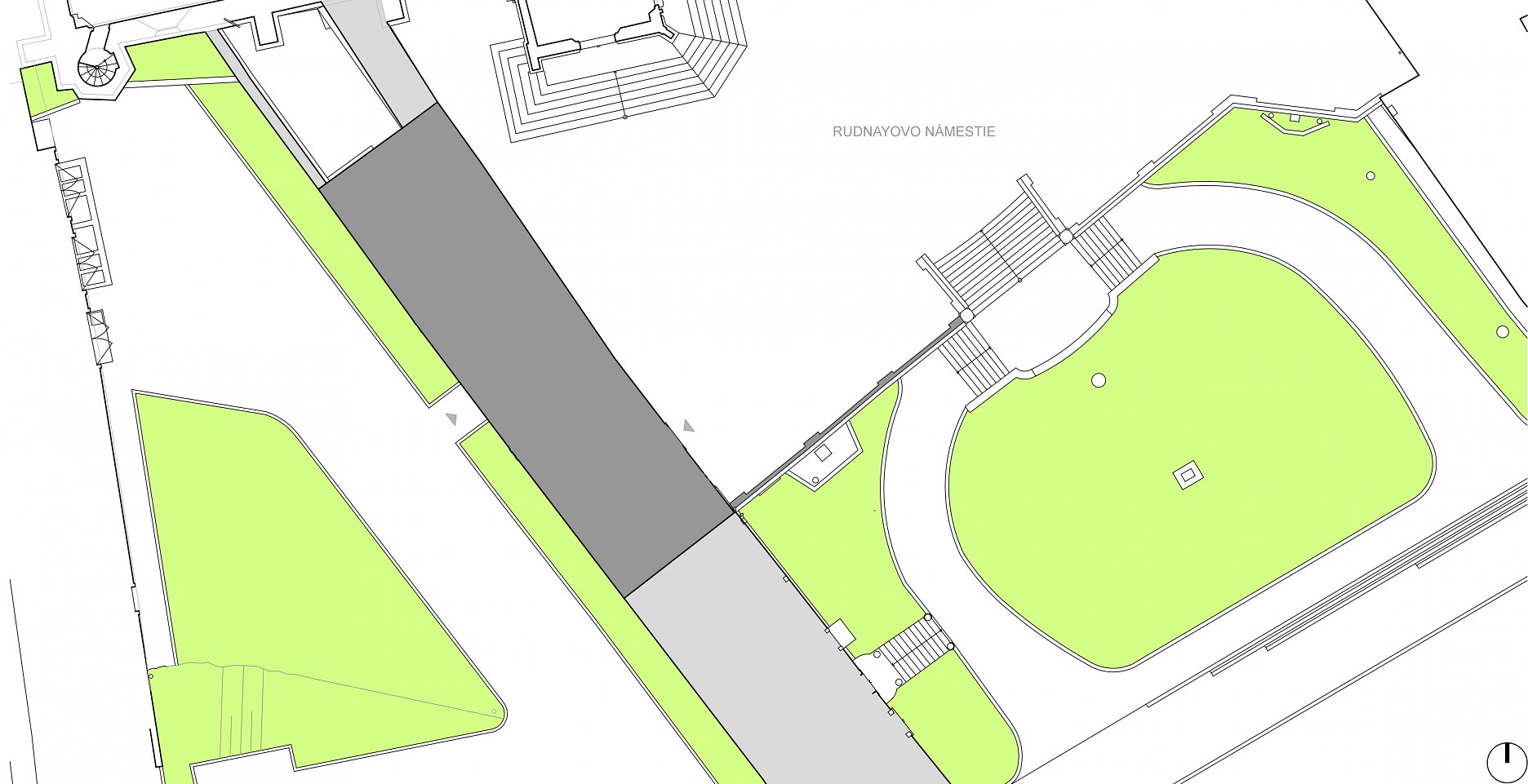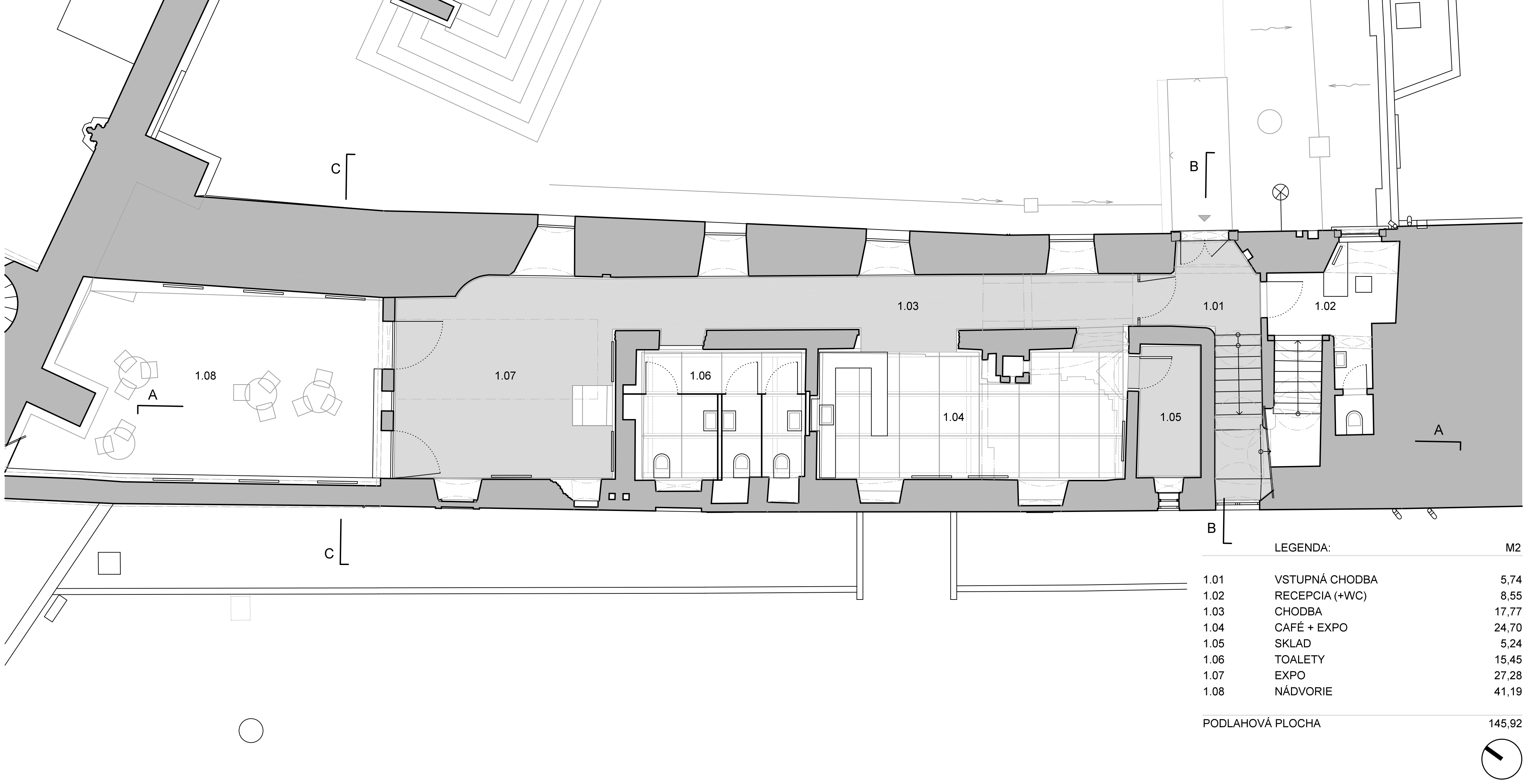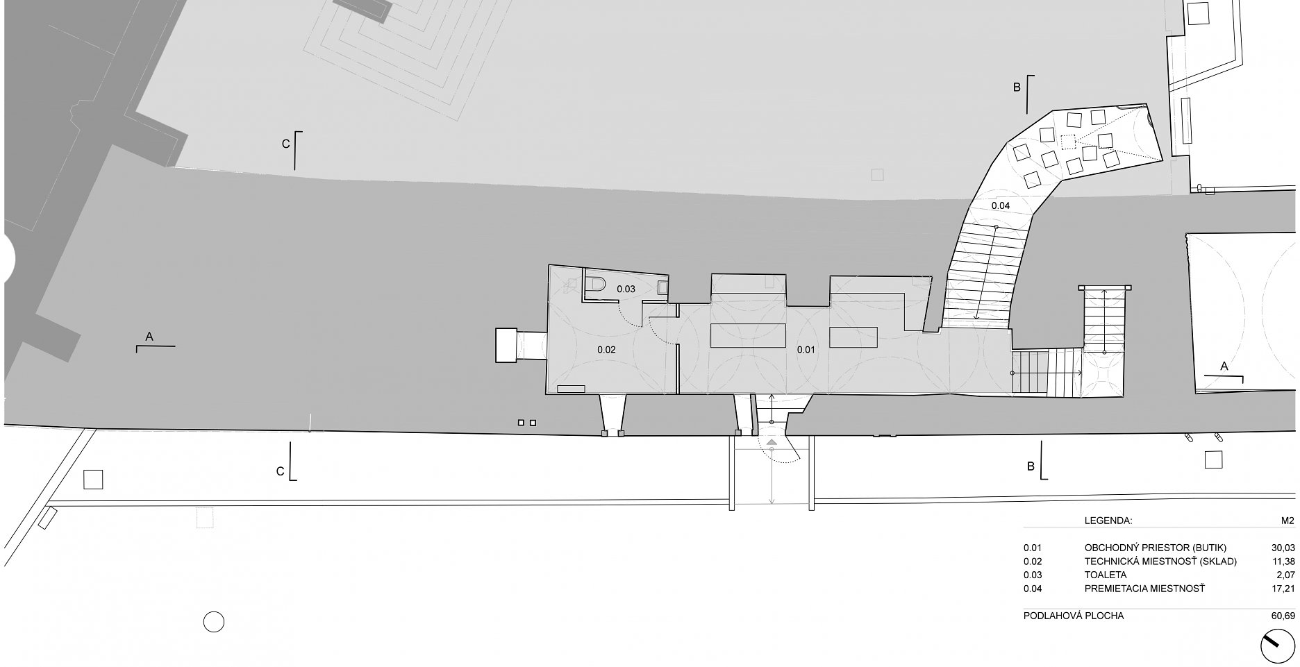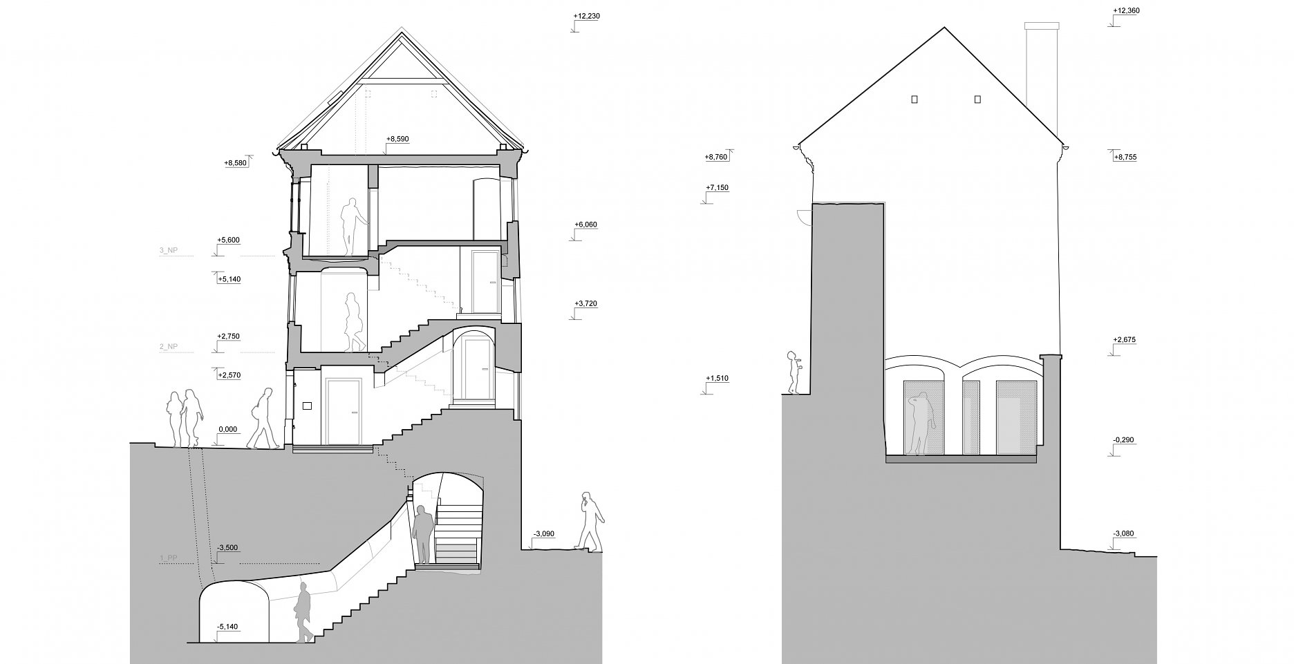 V súčasnosti uzavretý objekt dostane staronový vstup zo západnej strany, umožňujúci prístup pre verejnosť do pivničných priestorov, ktoré sú navrhnuté pre maloobchodnú prevádzku súvisiacu so samotnými hlavnými priestormi domu. Tie sú prepojené so suterénom pôvodným obnoveným schodiskom. Hlavný vstup do objektu je navrhnutý na pôvodnom mieste, od ktorého sa prechádza pôvodne bytovou chodbou do samotných výstavných priestorov. Nachádza sa tu aj hygienické jadro a prevádzka drobného občerstvenia s obslužnými priestormi. Malý nezastavaný priestor, oddeľujúci predmetný objekt od svätomartinského dómu, je podľa návrhu určený pre exterérové výstavy alebo pre potreby prevádzky ako letná terasa.