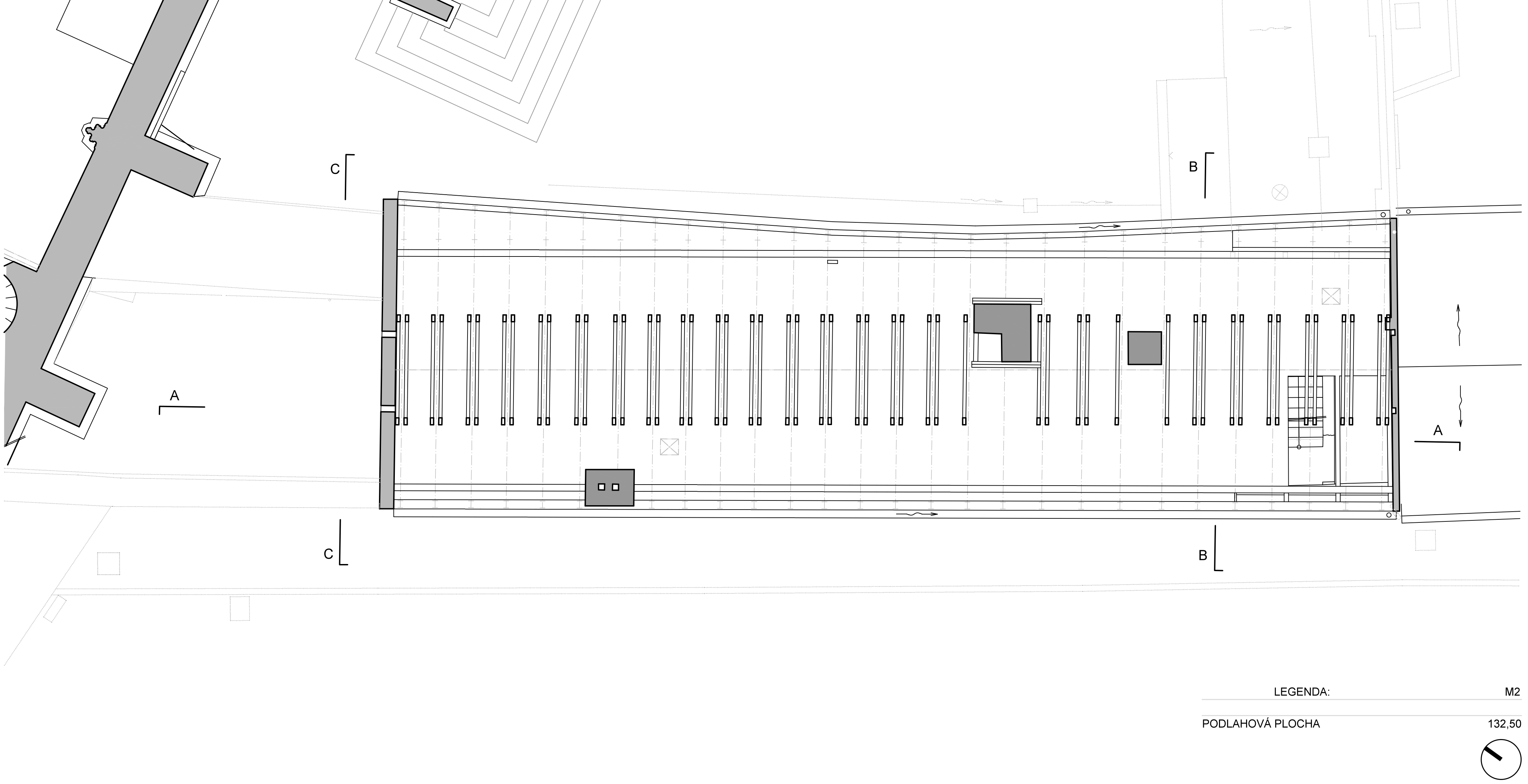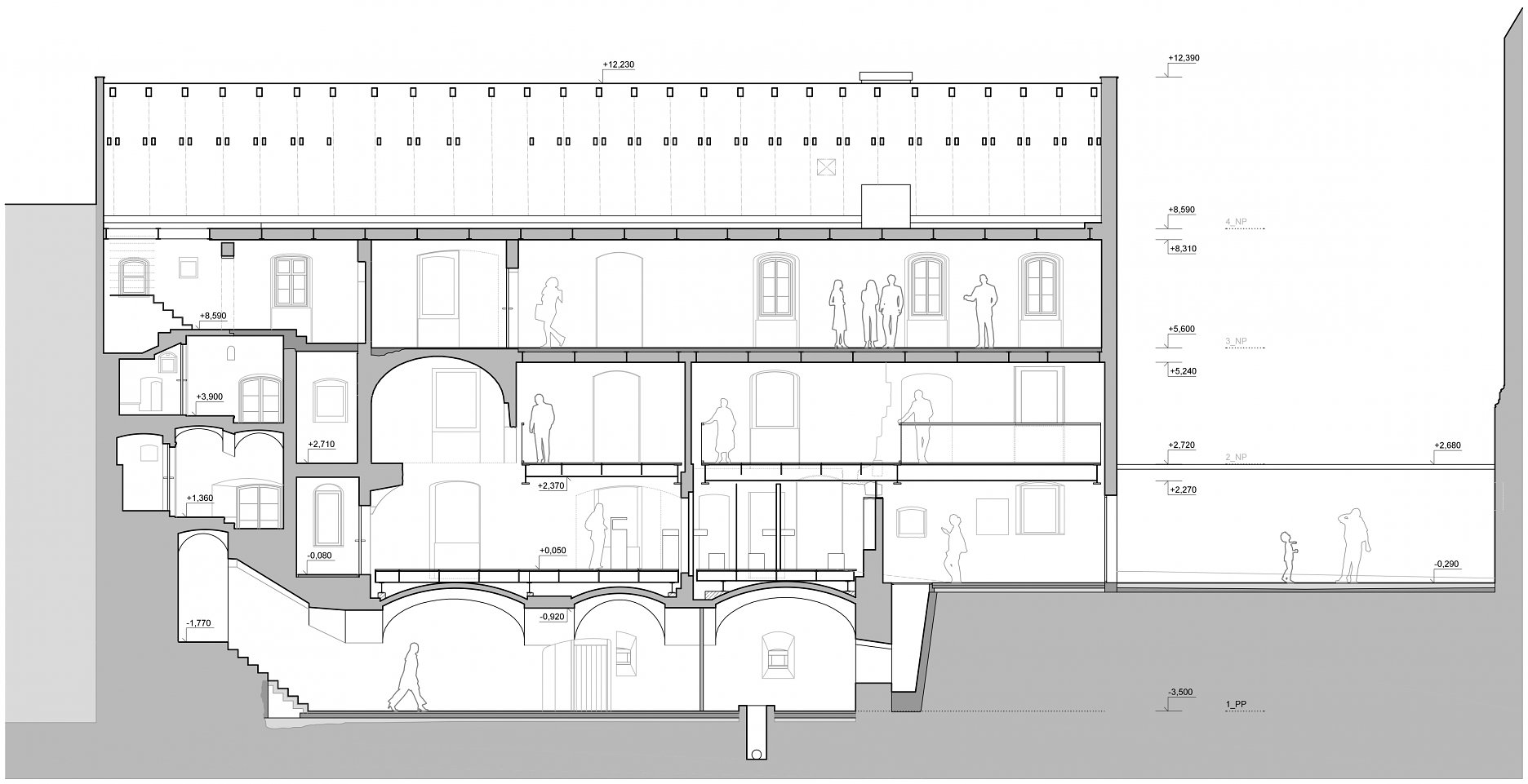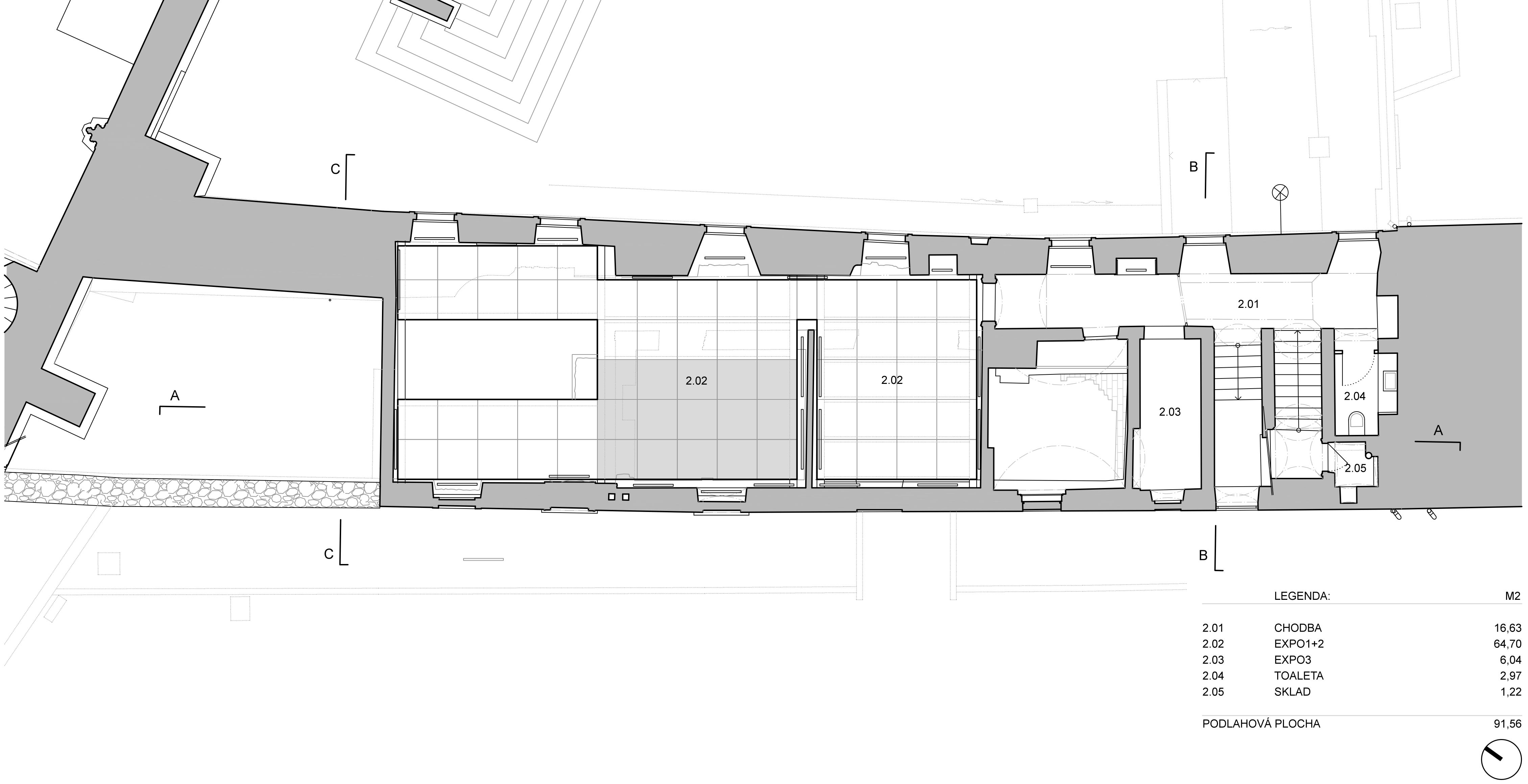 Vyššie podlažia sú prístupné obnoveným pôvodným schodiskom. Na 2NP sú navrhované ďalšie expozičné priestory, ktoré sa zväčša nachádzajú na tzv. vloženom interiéri - ide o celkovú ideu "vloženia sa" do interiéru pamiatky pomocou subtílnych až priehľadných materiálov, ktoré vyjadrujú pokoru a rešpekt voči historickej substancii. Tá by mala byť vhodnými svetelnými a architektonickými prvkami zvýrazená a prezentovaná ako samotný predmet výstavy. V priestoroch 2NP ide najmä o novonavrhovaný priehľadnú podlahu, vytvárajúcu akúsi galériu s prízemím.