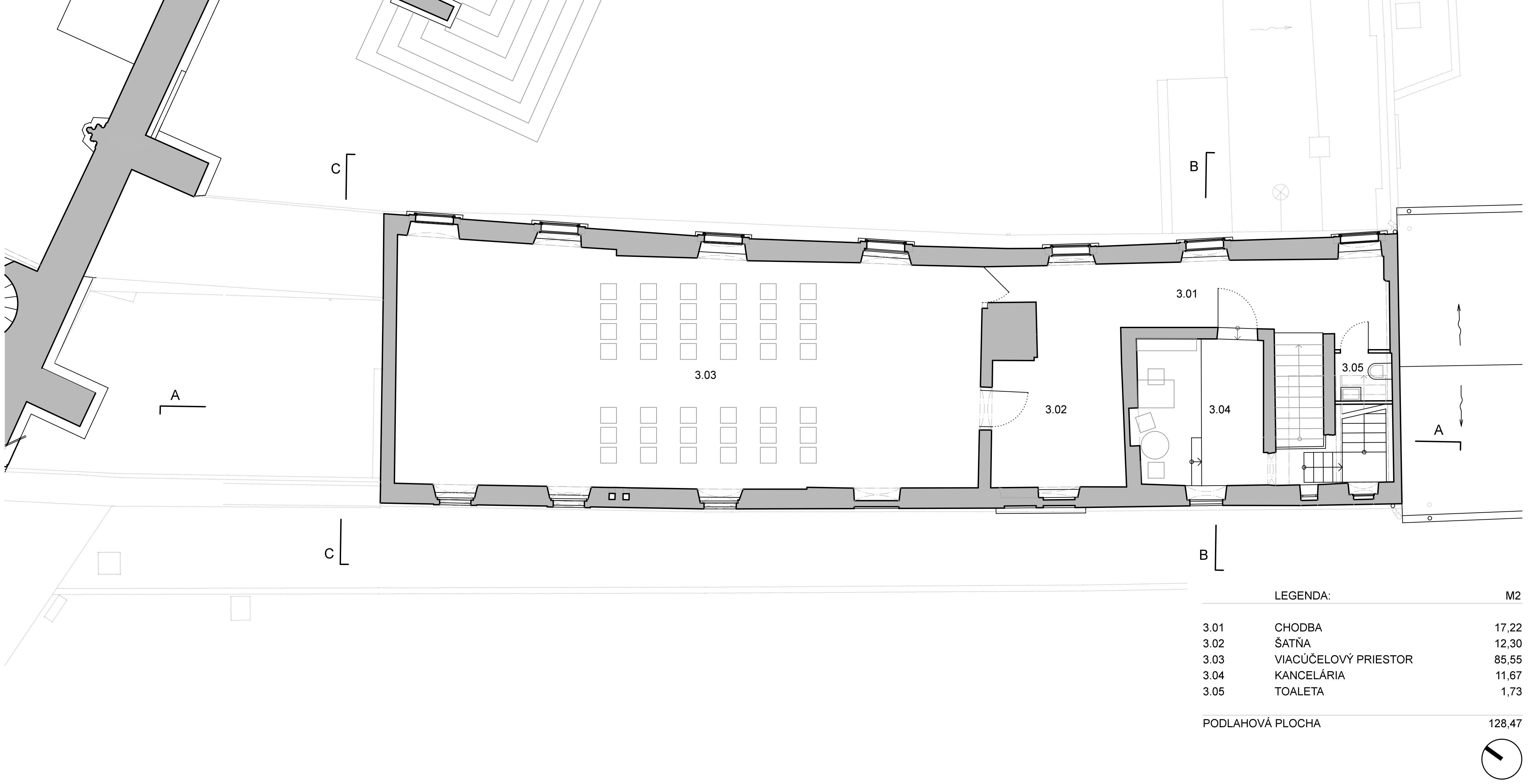 Na 3NP sa už nachádzajú priestory pre zhromaždenia poloverejného charakteru, určené pre konferencie, semináre a besedy. Taktiež tu má celý objekt administratívne zázemie a z neho prístup do podkrovia, ktoré by mohlo byť využívané ako depozitár vystavovaných a iných predmetov.