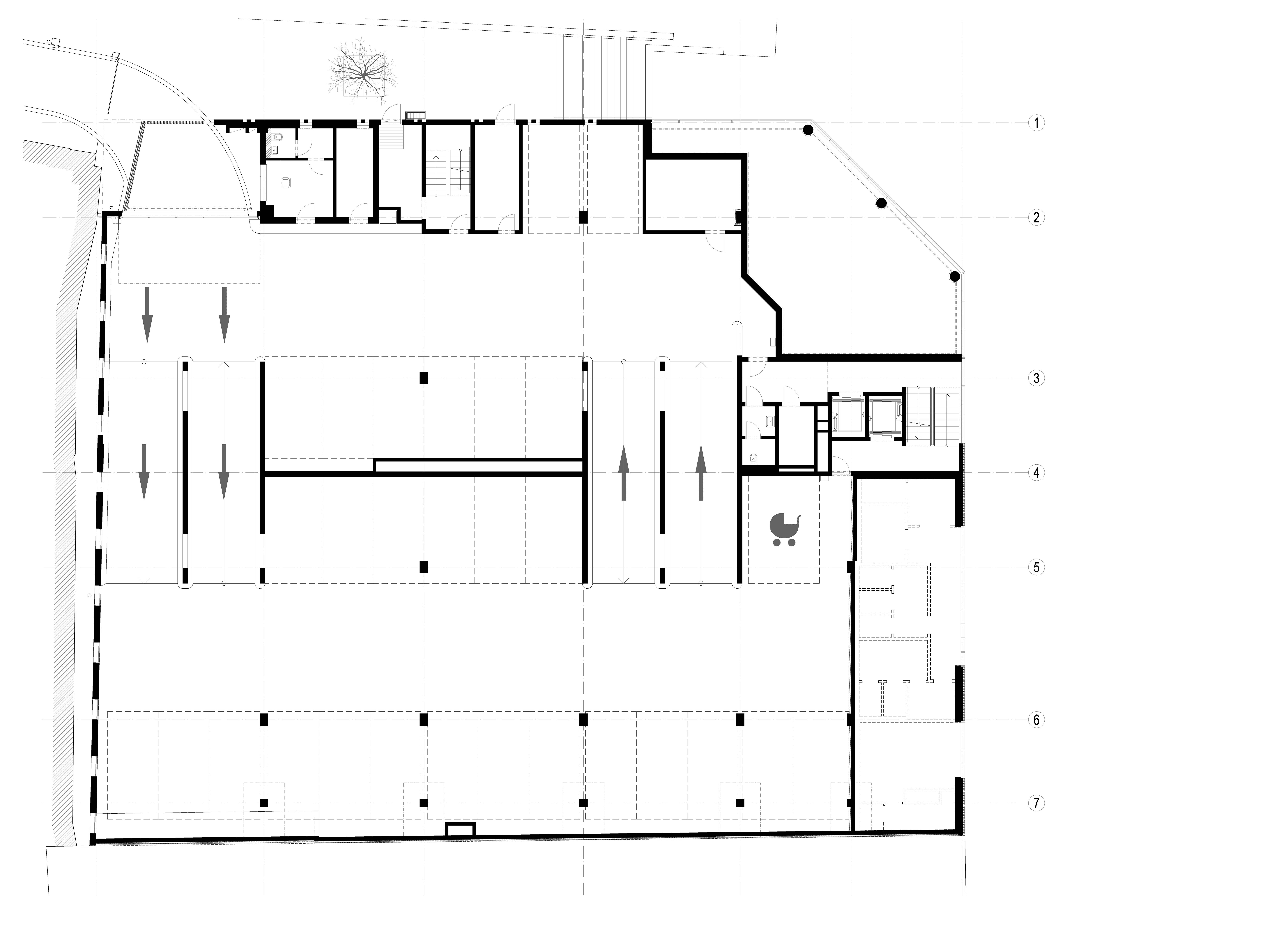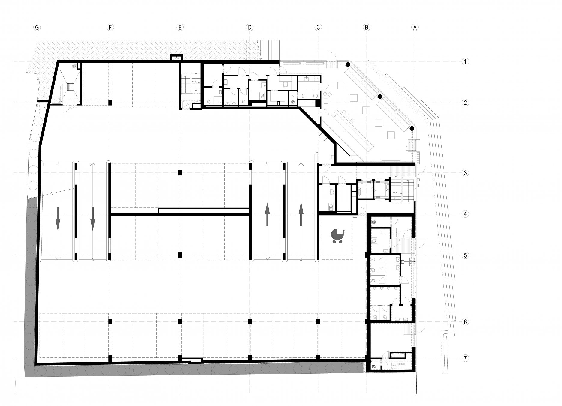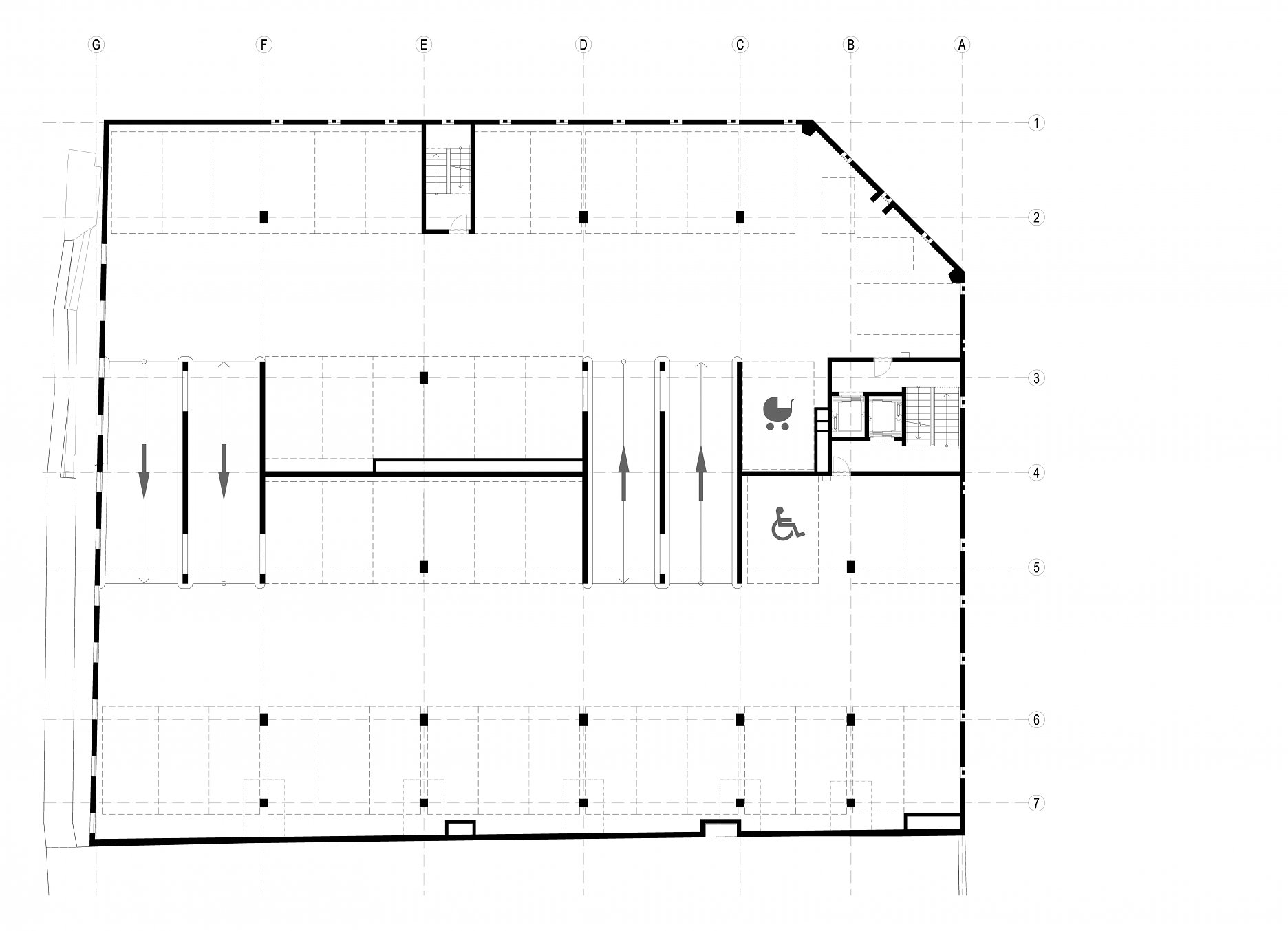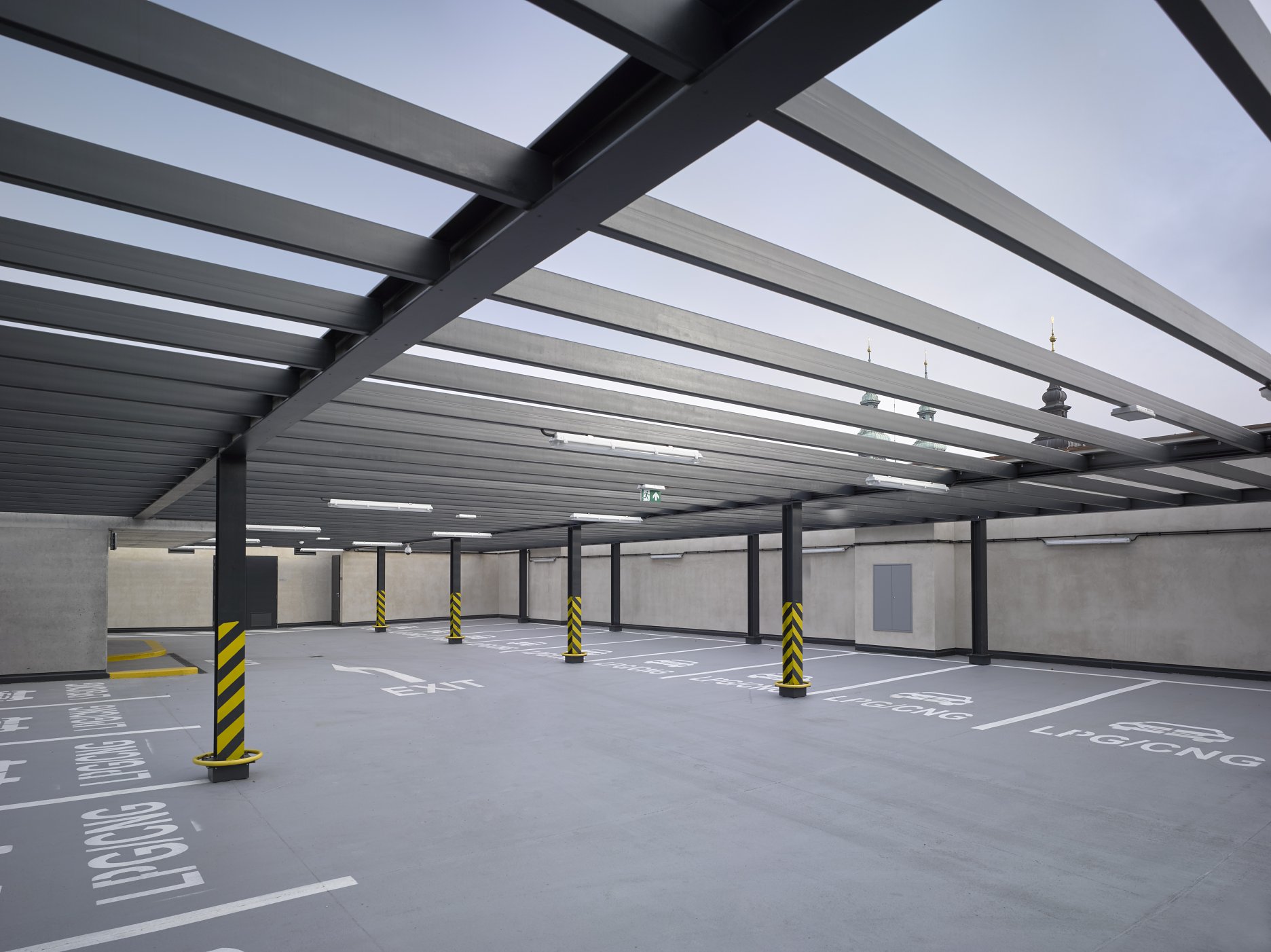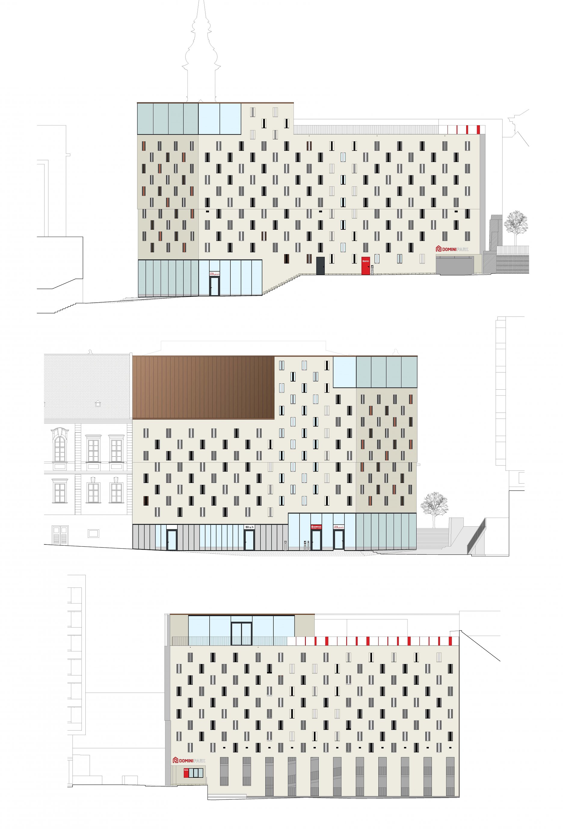 Parkovací dom má kapacitu 360 vozidiel v dvoch viacpodlažných blokoch parkovacích státí. Bloky sú voči sebe posunuté o pol podlažia. Jednosmernú prevádzku zabezpečuje systém polorámp.