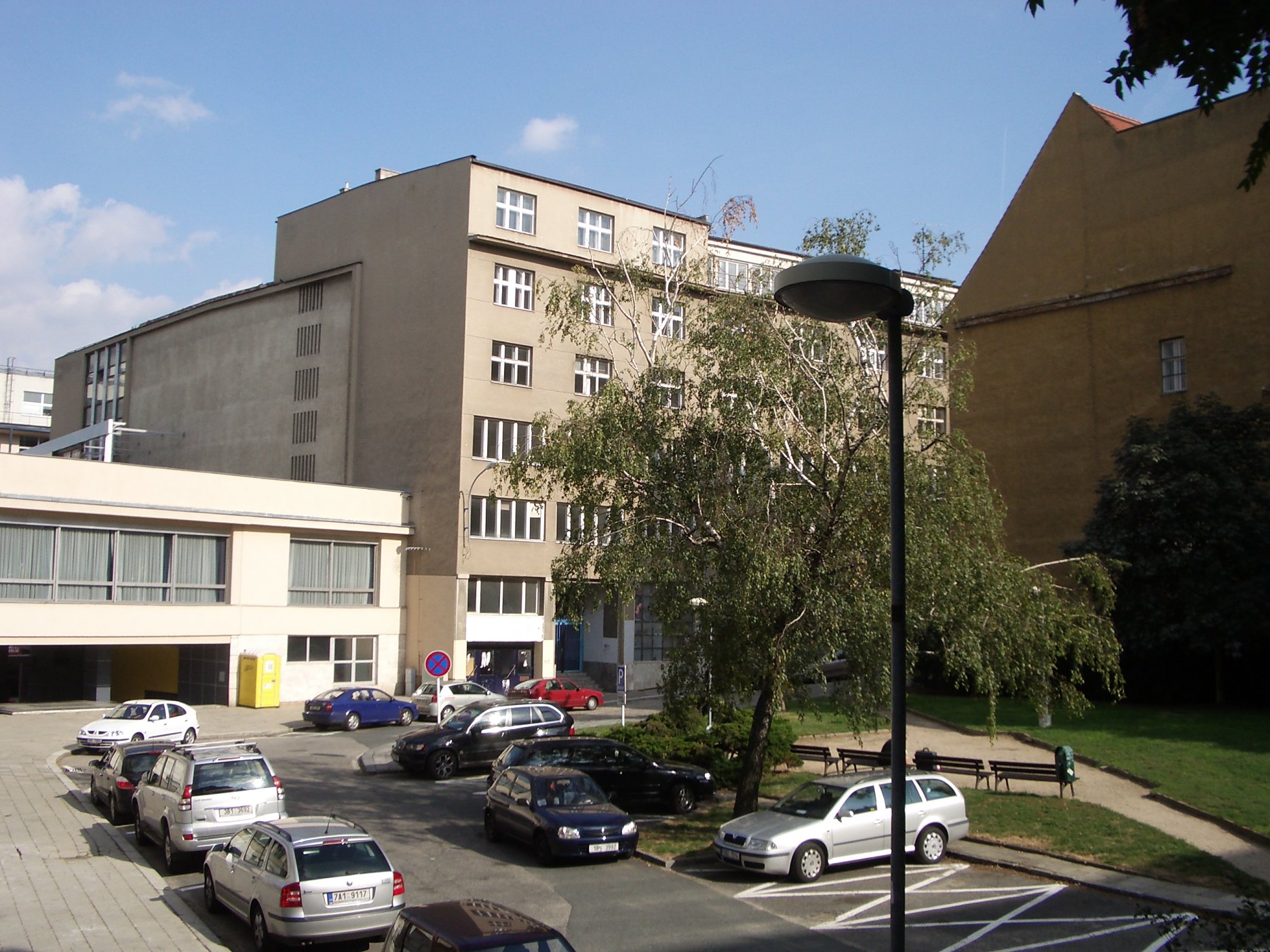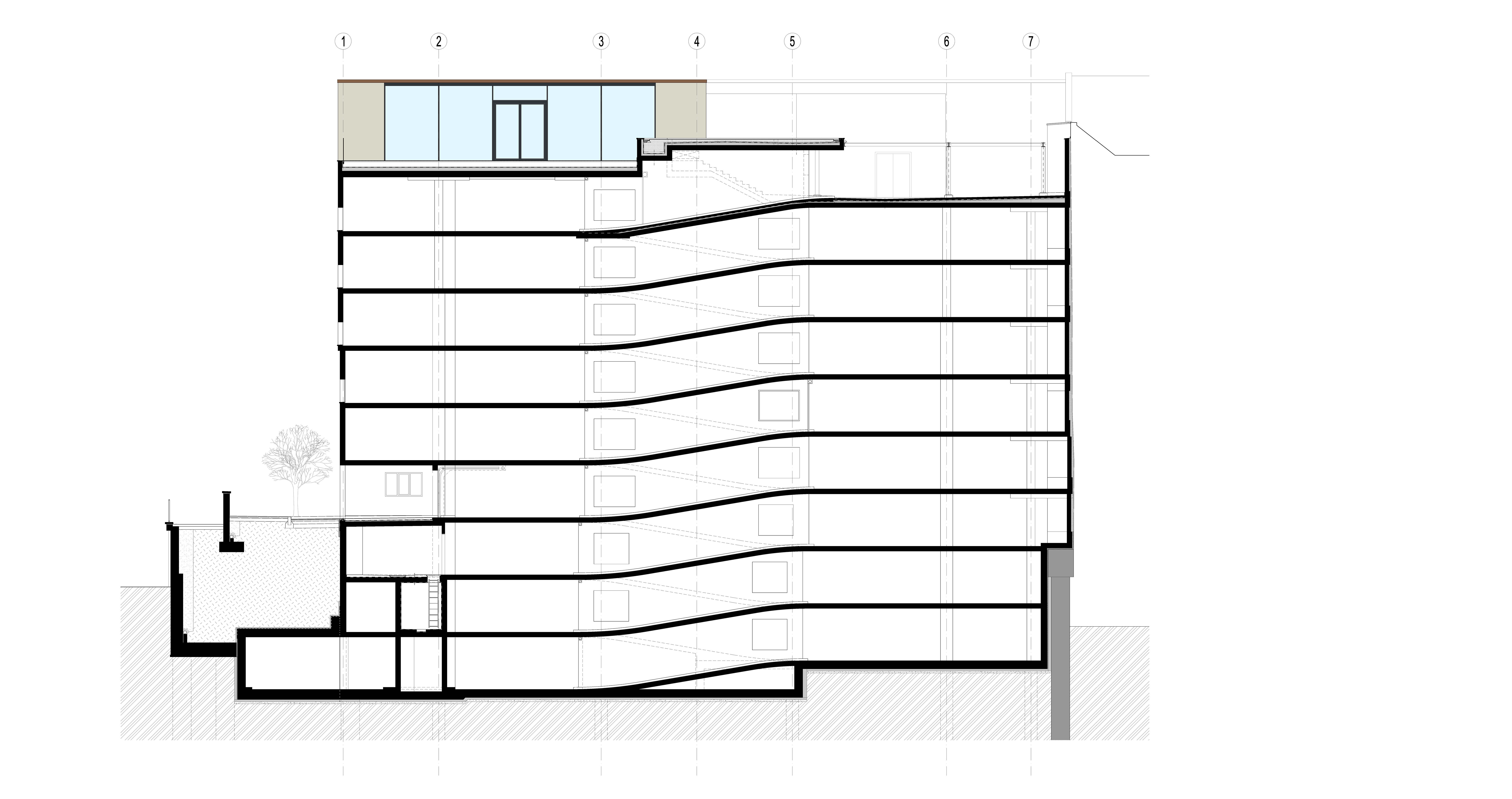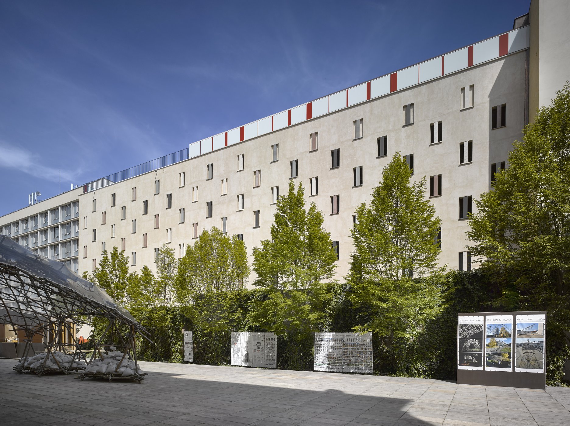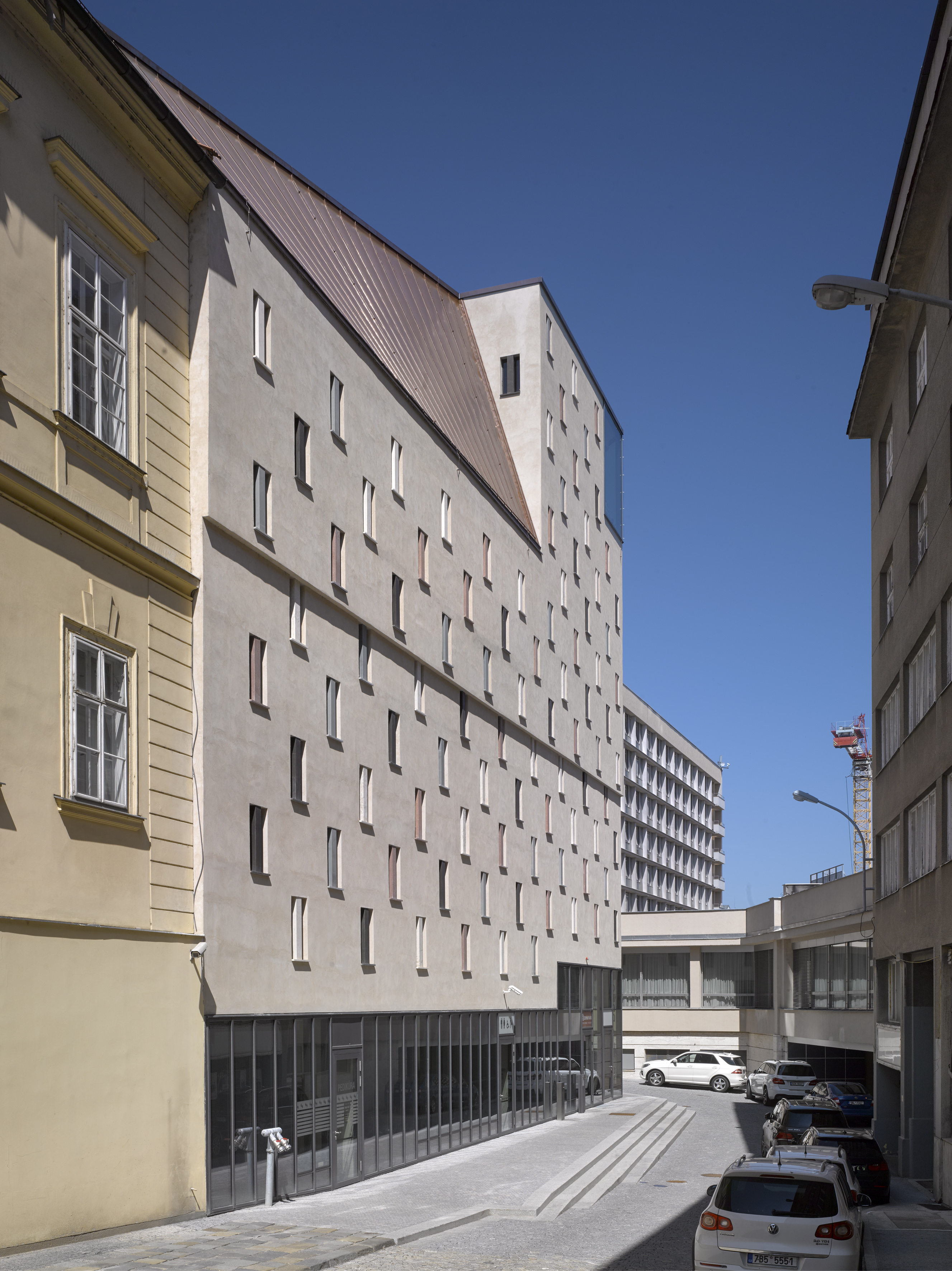 Konštrukciu budovy tvorí železobetónový monolitický skelet založený na pilótach. Stavba má dve podzemné a osem nadzemných podlaží. Dvojdielne otvory v parkovacích podlažiach zabezpečujú prirodzené vetranie priestorov. Fasáda je omietnutá dvojvrstvovou vápennou omietkou s jemnou nepravidelnou textúrou. Veľké monochromatické plochy oživujú prvky z prírodného kameňa - okenné stĺpiky, parapety, krytie atík, ríms a sokle. takmer klasické remeselné detaily odkazujú na susediace objekty.