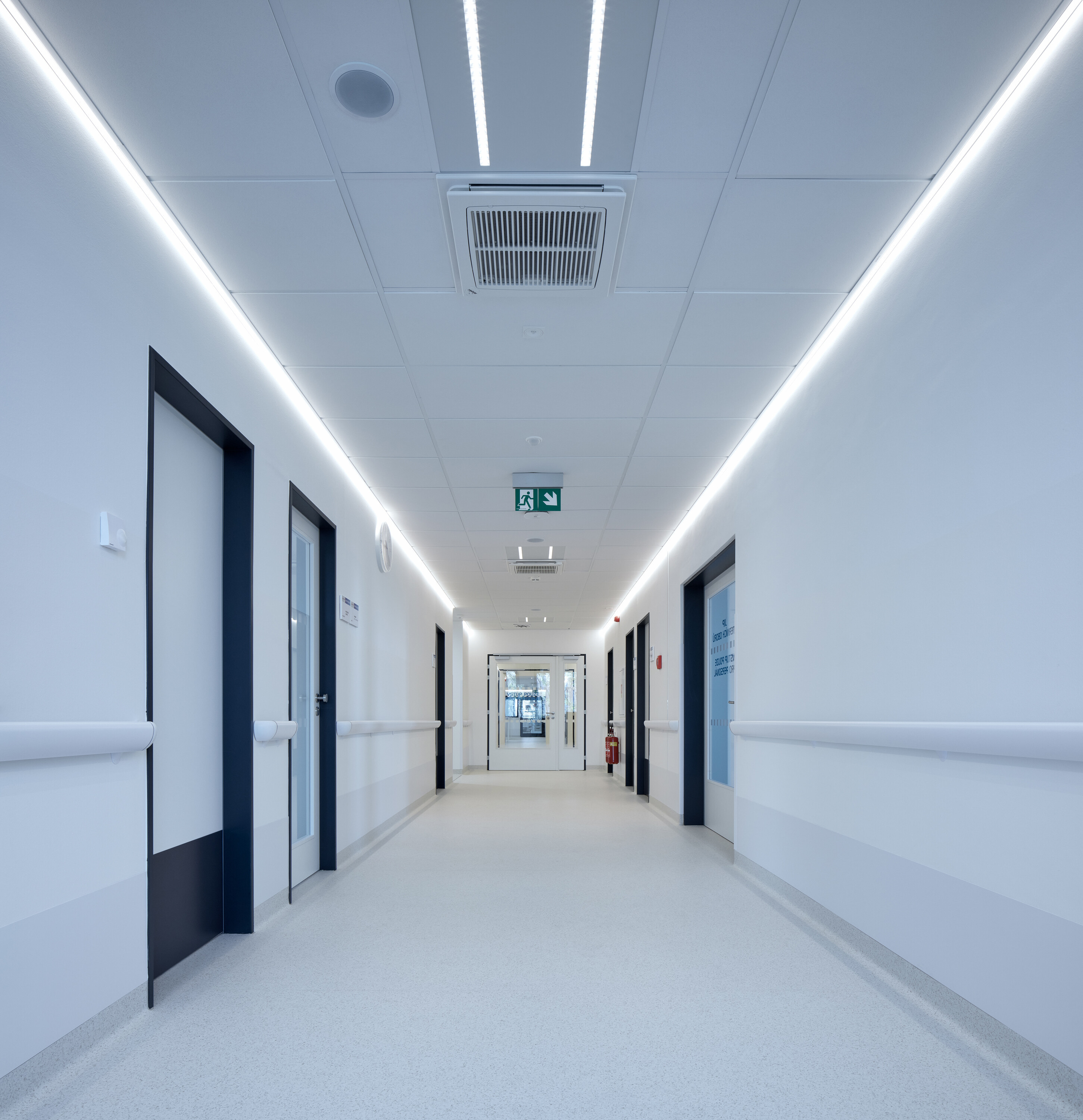 V pavilóne sa nachádza niekoľko prevádzok internej kliniky. Za recepciou nájdeme ambulanciu pre akútne prípady, odberové a zákrokové miestnosti, lôžkové izby a izby intenzívnej starostlivosti. Pri návrhu budovy bol kladený dôraz na variabilitu dispozícií a technologického vybavenia, kompaktný tvar, optimálny pomer pevných a presklených plôch, akustiku a vnútornú klímu.