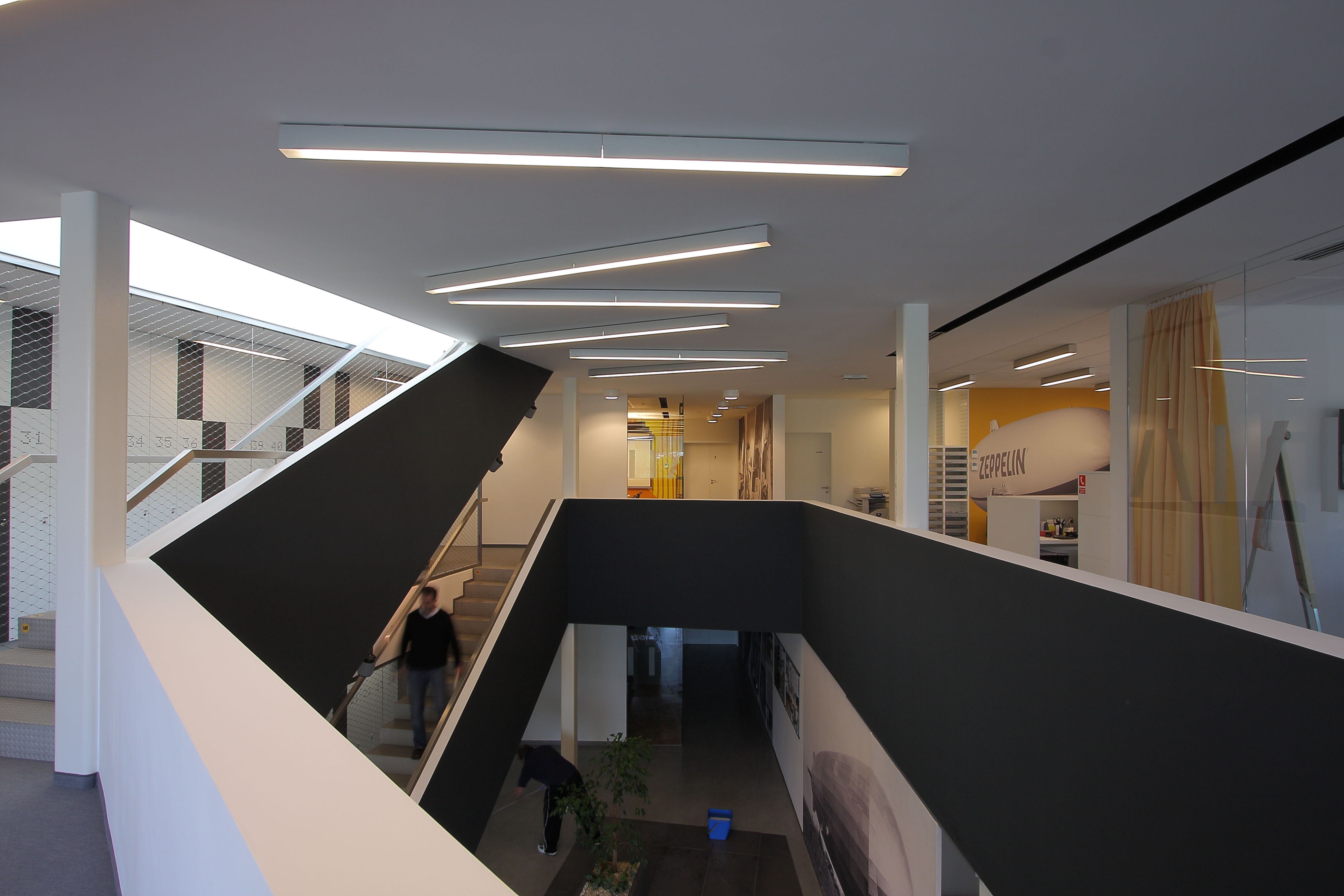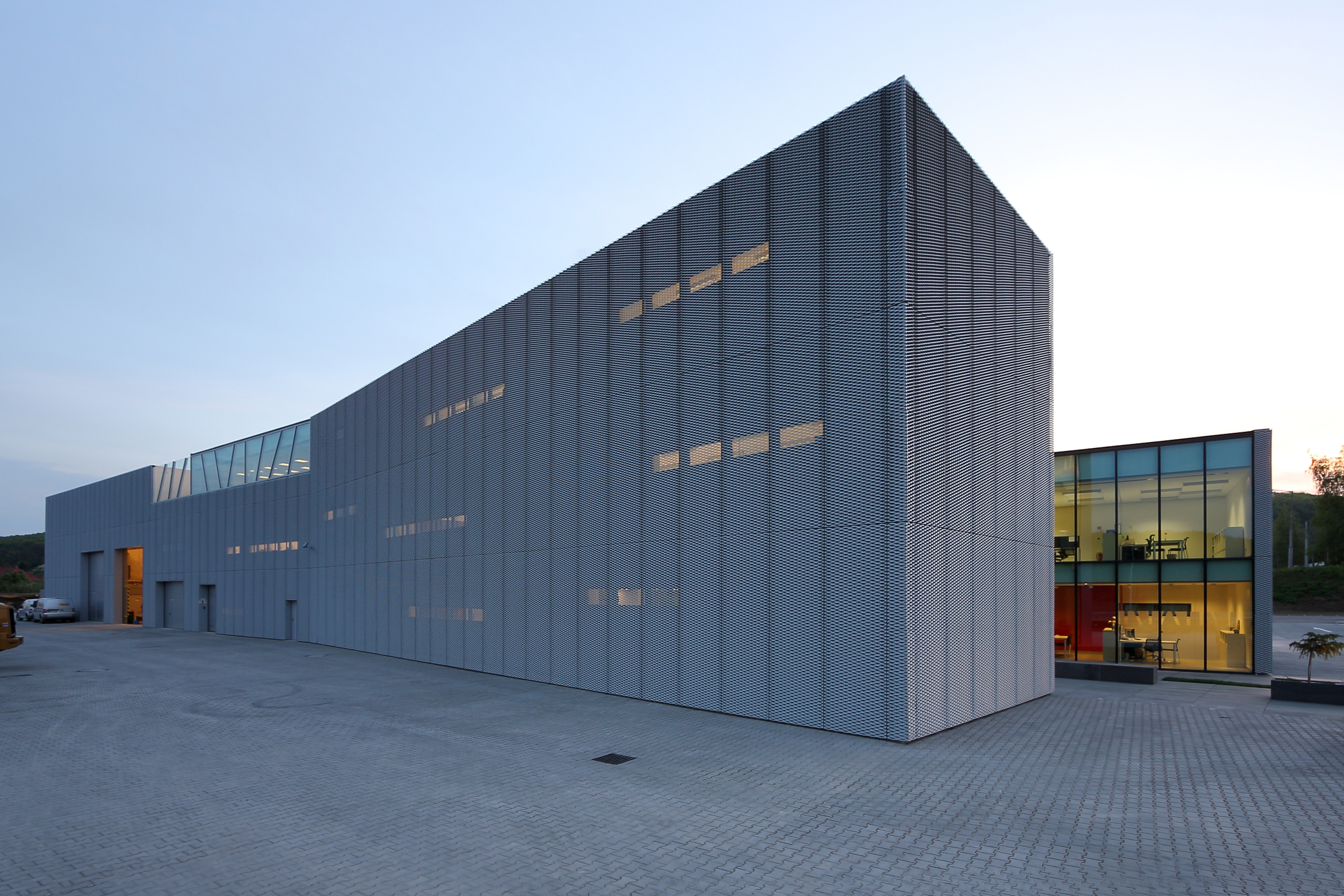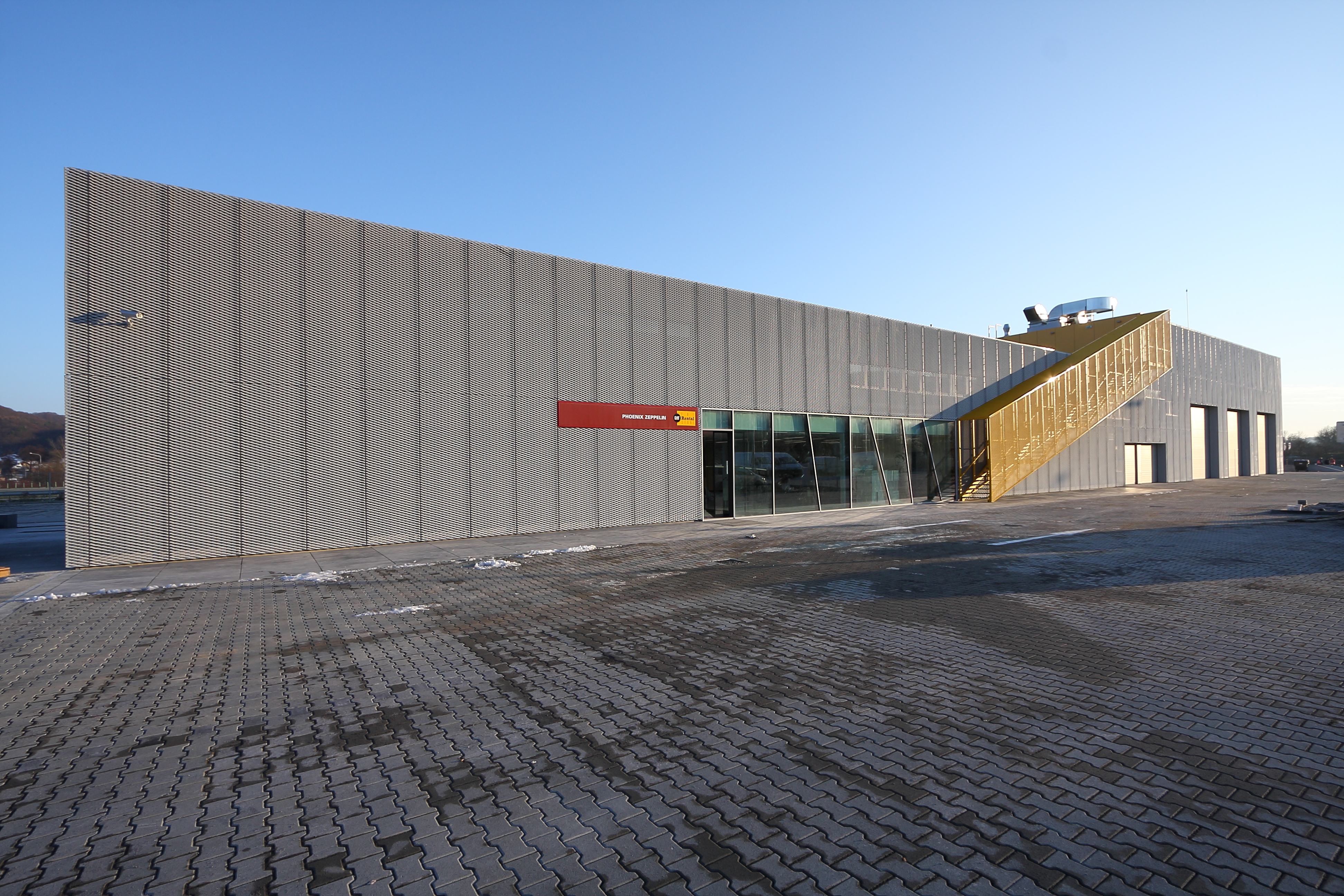 Máme radi jednoduché, čisté, skulpturálne stvárnené formy. Pri takomto zložitom objekte, kde je umiestnených množstvo rozdielnych technológií, otvorov, nasávaní, výduchov ..., sme potrebovali silný nástroj, ktorý by nám pomohol zjednotiť povrchy a umožnil relatívne slobodné formovanie hmôt. Pre Zeppelin sme navrhli ťahokovovú hliníkovú predsadenú fasádu. Keďže sme nenašli nič tapové, navrhli sme vlastné riešenie fasády. Tá budovu zjednocuje a slúži ako optický tieniaci systém. Je tiež neutrálnym pozadím pre vystavené stroje. Strieborný polopriehľadný plášť reaguje na zmeny počasia a osvetlenia. Výraz budovy sa v priebehu dňa i roka stále mení.