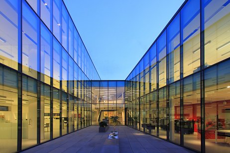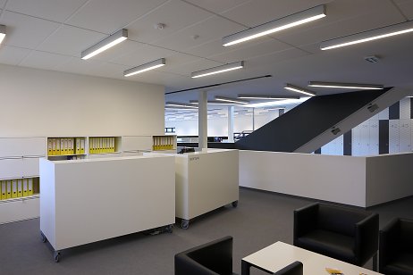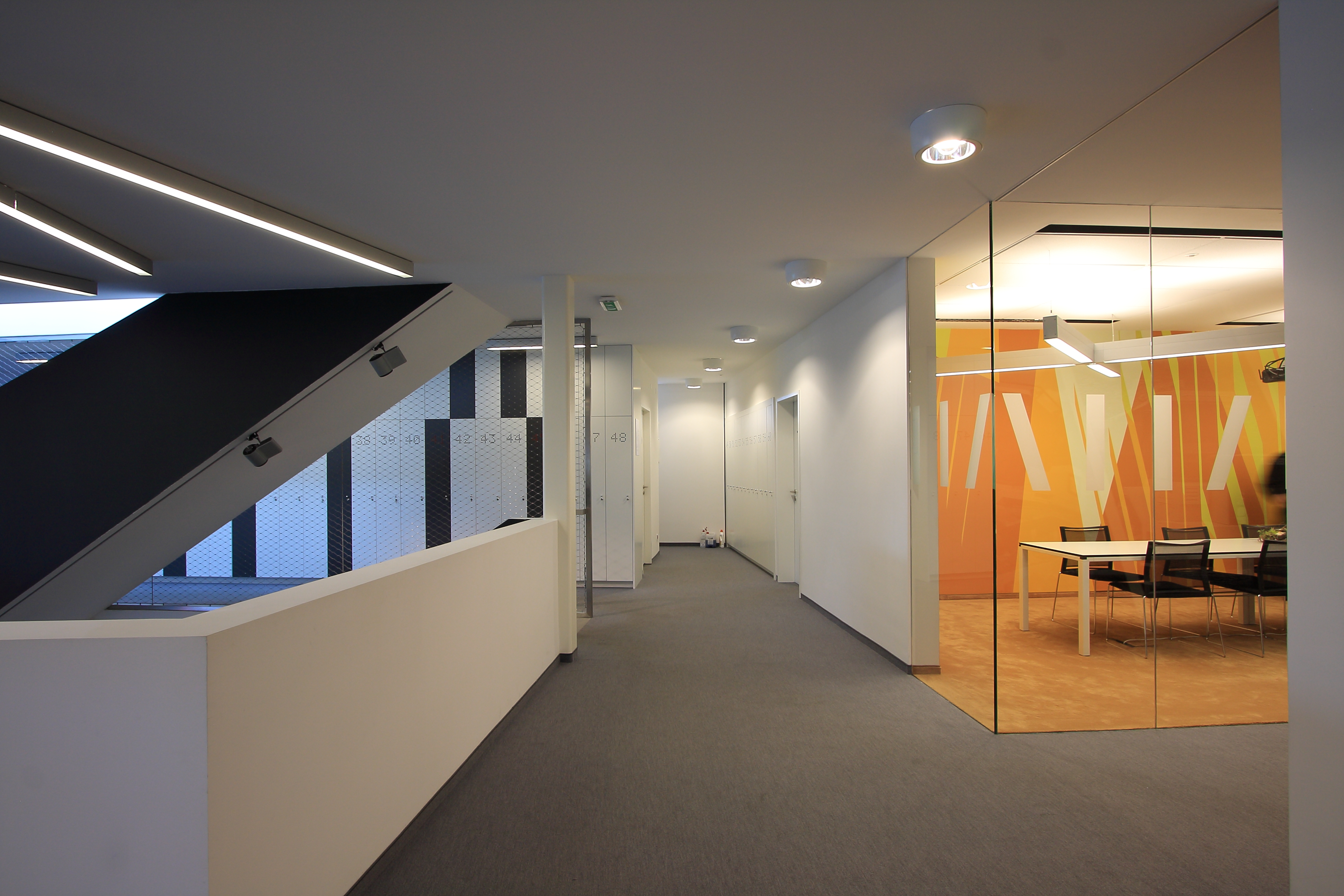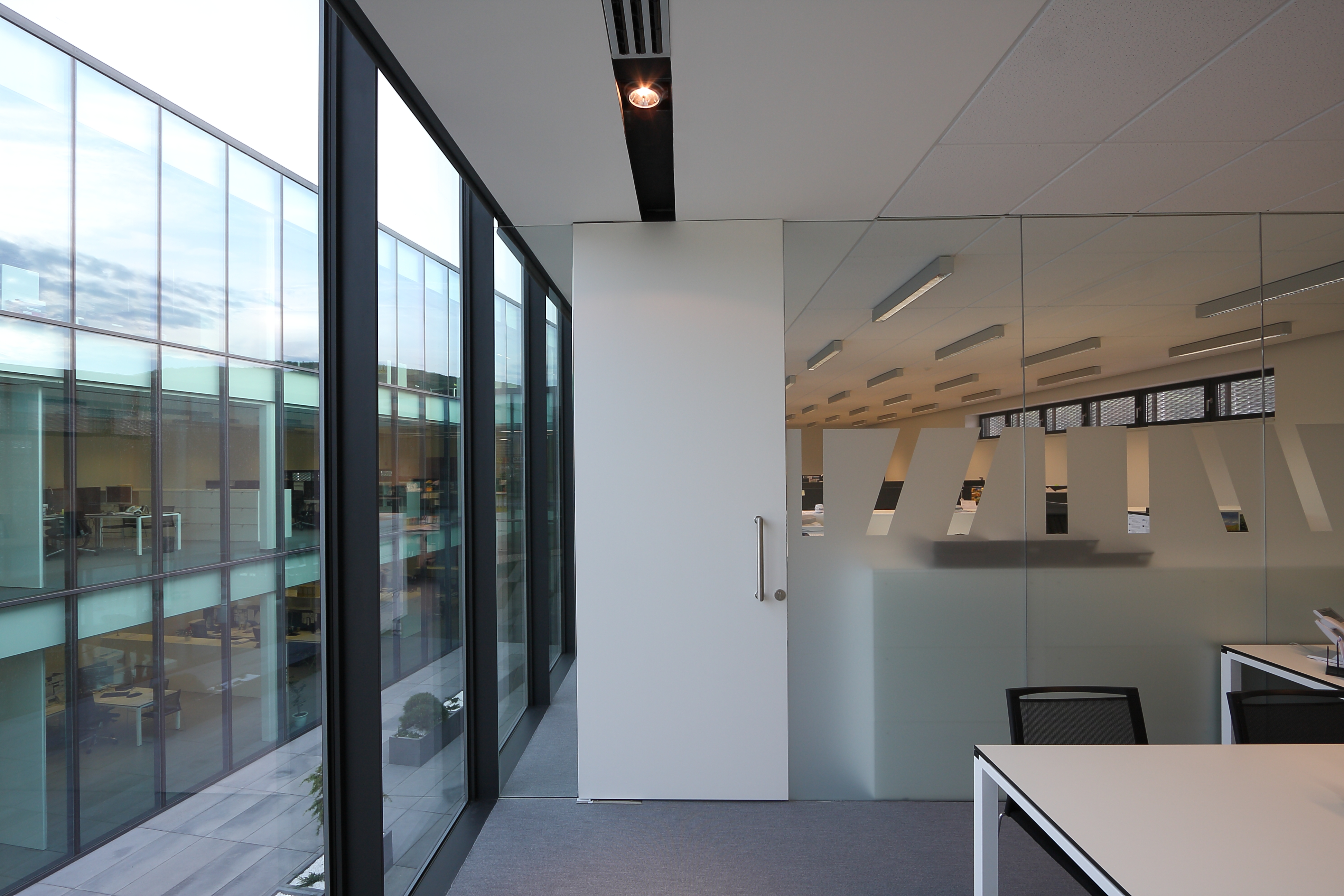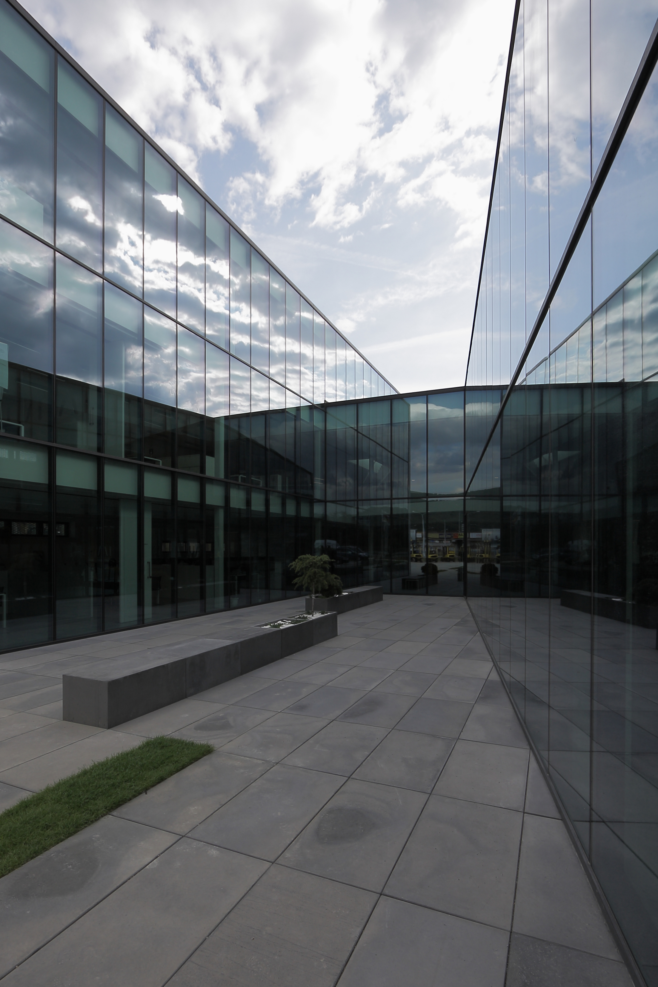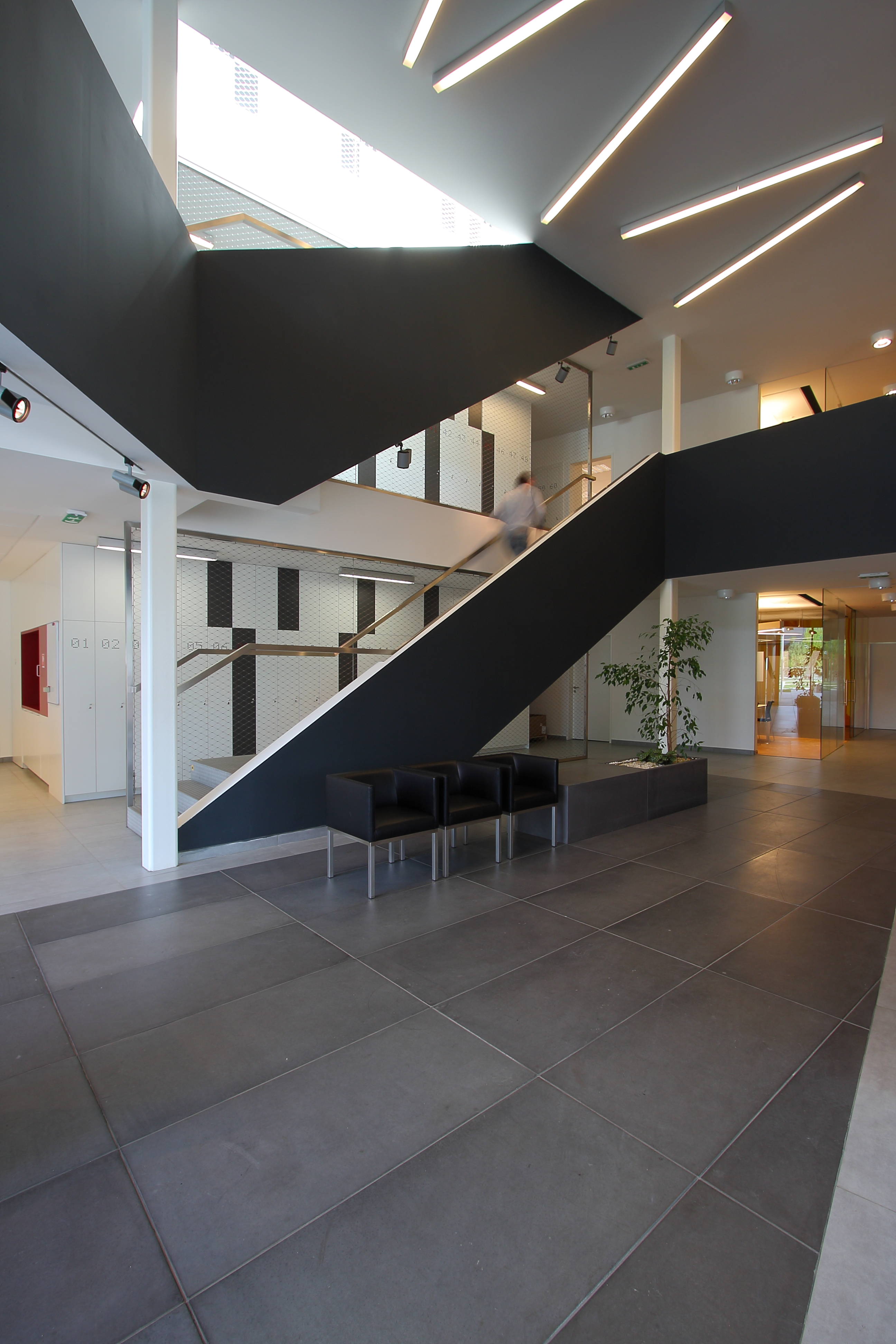 Ústredným spoločenským priestorom je átrium na severnej strane budovy. Táto koncepcia vychádza z nevyhnutnosti chrániť administratívnu prevádzku pred rušivým pôsobením priľahlej rýchlostnej cesty a v letných mesiacoch blokuje nízke ranné a večerné slnko - jednotlivé krídla stavby okolo átria bránia nežiadúcemu oslneniu pracovných plôch. Átrium vytvára nástup do budovy a opticky vnáša do jej interiéru prírodné prvky - zeleň, či vnímanie okolia. Vnútri budovy sa átrium mení na halu s pracoviskami prvého kontaktu, ktorú na poschodiach formou galérií obklopujú otvorené kancelárske pracoviská administratívnych oddelení. Firma je takto prehľadne zoskupená okolo priestorov átria a haly, kde sa pohybujú jej klienti.