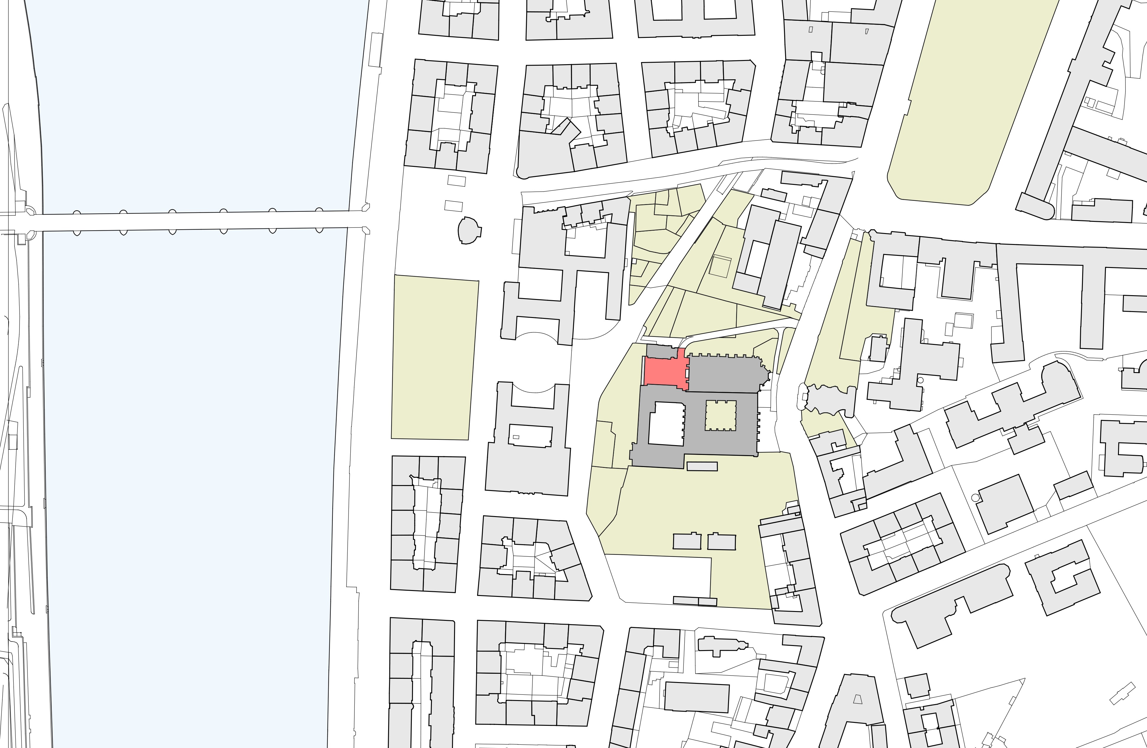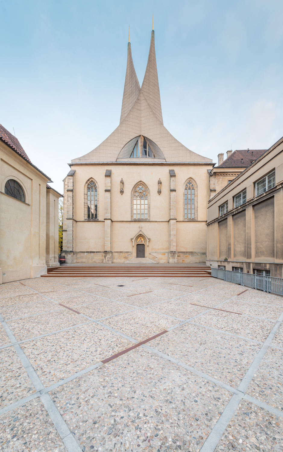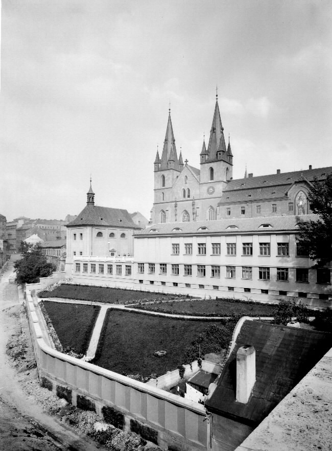 Kláštor vybudovaný na skalnatom pahorku bol súčasťou urbanistického plánu výstavby Nového Mesta pražského (V roku 1348 ho inicioval Karol IV.). Bol koncipovaný ako súčasť systému cirkevných stavieb, ktoré v pôdoryse mesta tvoria kríž. Súšasťou tohto areálu je aj zrekonštruované námestie situované medzi kaplnkou sv. Kozmu a Damiána, kostolom Panny Márie a krídlom dermatologického ústavu.
