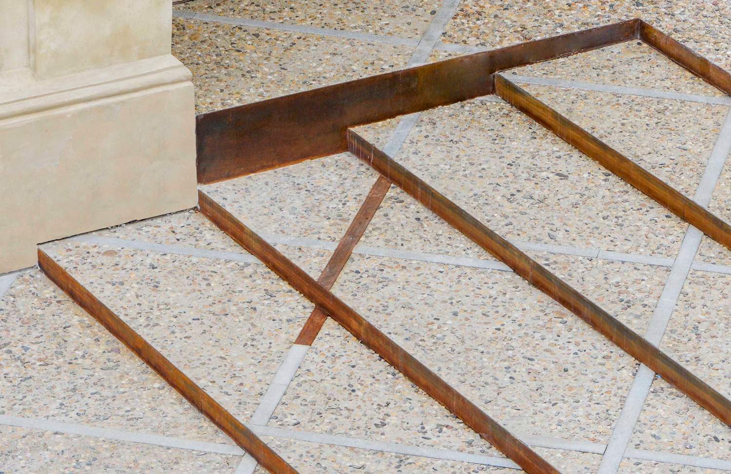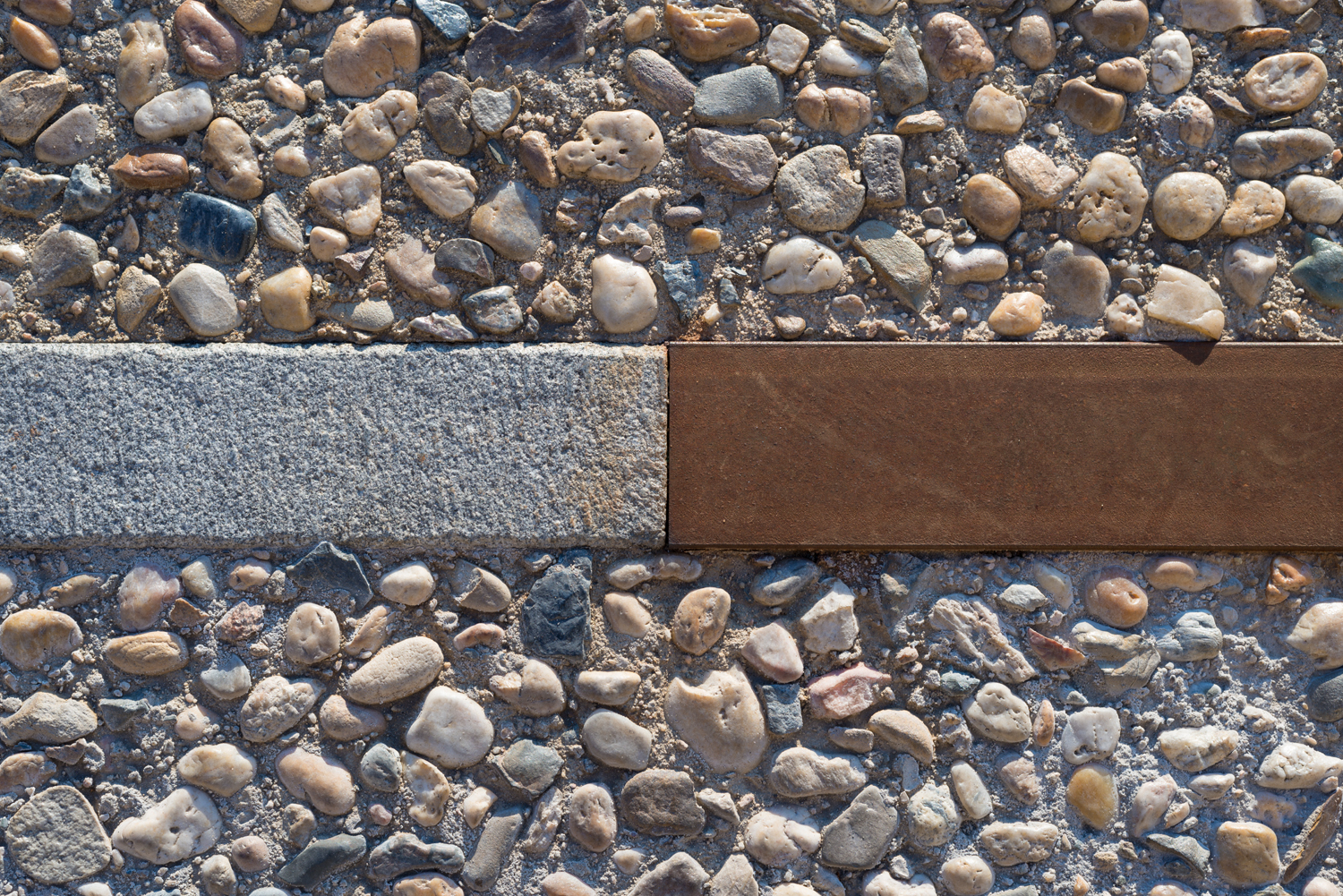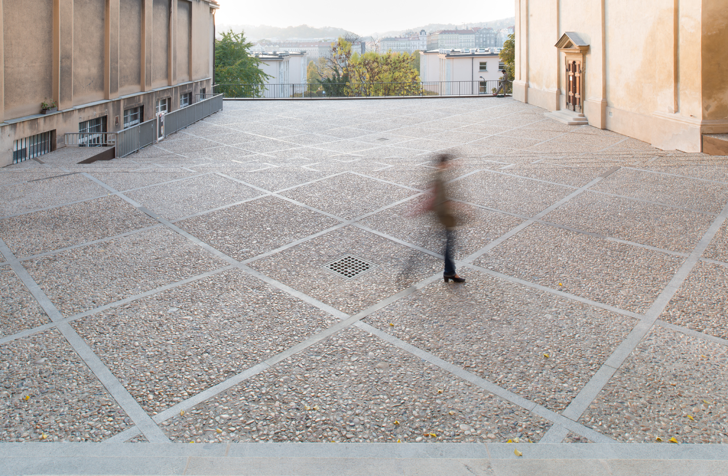 Zvláštna pozornosť bola od začiatku venovaná materiálovému riešeniu. Výplň štvorcov o veľkosti viedenskej siahy (1,89 m) mala byť od počiatočnej fázy návrhu tvorená okruhliakmi. V tomto sa architekti zhodli pri konzultáciách s Janom Holečkom z Nároného pamiatkového ústavu aj s Karlom Švejdom - správcom areálu kláštora. Plečnikova okruhliaková dlažba z Palácového dvora na Pražskom hrade, podobne ako dlažba záhrady Na valech (Pražský hrad), alebo okruhliakový „koberec“ pod fontánou na Jiřském námestí od ateliéru HŠH, boli tvorené ručným hladením okruhliakov do betónového podložia. Takúto pracnosť si architekti s ohľadom na obmedzený rozpočet nemohli dovoliť a preto prichádzal do úvahy vymývaný betón.