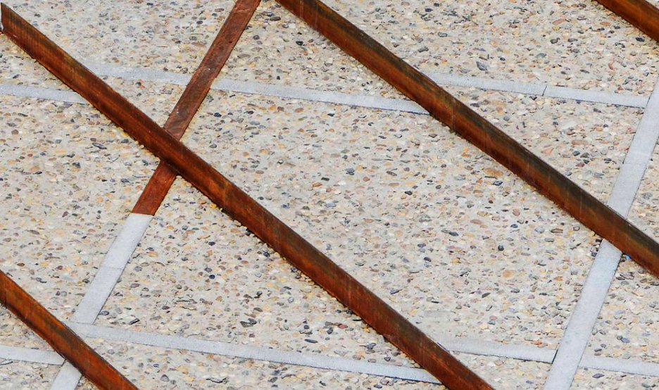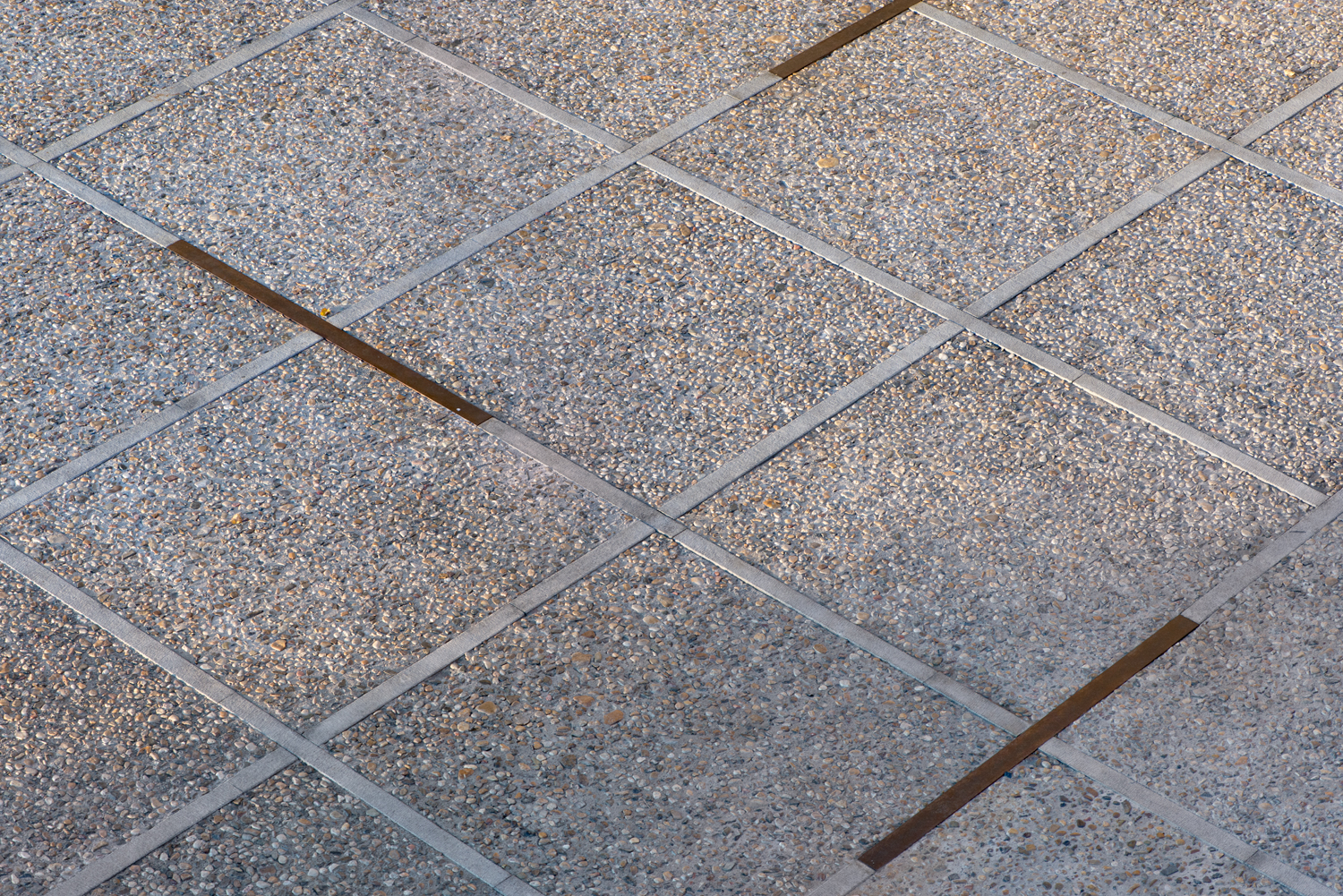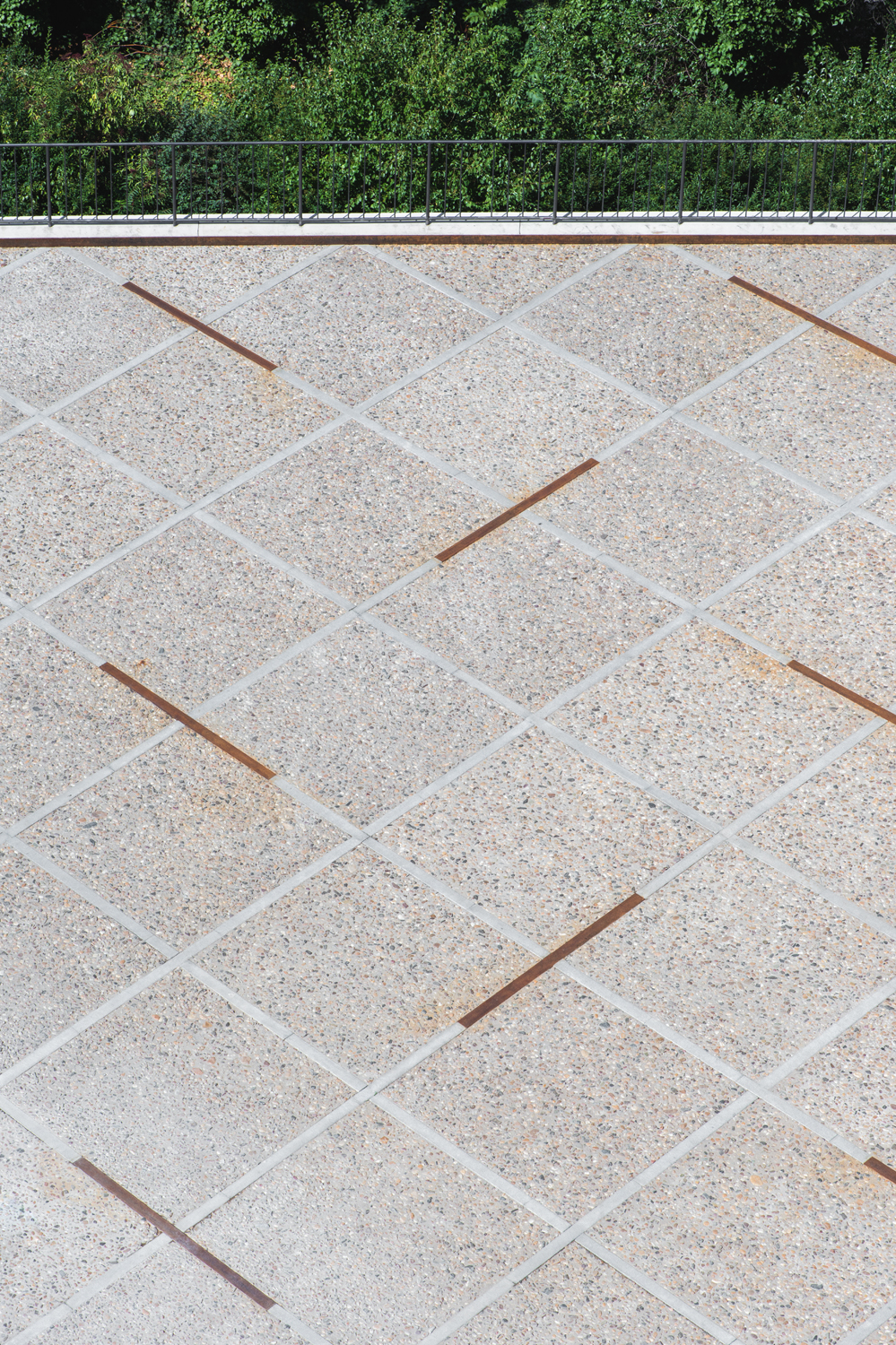 Technológia tryskaného betónu je bežne používaná na výrobu vymývanej dlažby, avšak v našich končinách je spájaná skôr s najslabšou formou architektúry v podobe okrášľujúcej parkovej alebo skôr chatársko-kutilskej produkcie. Firmy disponujúce výrobnou technológiou neboli schopné použiť iné plnivo ako najjemnejšie frakcie riečneho štrku, takže nezostávalo nič iné než jednu z firiem presvedčiť aby zabezpečila vybavenie a na niekoľkých vzorkách vyskúšala použitie väčšej frakcie. V dvoch realizačných etapách sa experiment podarilo dotiahnuť do konca.