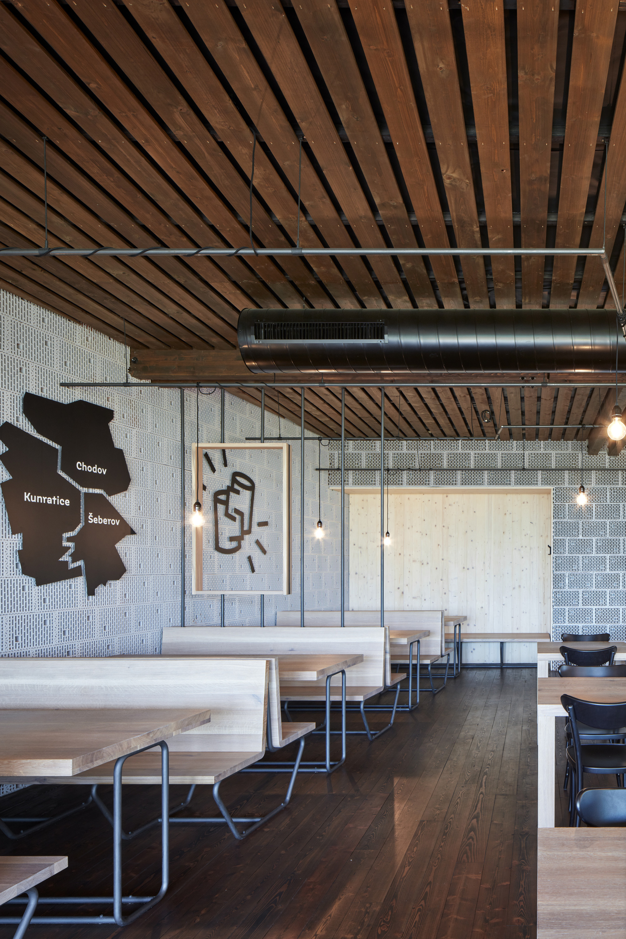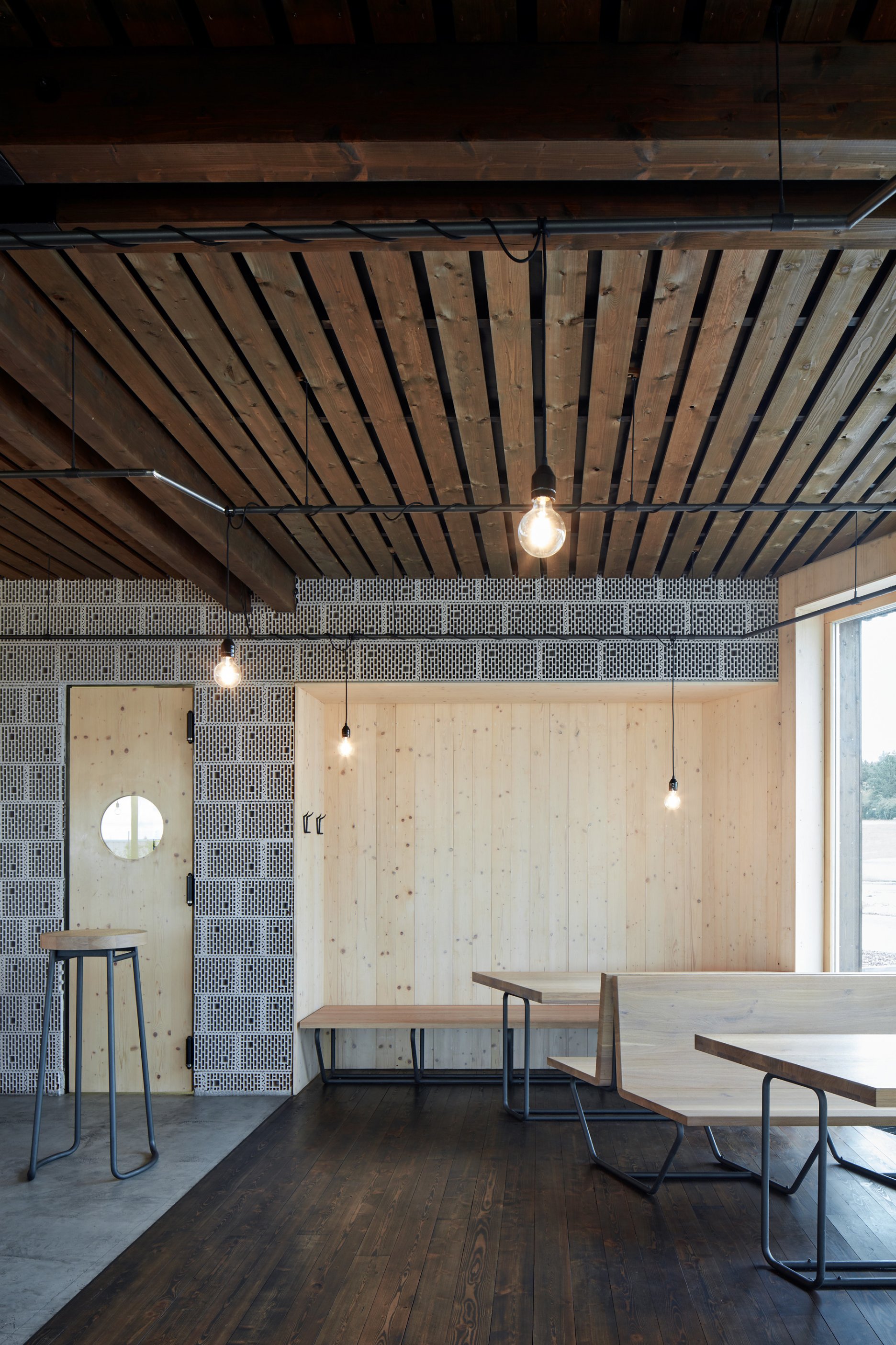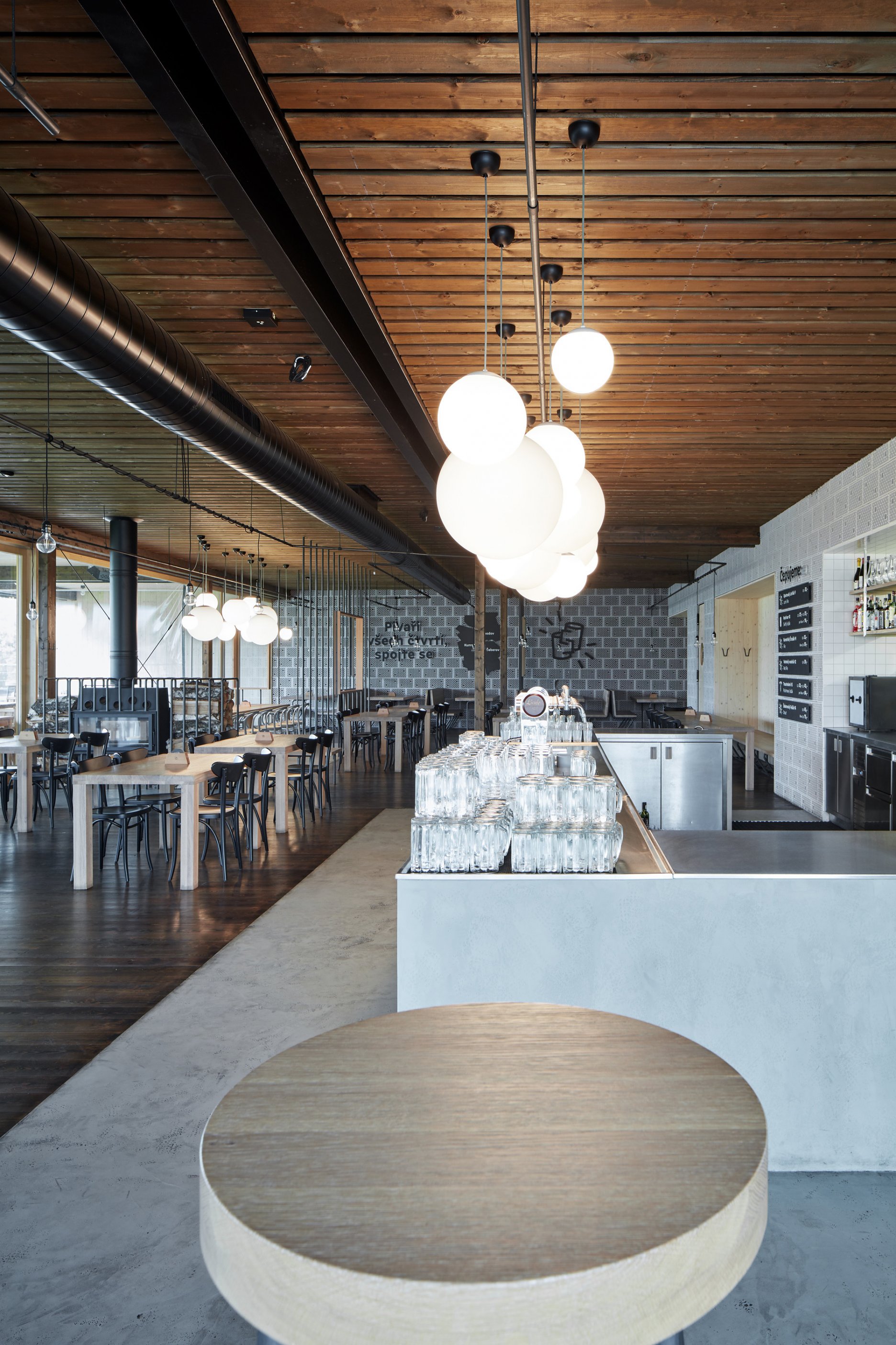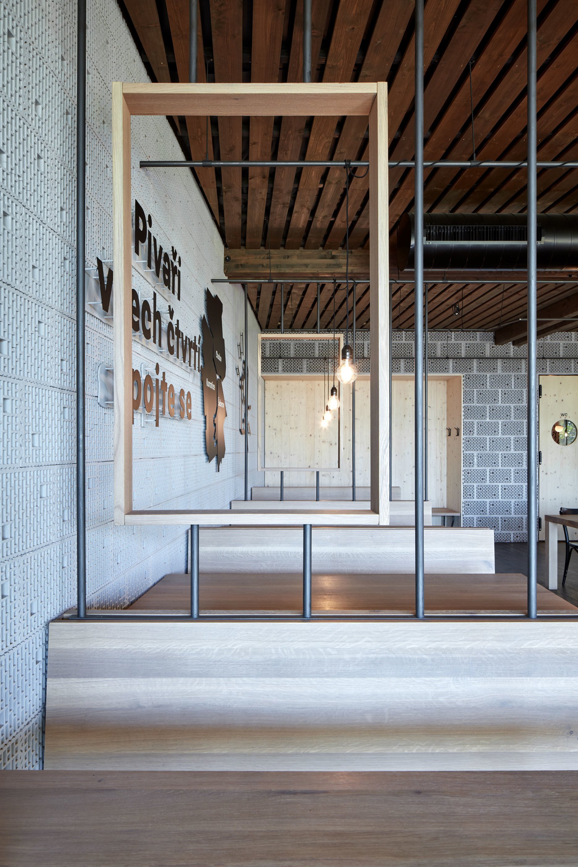 V interiéri je použitá kombinácia smrekových dosiek na podlahe, strope a jednej zo stien. Na sivo natreté tehly sú otočené dutinkami do interiéru, v exponovaných miestach architekti zvolili betónovú stierku. Čierne oceľové tyče tvoria nohy lavíc a stolov, slúžia ako nosné prvky pre uchytenie osvetlenia pod stropom a v neposlednom rade fungujú ako kostra deliacich konštrukcií. Ako príklad môže slúžiť konštrukcia krbu a steny salóniku, ktorý pojme 16 ľudí.