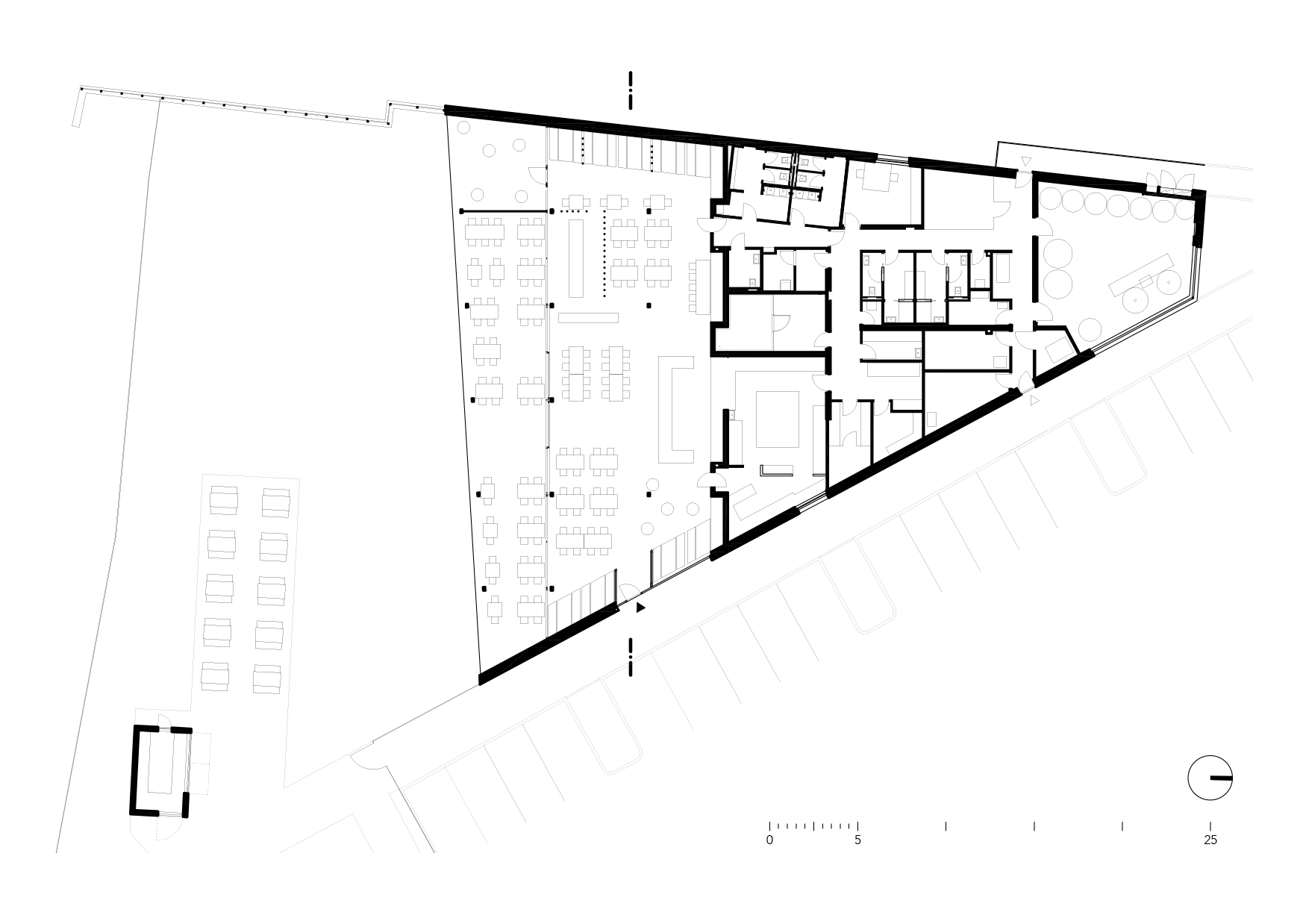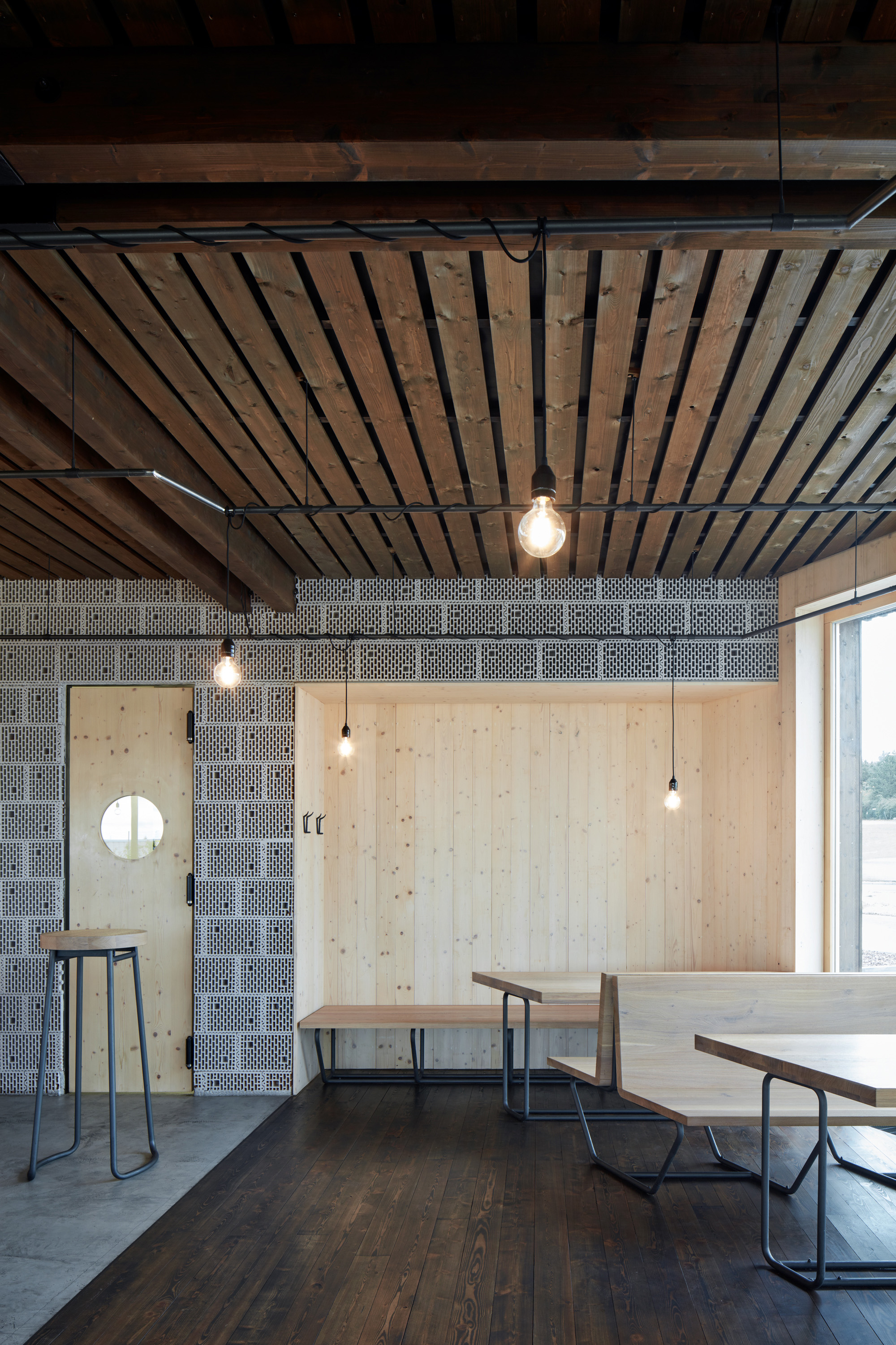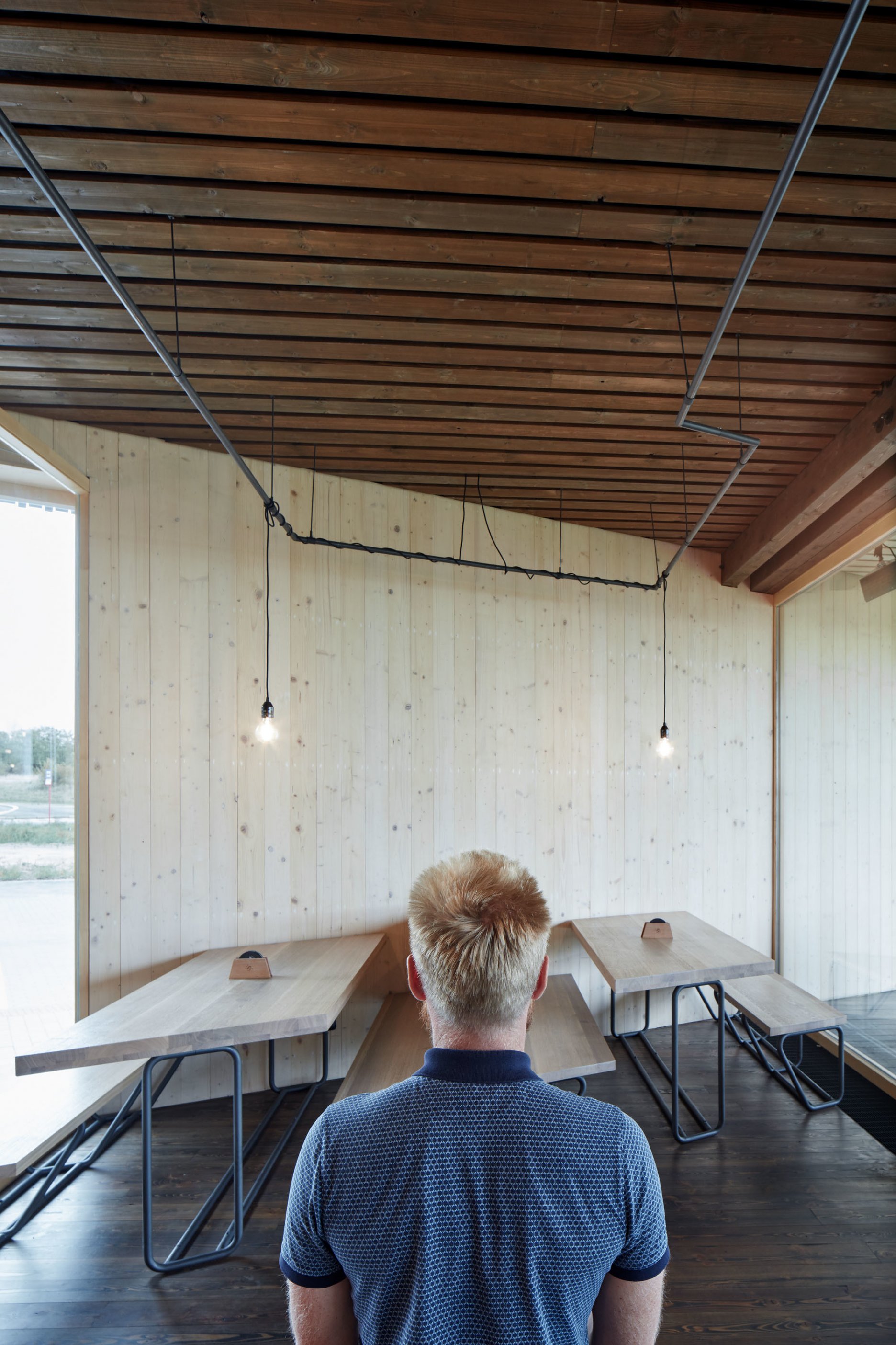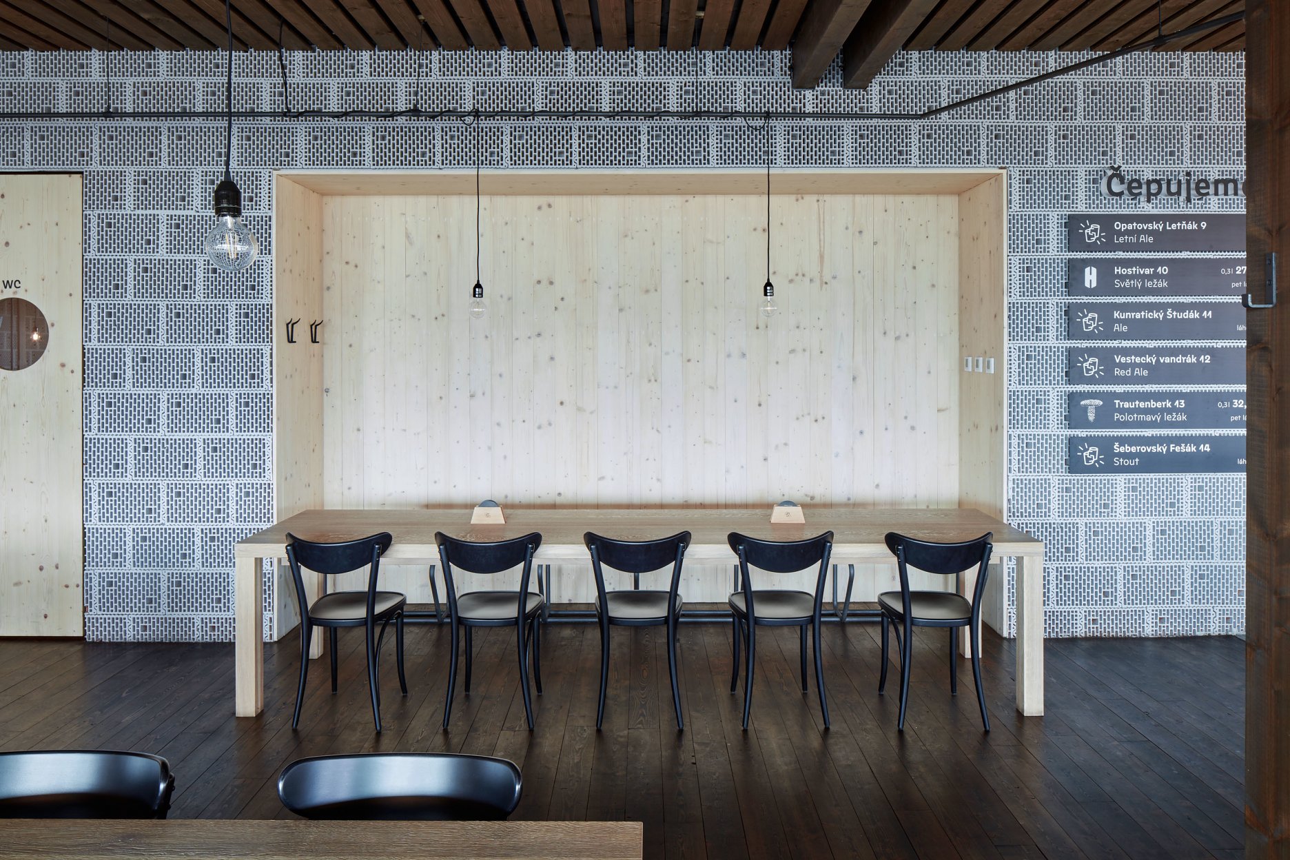 V interiéri je použitá kombinácia smrekových dosiek na podlahe, strope a jednej zo stien. Na sivo natreté tehly sú otočené dutinkami do interiéru, v exponovaných miestach architekti zvolili betónovú stierku. Čierne oceľové tyče tvoria nohy lavíc a stolov, slúžia ako nosné prvky pre uchytenie osvetlenia pod stropom a v neposlednom rade fungujú ako kostra deliacich konštrukcií. Ako príklad môže slúžiť konštrukcia krbu a steny salóniku, ktorý pojme 16 ľudí.