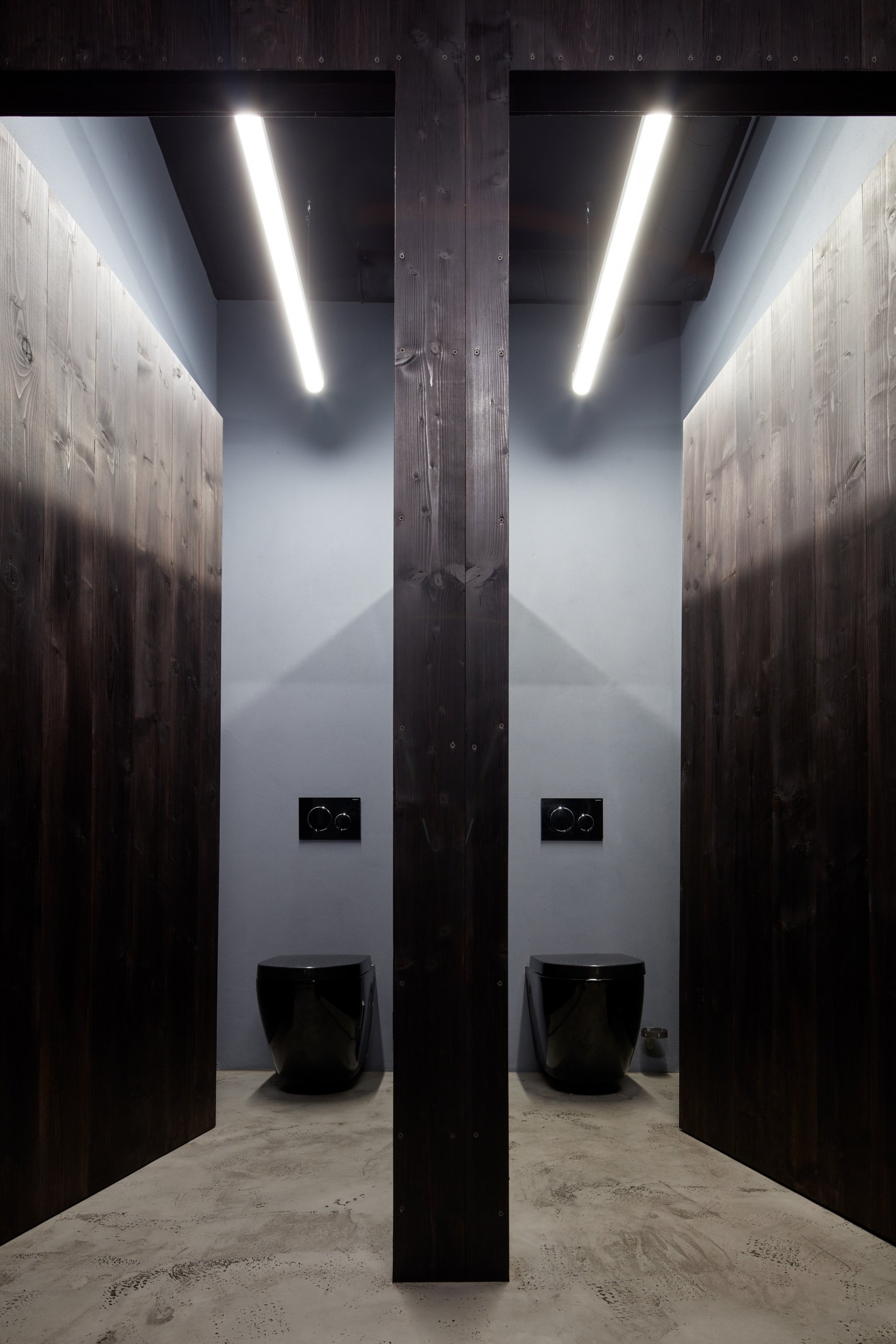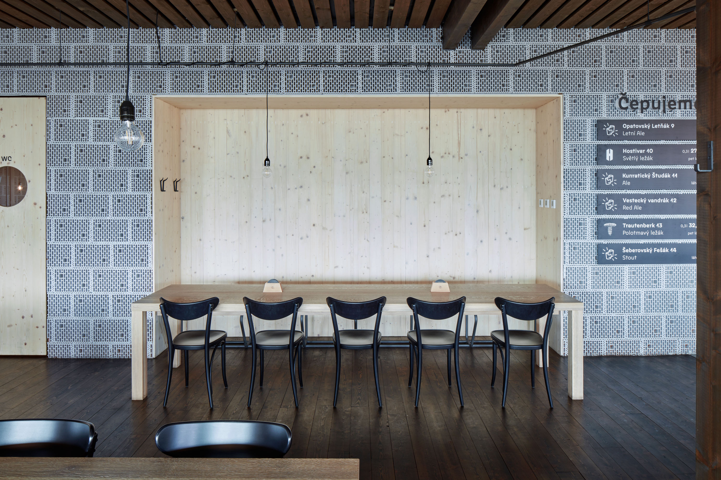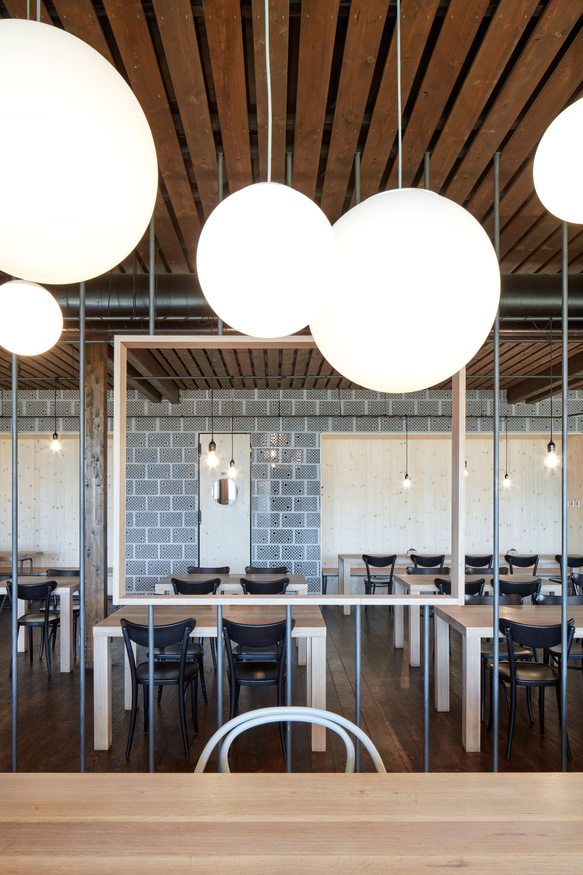 Ďalším výrazným prvkom interiéru je betónový výčap s priehľadom do kuchyne a skupiny guľových svietidiel, ktoré vizuálne určujú dôležité miesta v reštaurácii.