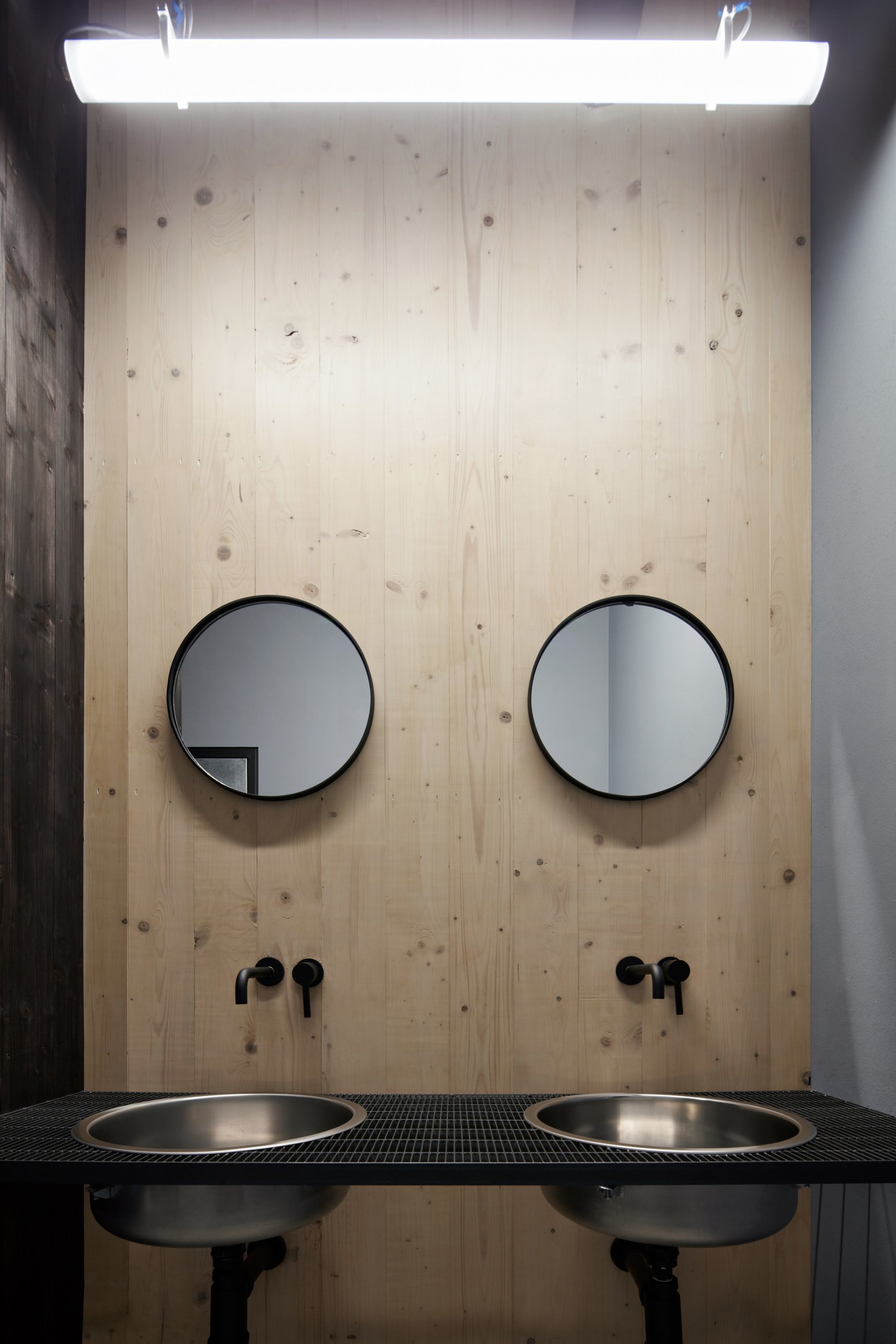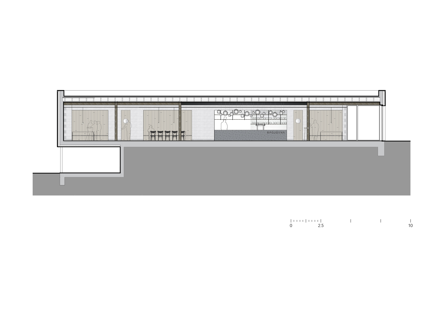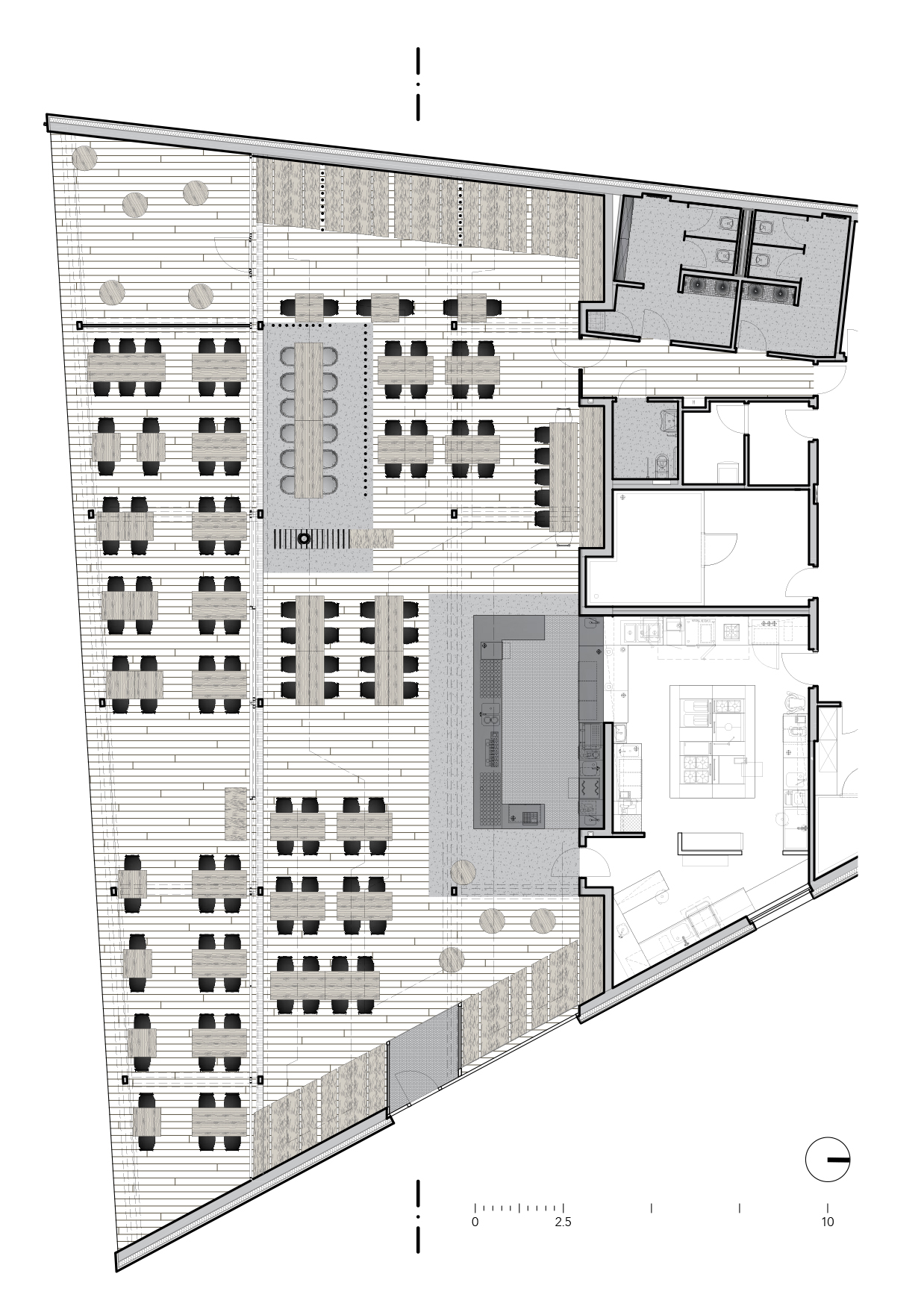 Ďalším výrazným prvkom interiéru je betónový výčap s priehľadom do kuchyne a skupiny guľových svietidiel, ktoré vizuálne určujú dôležité miesta v reštaurácii.