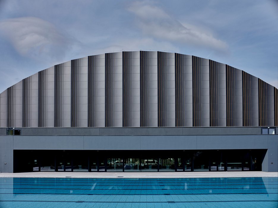 Stavbu definujú dva priestorové a konštrukčné celky - klenutá hala súťažného bazéna a obslužné plochy v tvare písmena L. Oceľobetónové konštrukcie suterénu a prízemia prestrešujú veľkorozponové oblúkové oceľové nosníky haly a skladby plochej strechy, zvolené podľa účelu priestoru. Monolitické objemy fasád zjemňujú transparentné výplne a plastický raster výplní štítov. V nočných hodinách zvýrazňuje relief vertikálne líniové osvetlenie. Časť plochej strechy pokrývajú fotovoltické panely.